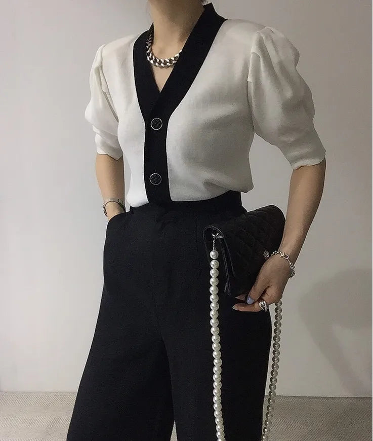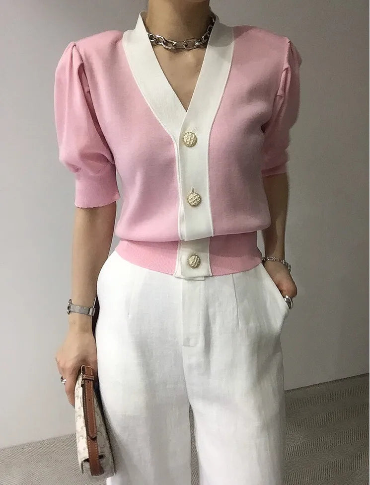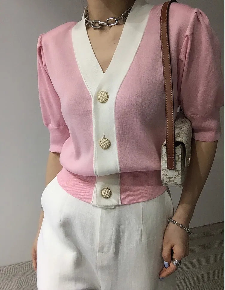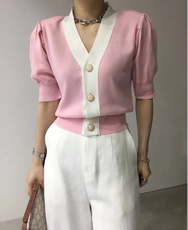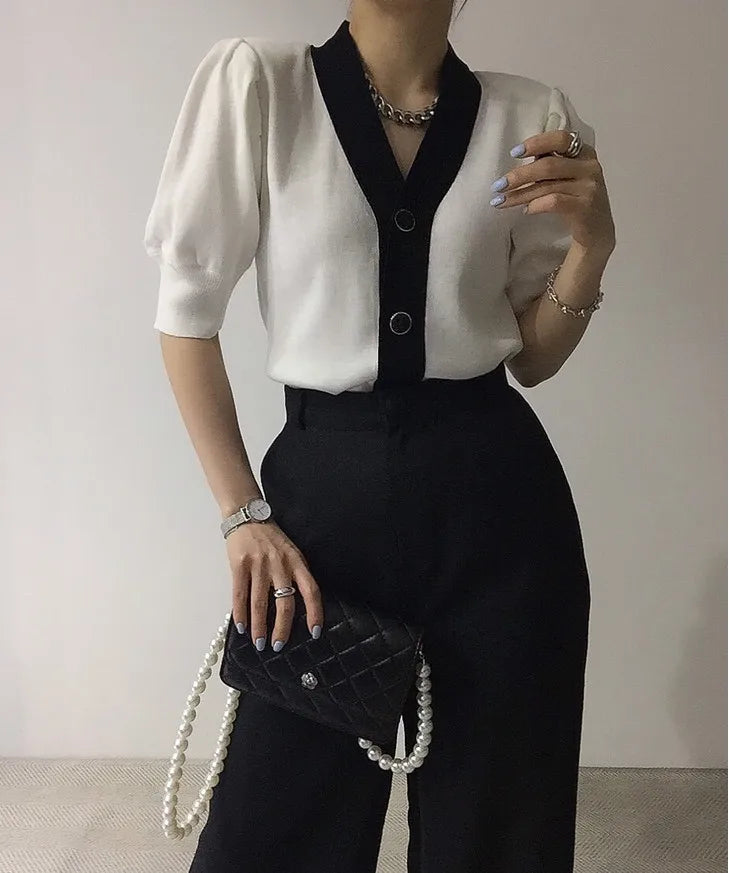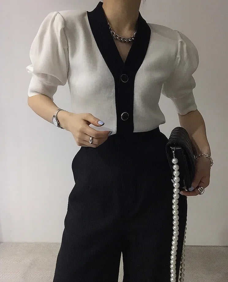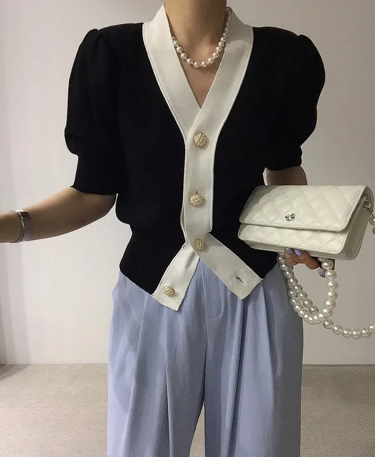 Hnewly Summer Elegant Puff Short Sleeve Cardigan Office Lady 2023 Korean Contrast Single Breasted V-Neck Casual All-Match Knitted Tops