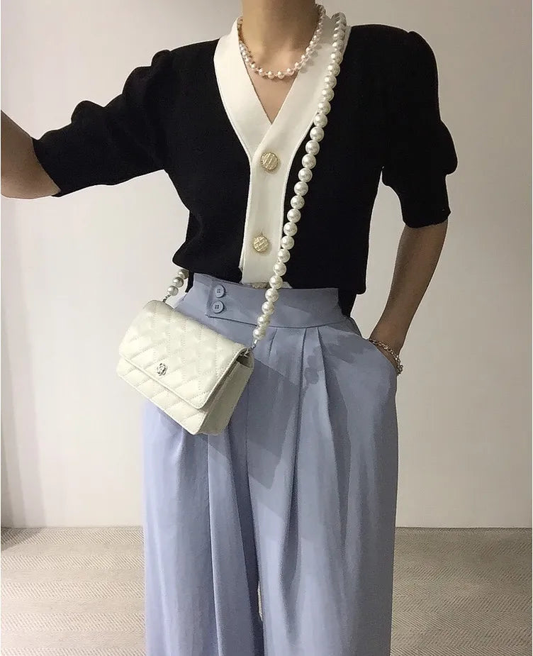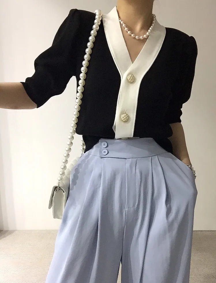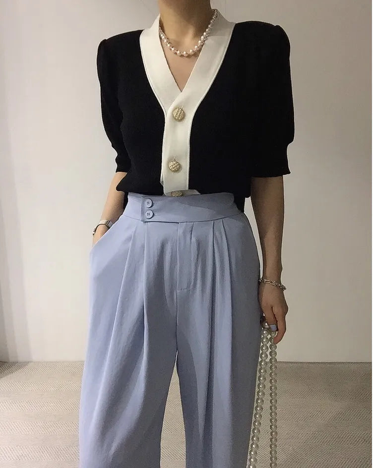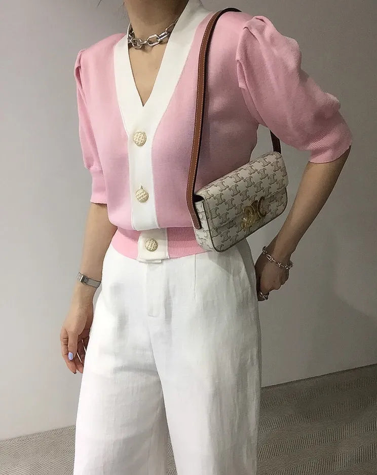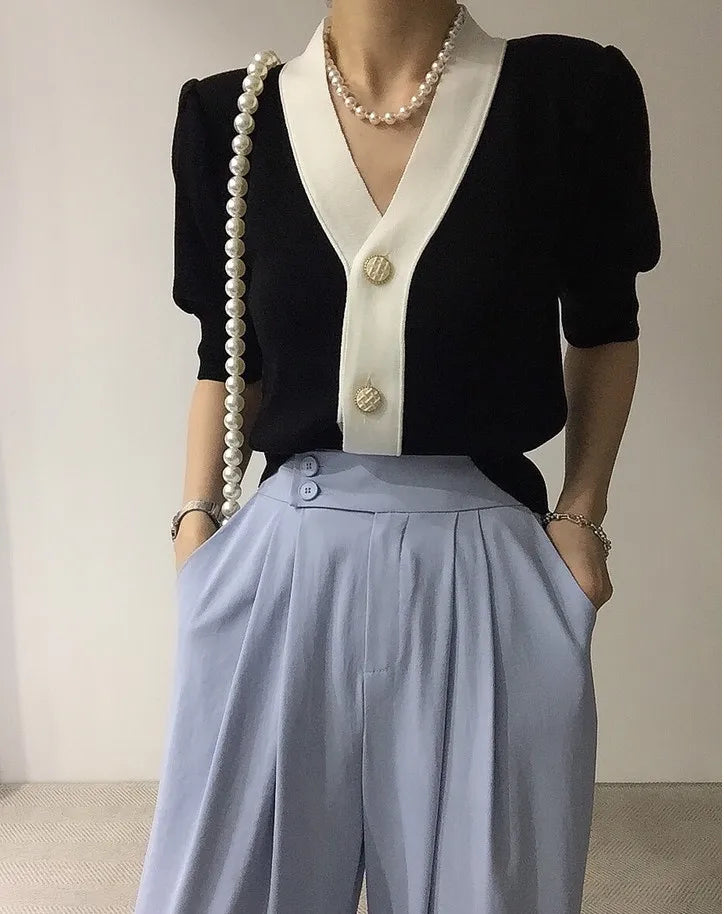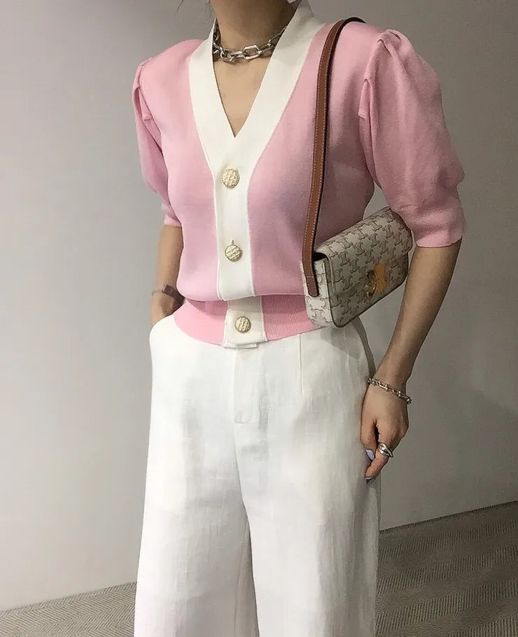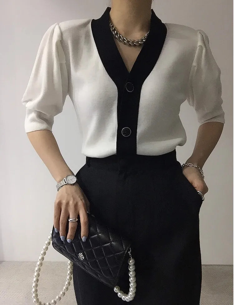 Hnewly Summer Elegant Puff Short Sleeve Cardigan Office Lady 2023 Korean Contrast Single Breasted V-Neck Casual All-Match Knitted Tops