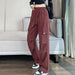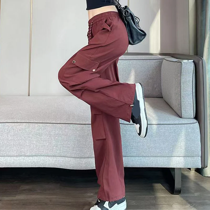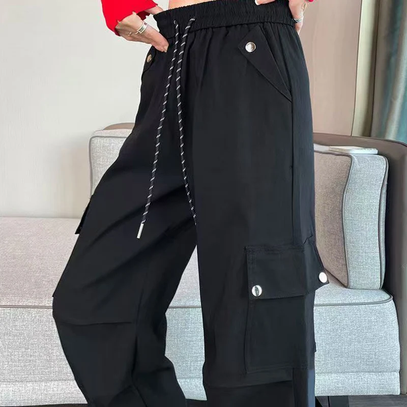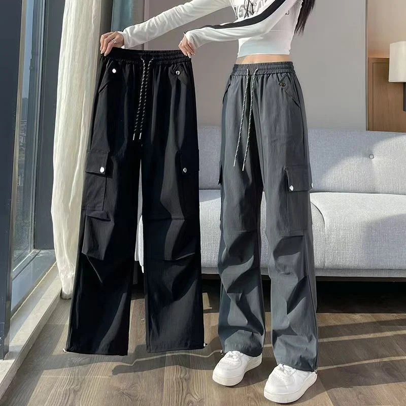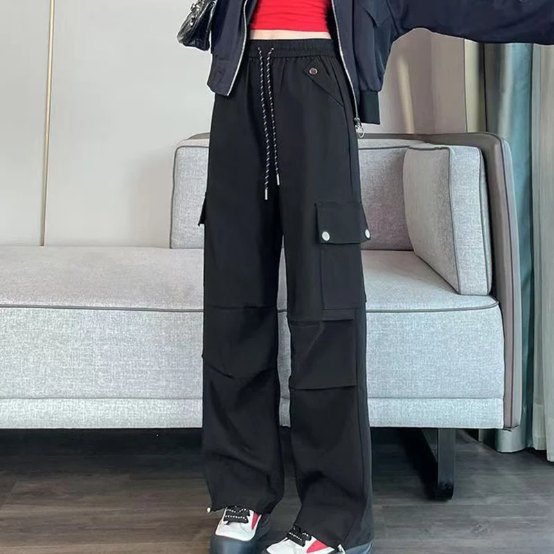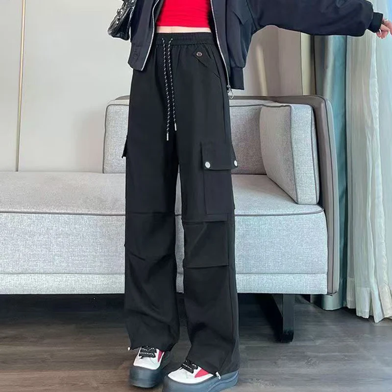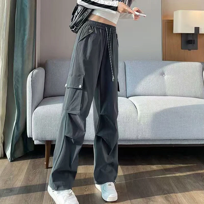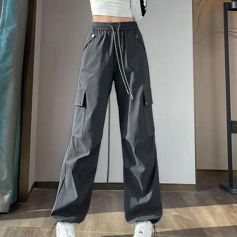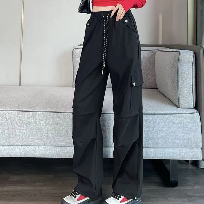 Hnewly Summer High Waist Solid Cargo Pants Women Y2K Drawstring Pocket Straight Pants Woman Fashion Simple Wide-Leg Trousers Mujer