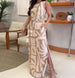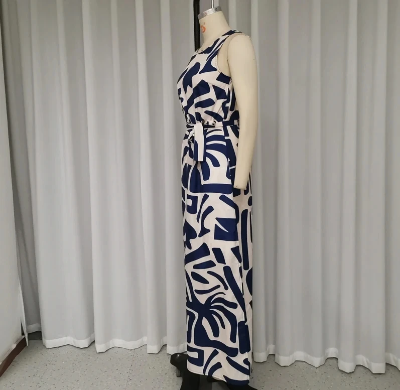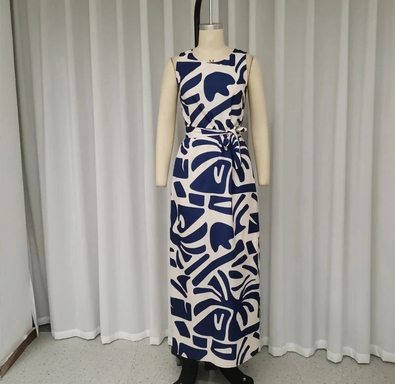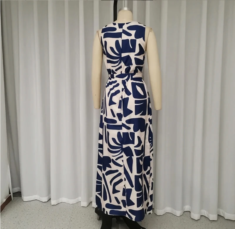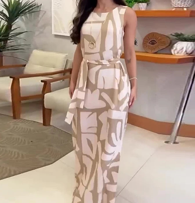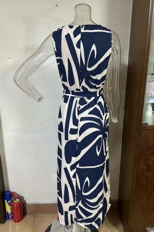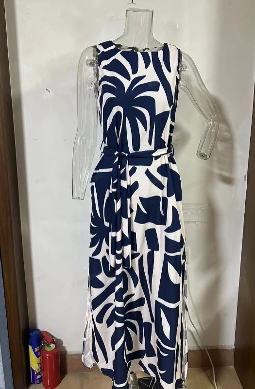 Hnewly Summer New Fashion for Women Mid Waist Elegant Style Fashionable Printed Sleeveless Slit Tie Up Waist Style Dress