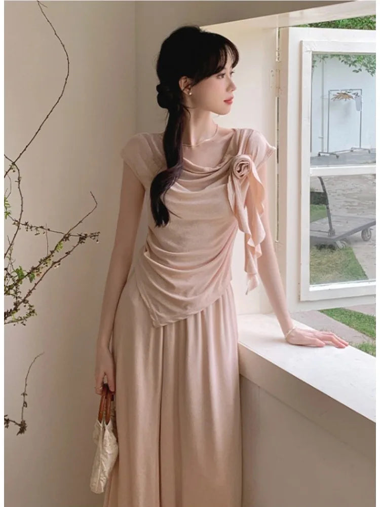 Hnewly Summer New Flowers Korean Fashion Irregular T-Shirt Top Women's French Elegant Pastoral Casual Long Skirt Two Piece Set