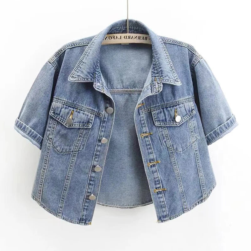 Hnewly Summer Short Sleeved Denim Jacket For Women 2025 Loose Single Breasted Turn Down Collar Loose Coat Korean Fashion Crop Top
