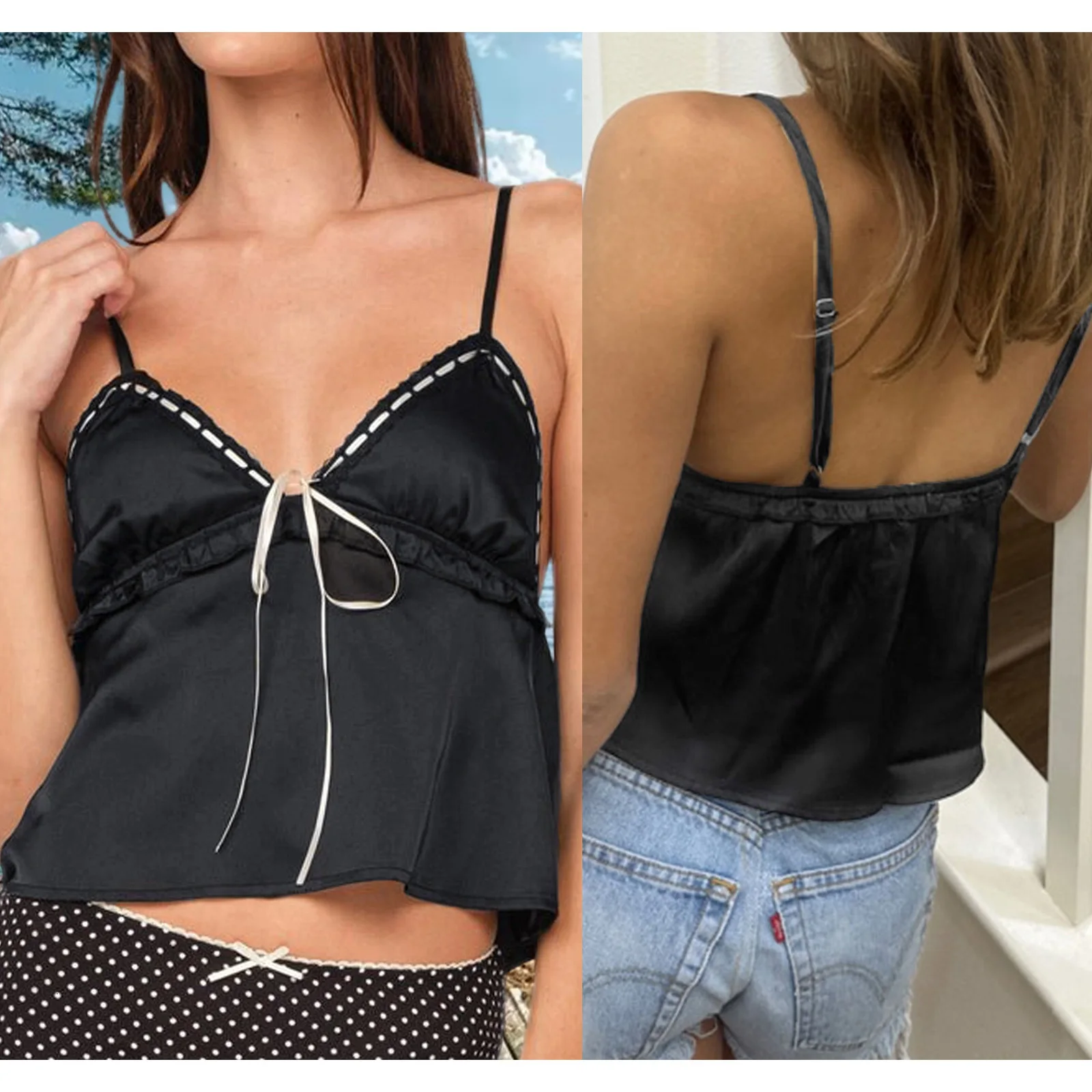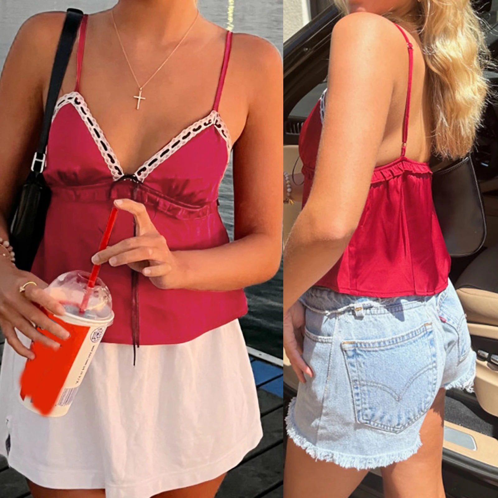 Hnewly Summer Tank Tops y2k Women Deep V Neck Ruffle Trim Spaghetti Strap Sleeveless Camisole Vest 2000s Clothing Streetwear