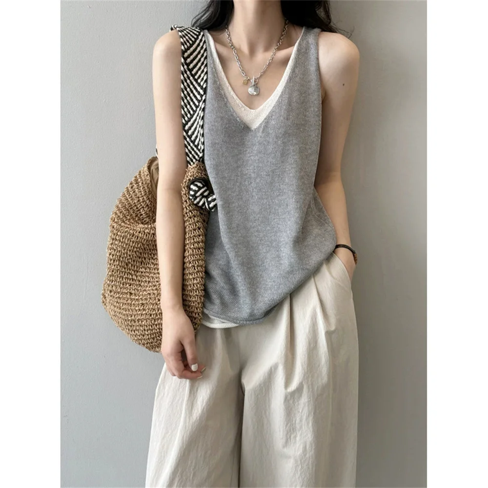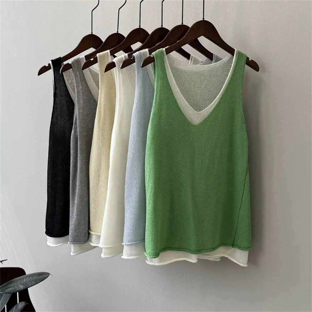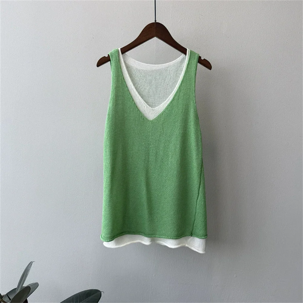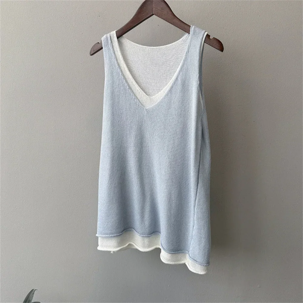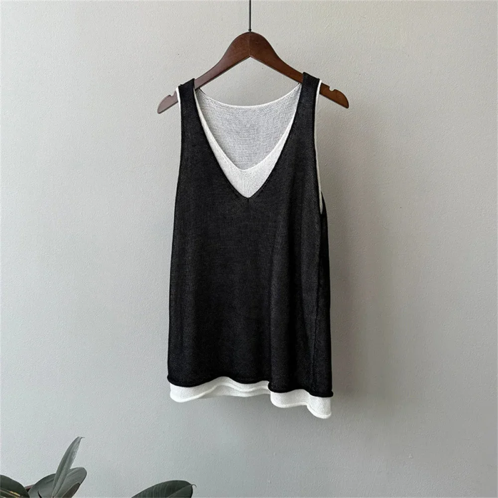 Hnewly Summer V-neck Shoulder Top Women Clothing Sweater Vest Pullover Fashion New Fake Two-piece Knit Tank Tops for Women Tops