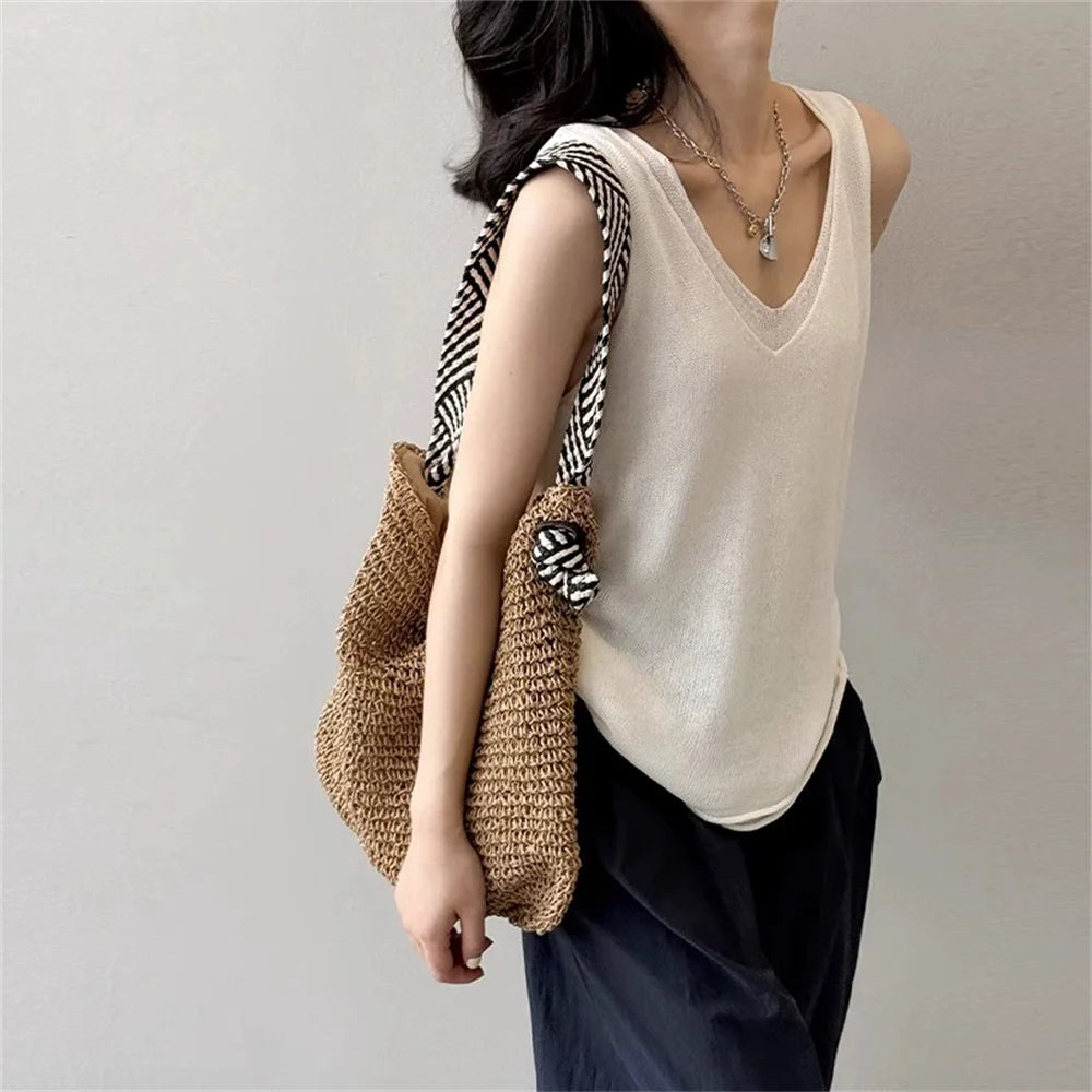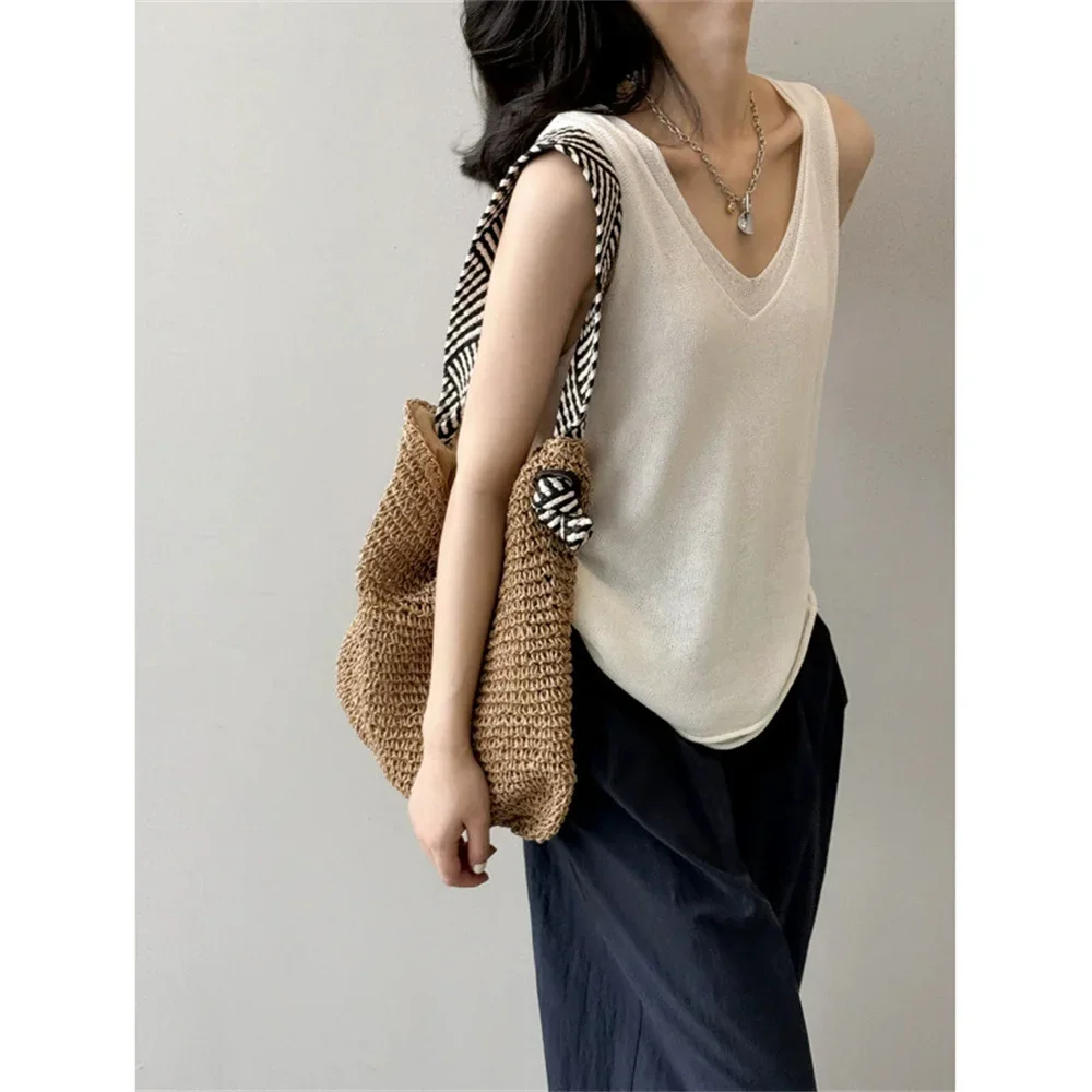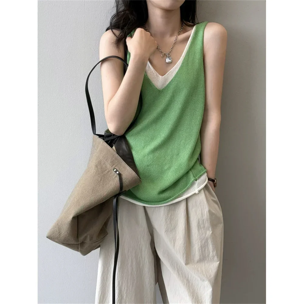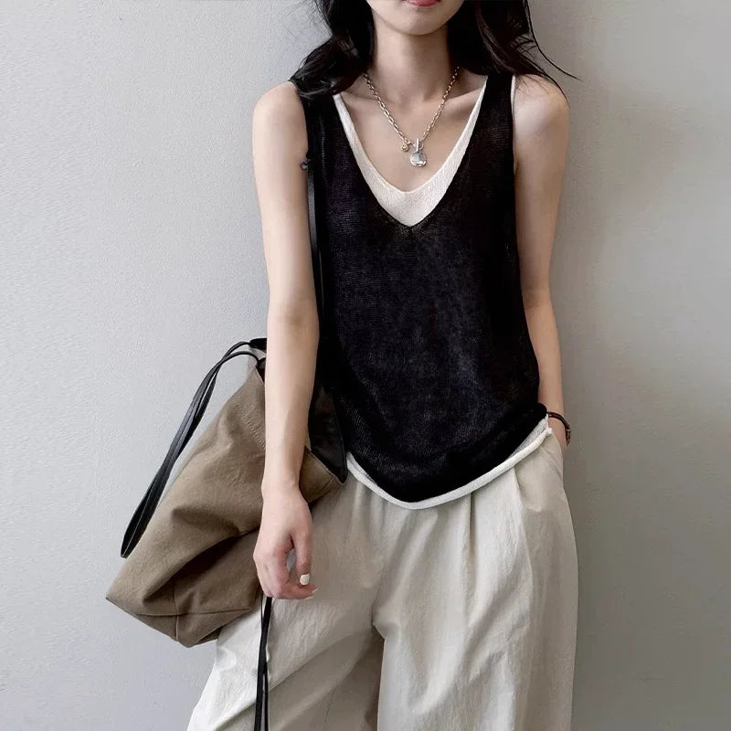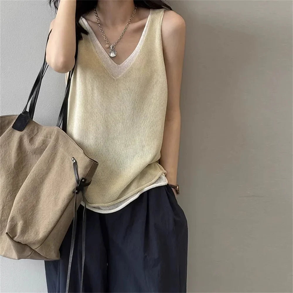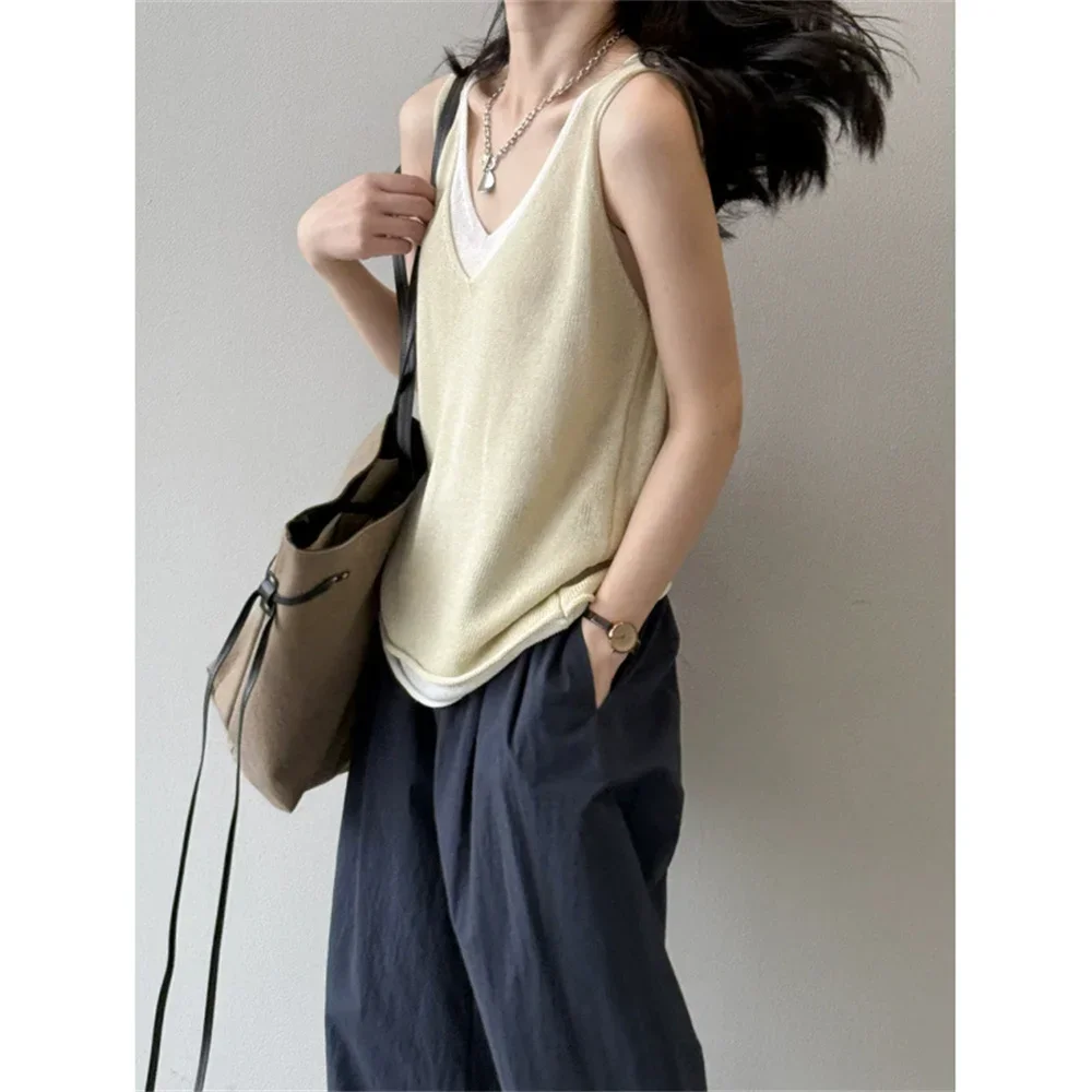 Hnewly Summer V-neck Shoulder Top Women Clothing Sweater Vest Pullover Fashion New Fake Two-piece Knit Tank Tops for Women Tops
