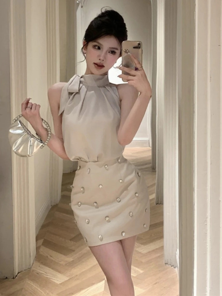 Hnewly Summer Women 2 Piece Skirt Sets Sexy Summer Strapless Bandage Sleeveless Blouses Office Lady Mini Skirts Korean Chic Y2k Suit
