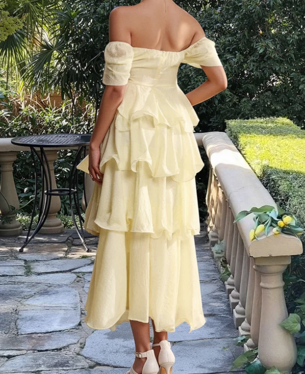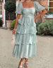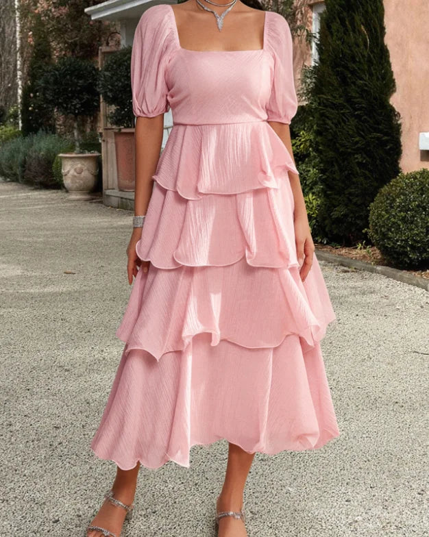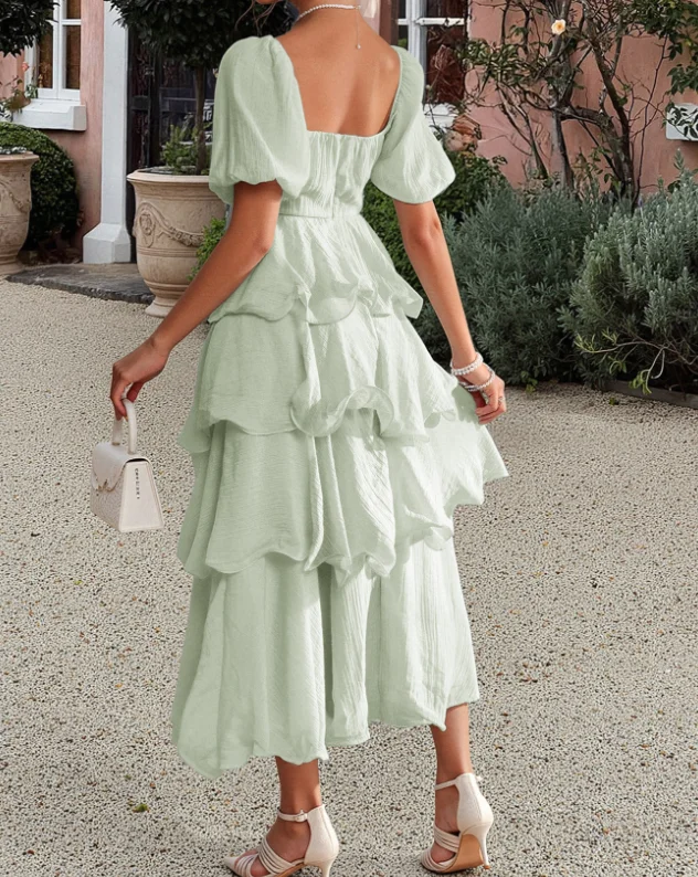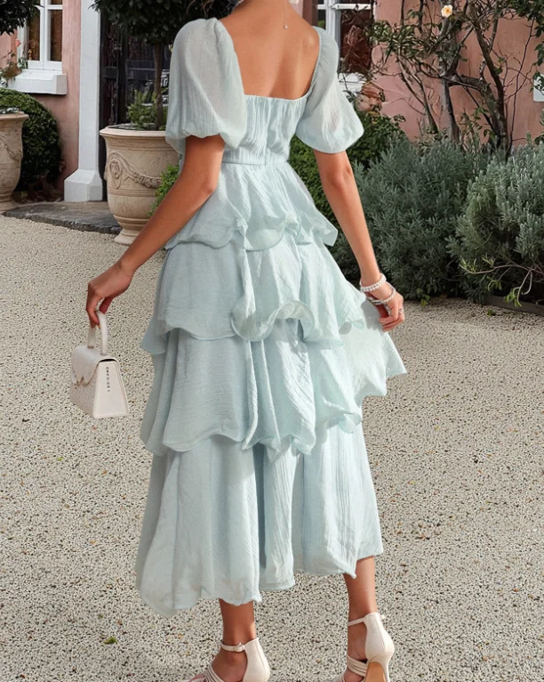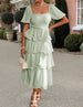Hnewly Summer Women's Square Neck Tiered Ruffle Midi Dress Short Puff Sleeve Design Elegant Casual Outfit Cake Skirt