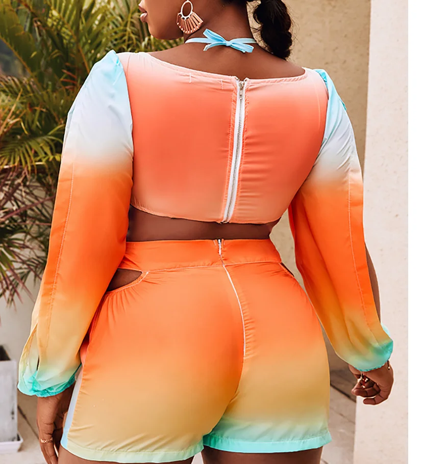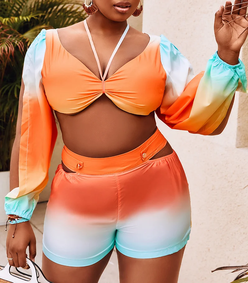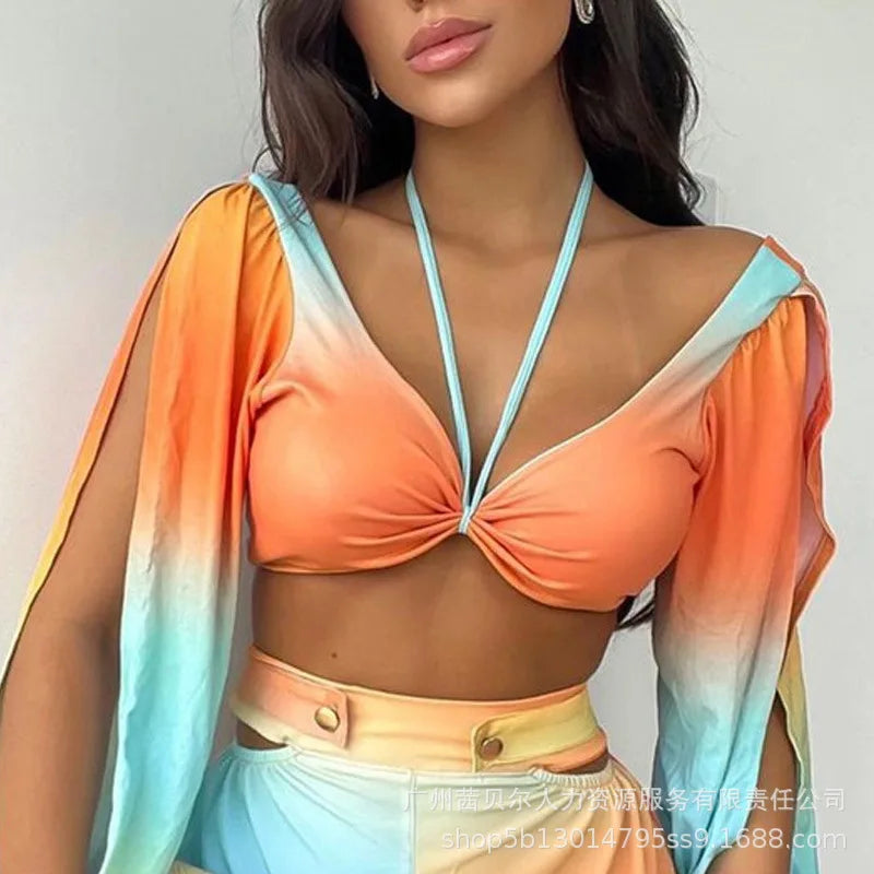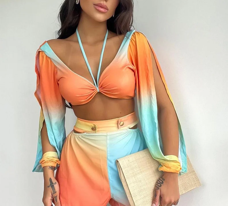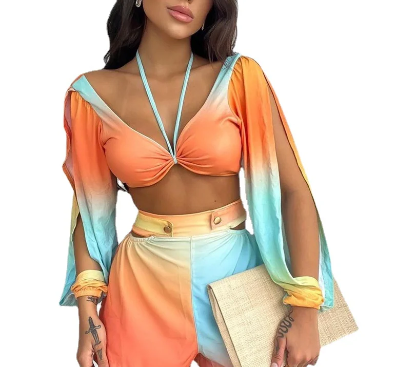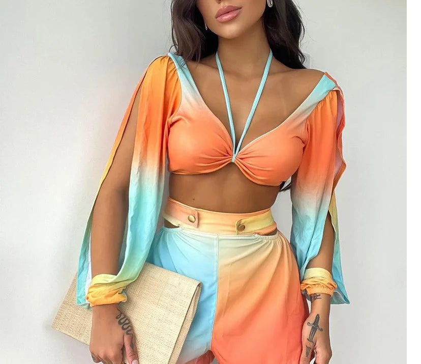 Hnewly Summer Women's Stylish Casual Set Tie-Dye Pattern with Long Sleeve Halter Top and and Shorts Cutout Detail Suitable for Vacation