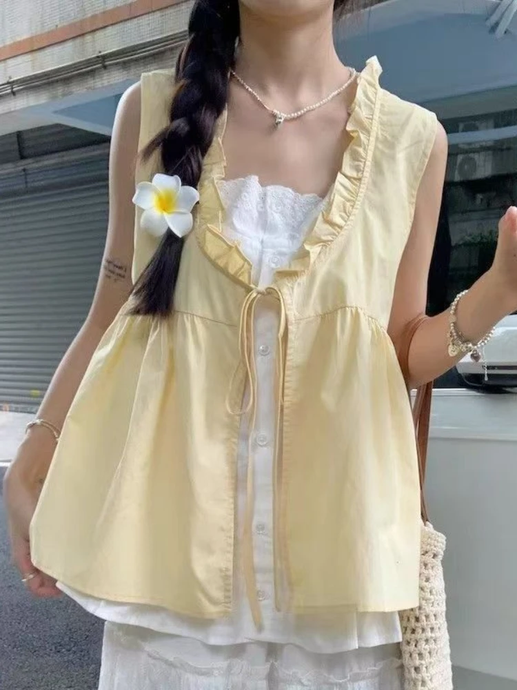 Hnewly Sweet Casual Loose Fake Two Pieces Tops Women Design Fashion Sleeveless Lace Brief T-Shirts Female Elegant Cute Fairy Clothes