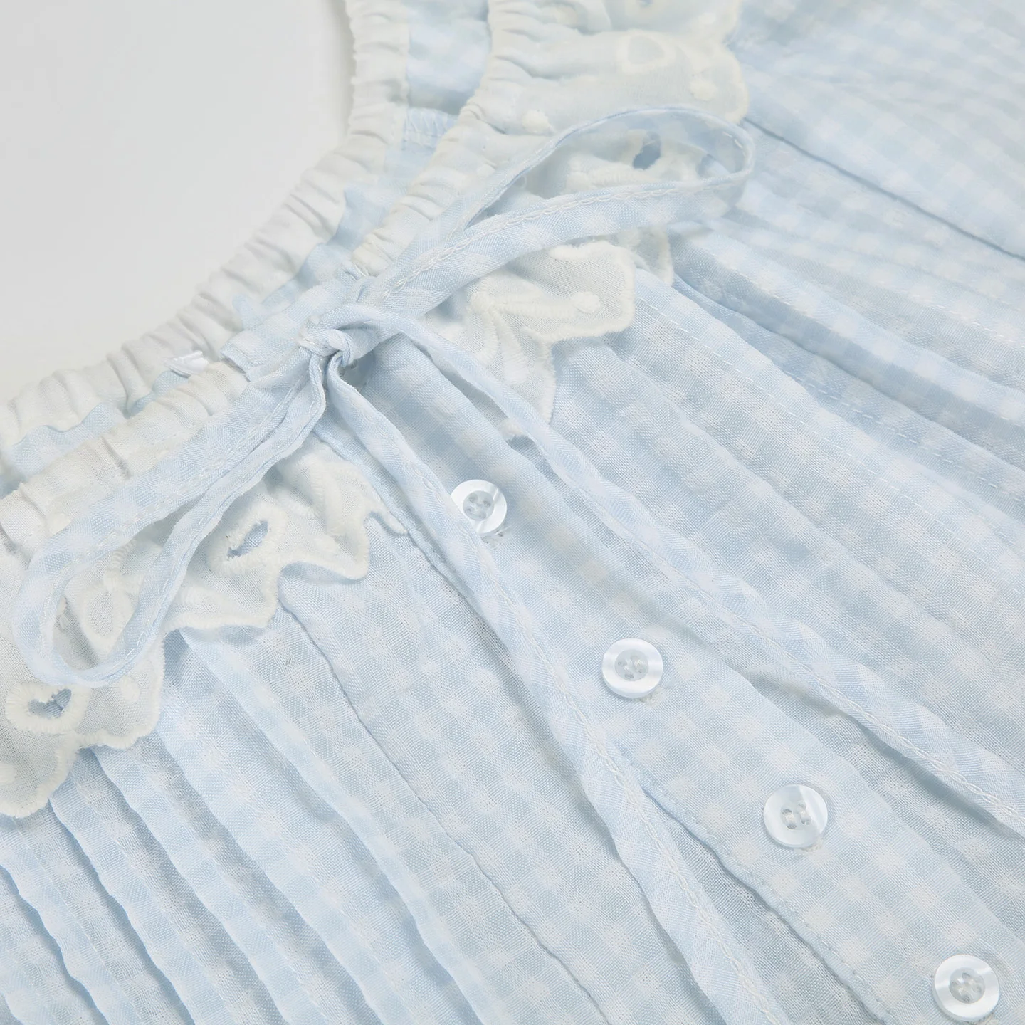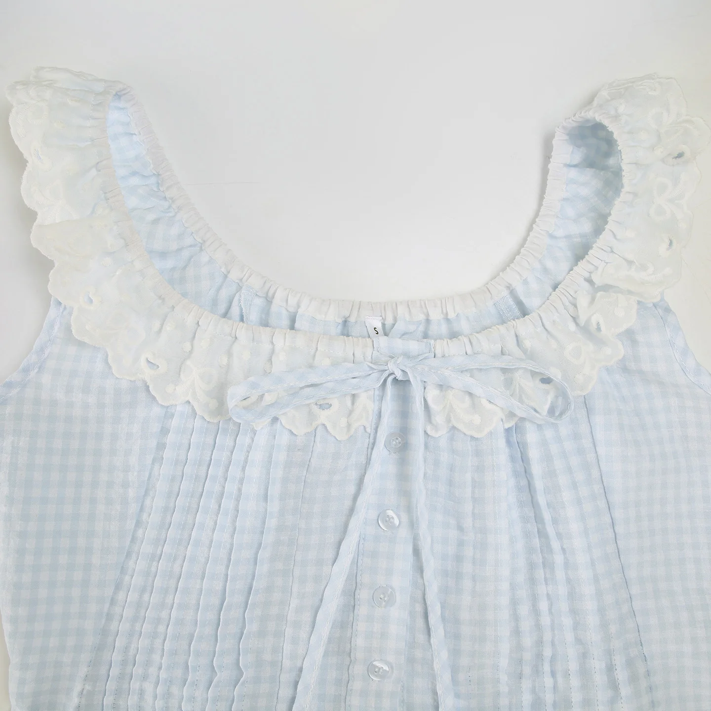 Hnewly Sweet Cute Plaid Lace Spliced Slim Fit Women Camisole Tops Bow Button Ruched Fashion Trendy Chic Blouses
