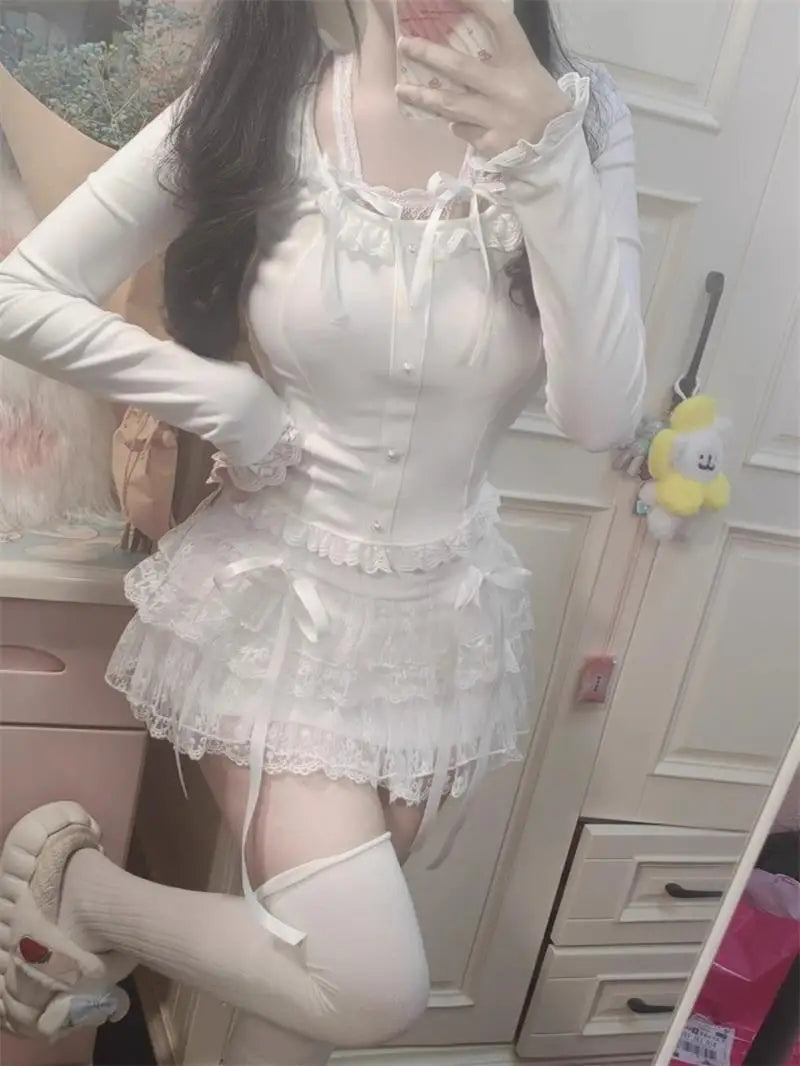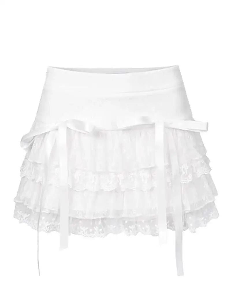 Hnewly Sweet Kawaii Skirts Women Lolita Coquette Lace Bow Patchwork Mini Skirt White High Waist Cute Summer A-line Short Skirt