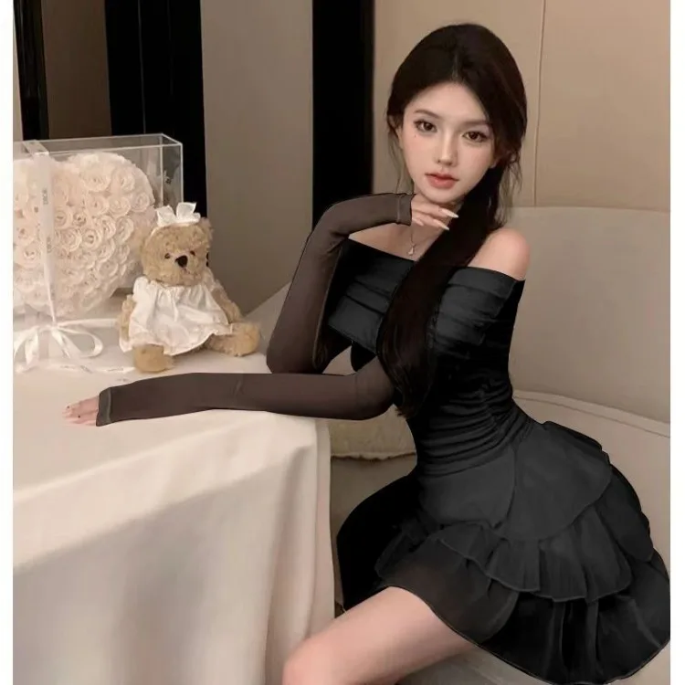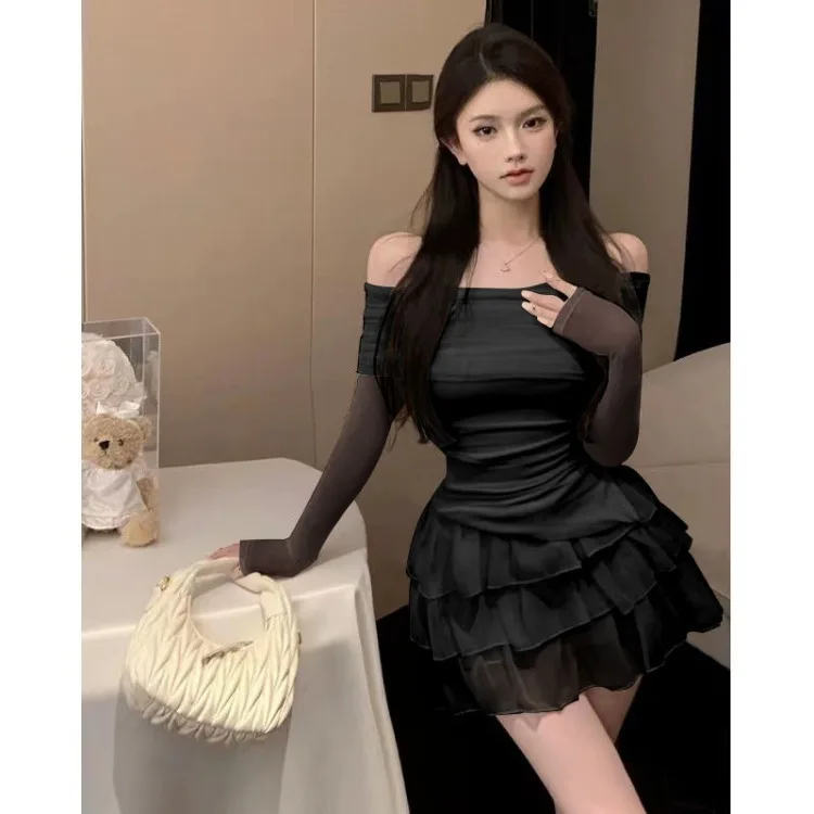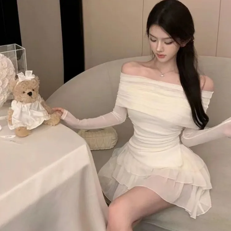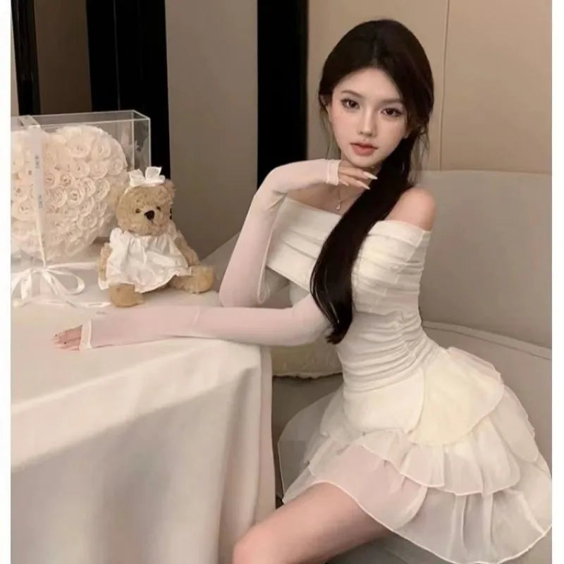 Hnewly Sweet Sexy Off Shoulder Slim Fit Long Sleeve Tops Women+ Y2k High Waist Ruched Cake Skirts 20264 Summer New Two Piece Sets
