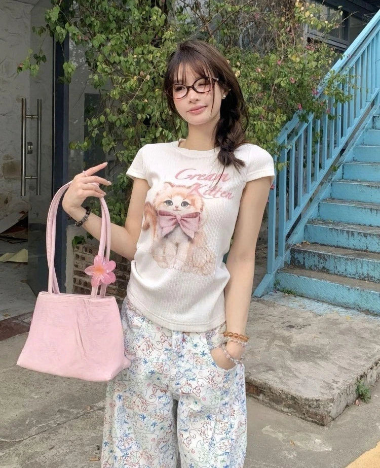 Hnewly Sweet T Shirts Women Cartoon Cat Printed Short Sleeve Summer Fashion Sexy Stretch Slim Y2k Tops Female Casual Tshirt
