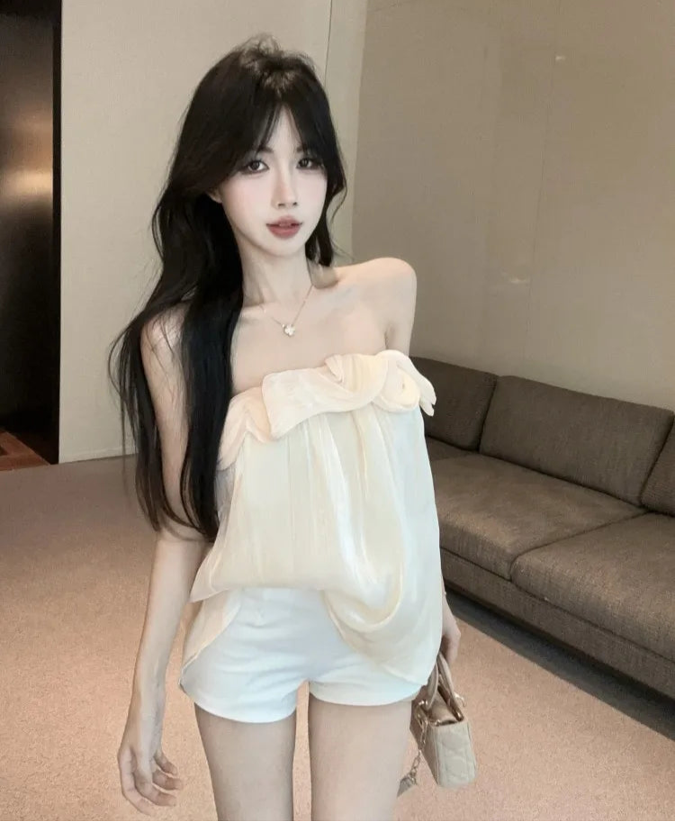 Hnewly Tank Tops Women Ruffles Ruched Slash Neck Solid Slim Backless Sweet Elegant Camis Sexy Ladies Casual French Style Chic
