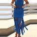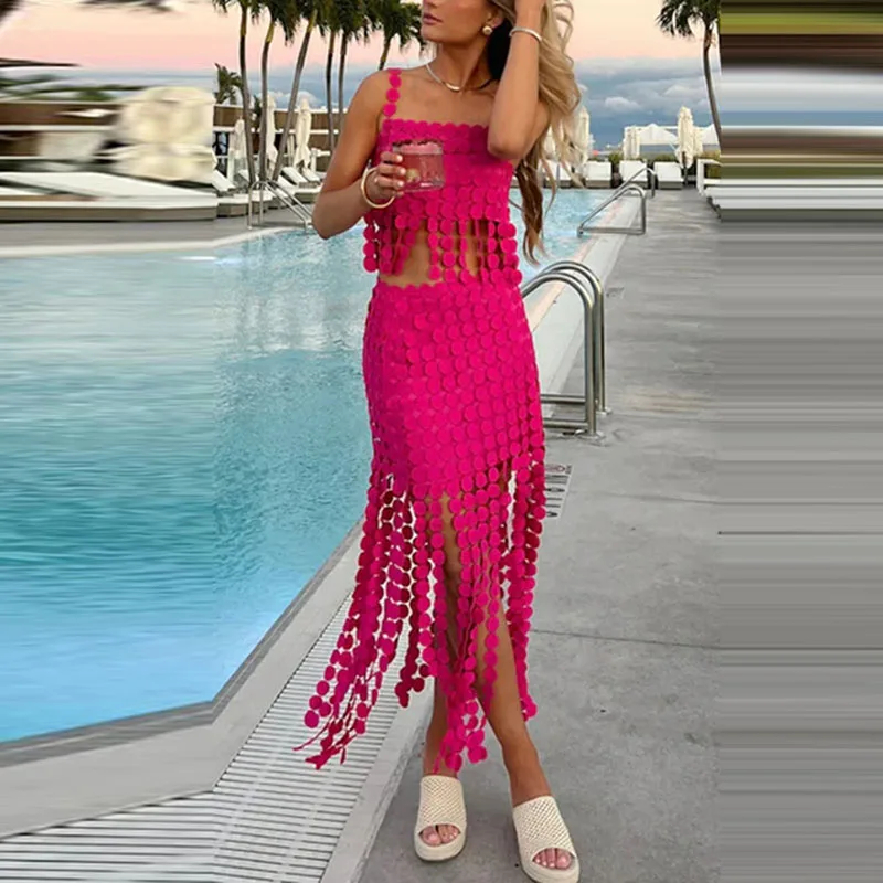 Hnewly Tassel Hollow Out Slim Club Party Suit New Summer Off Shoulder Long Skirt Beach Outfit Fashion Holiday Solid Color Two Piece Set