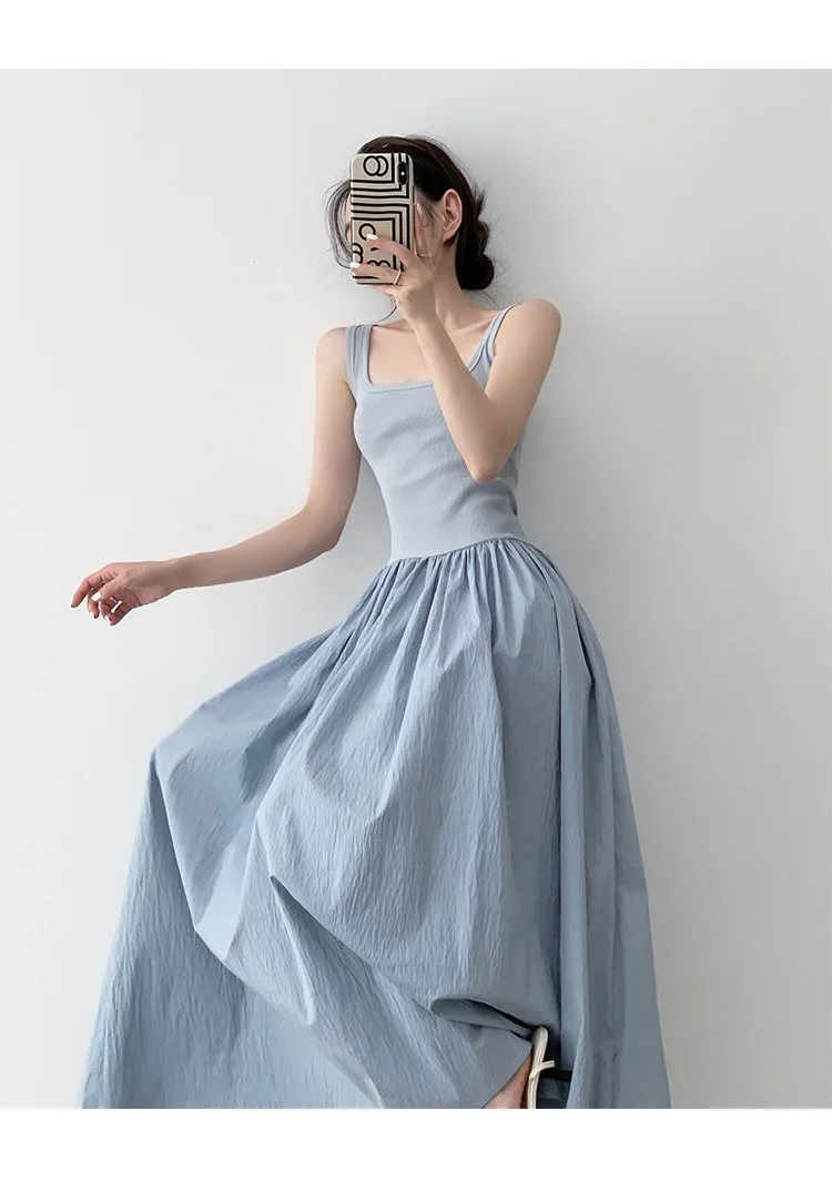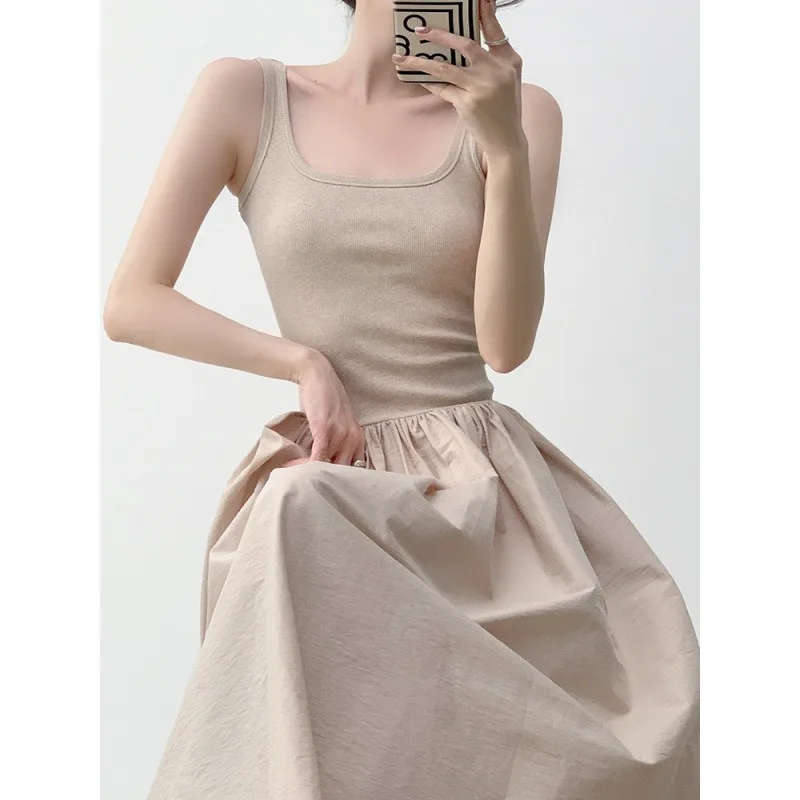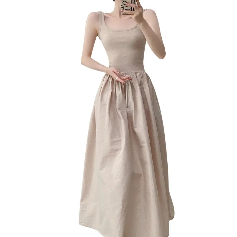 Hnewly Temperament Apricot Suspender Dress Gentle Summer Vacation Style Waist Cinched Backless Big Swing A-line Long Skirt