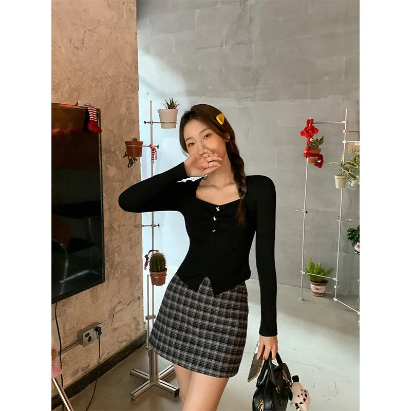 Hnewly Temperament Square Neck Long Sleeved T-Shirt For Women New Style Pleated Slim Fit And Slimming Short Top