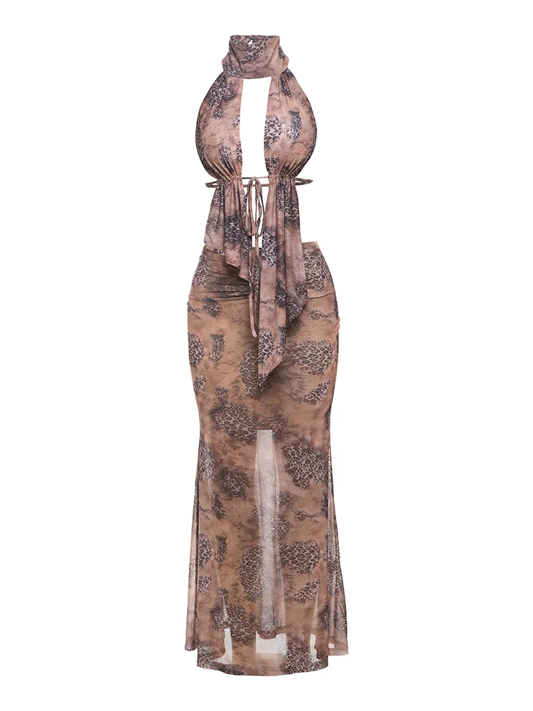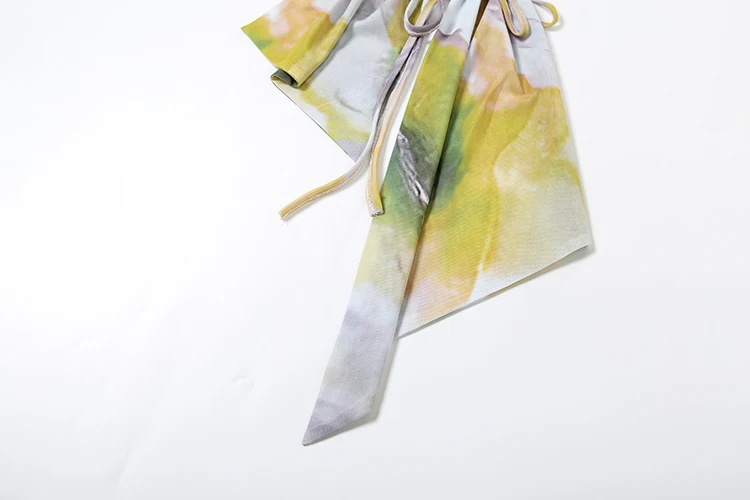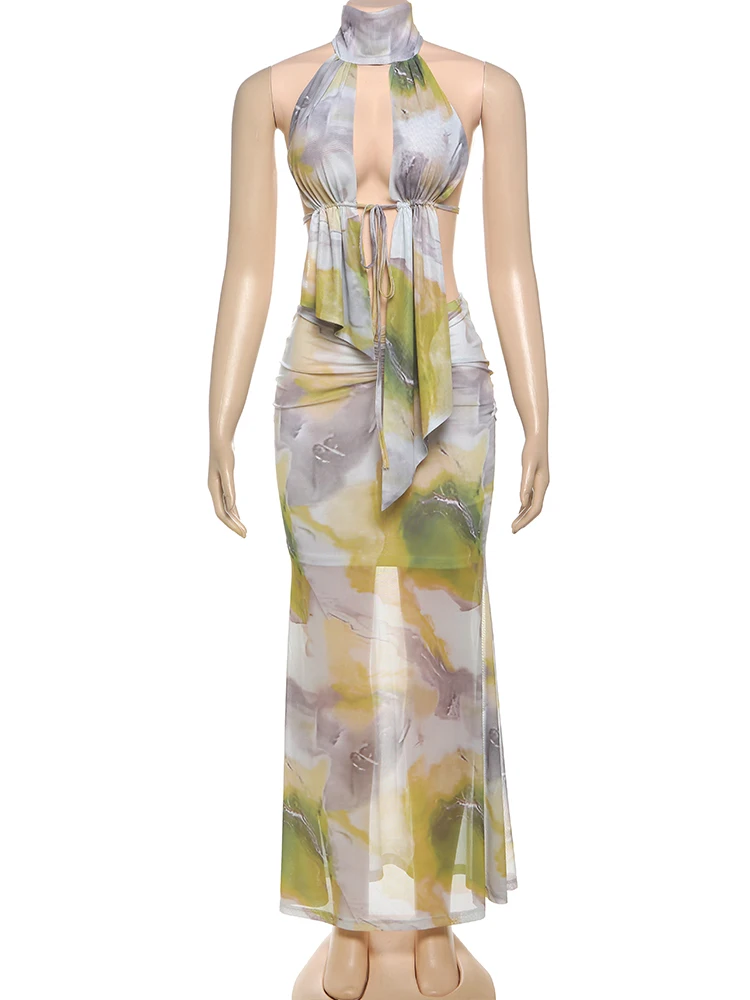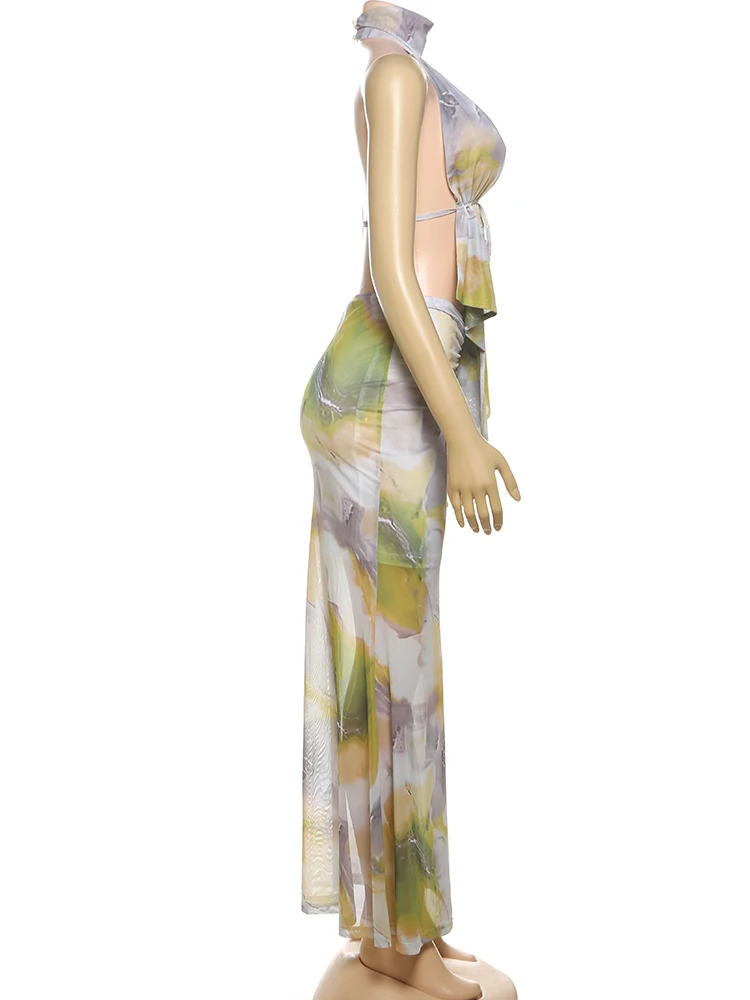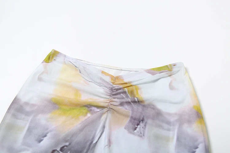 Hnewly Tie-Dye Fashion 2 Piece Set Women Halter Turtleneck Ruffles Backless Tops+Ruched Skirts Vacation Beach Party Outfits