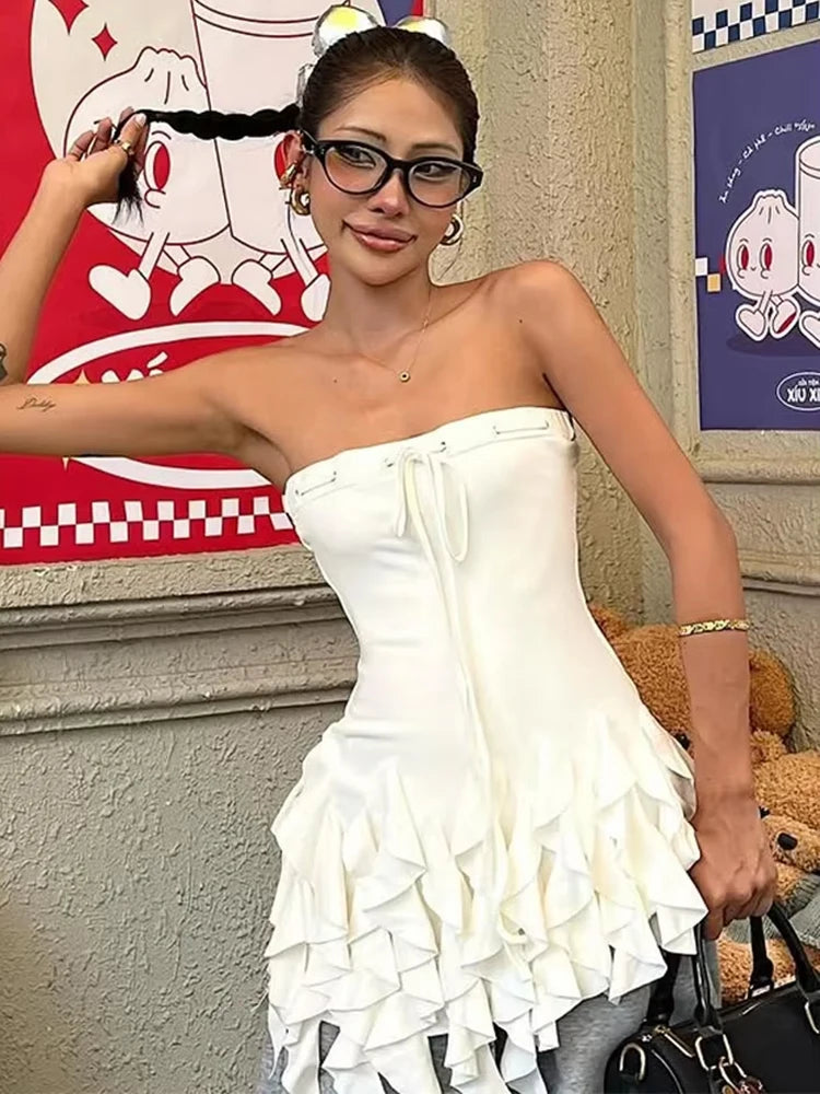 Hnewly Tierred Tassel Hem Tube Tops Women Lace-Up Solid Skinny Chic Summer Beach Party Vacation Street Classic Crop Tops