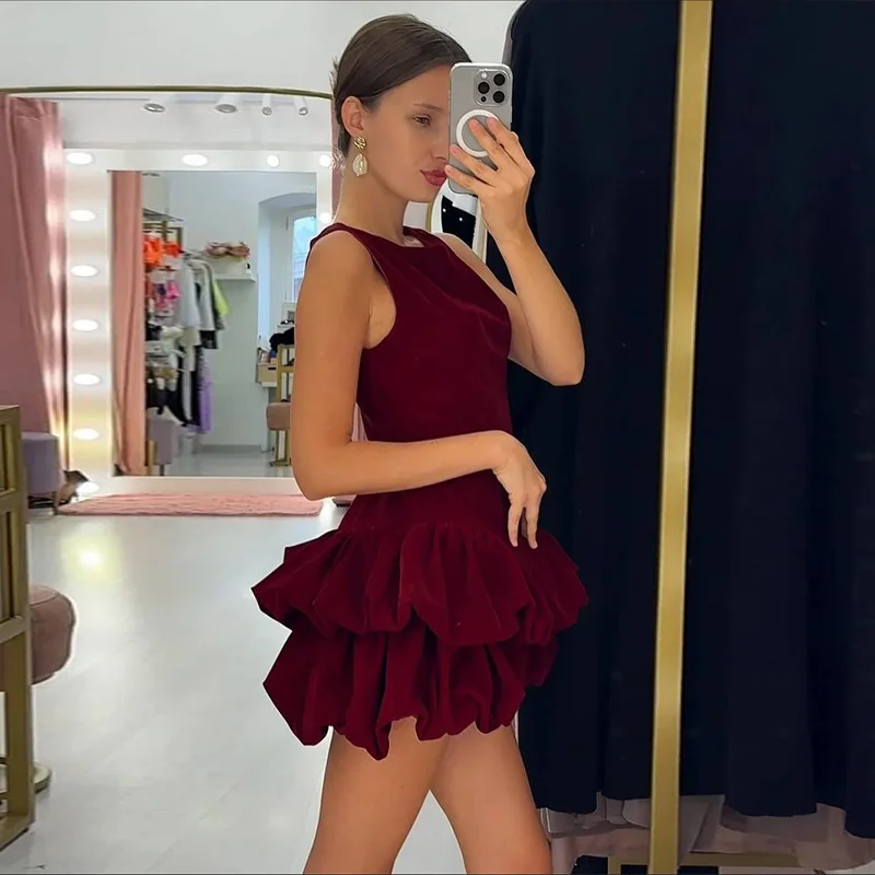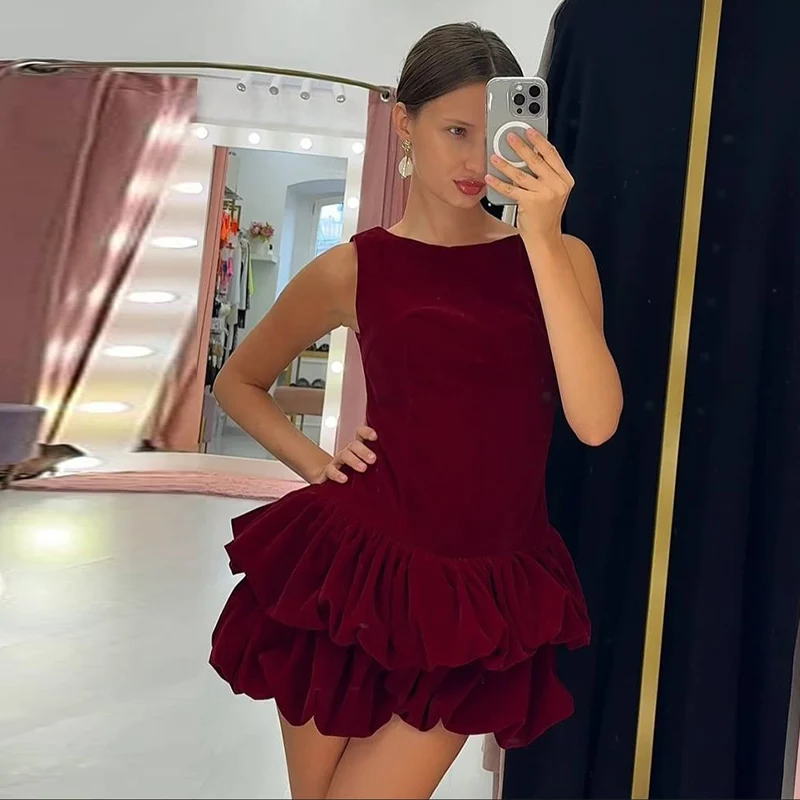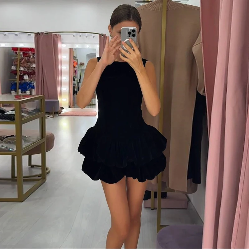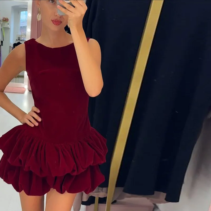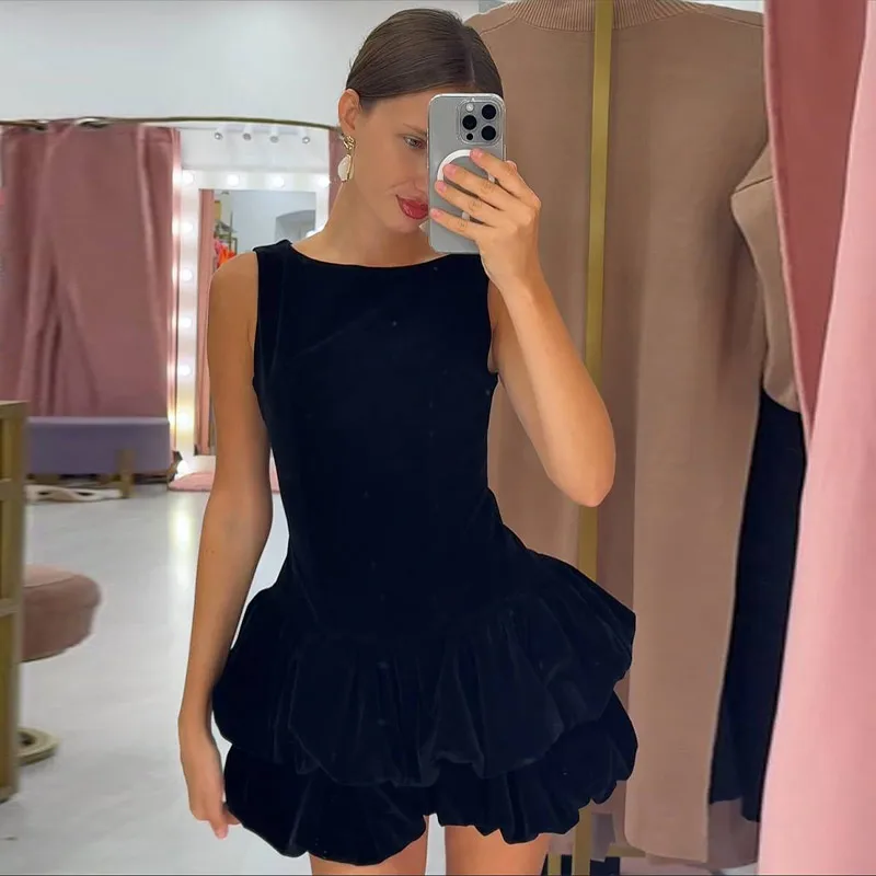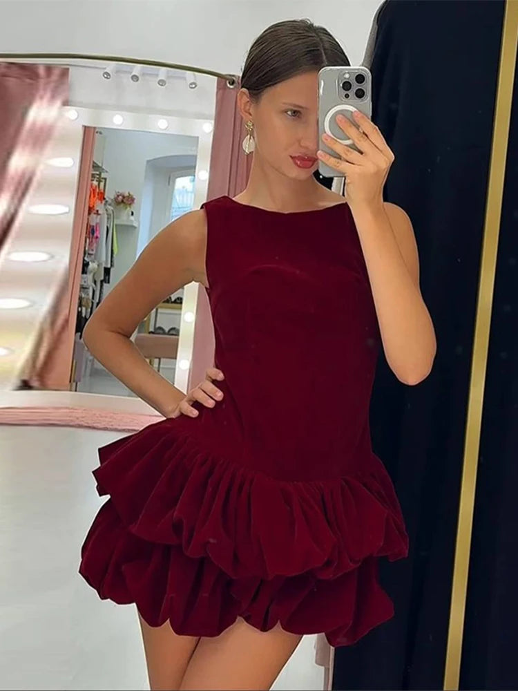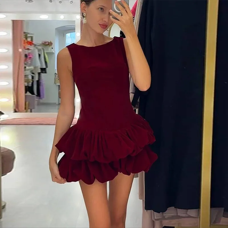 Hnewly Velvet Women's Party Dress O-neck Sleeveless Slim Waist A-line Double-layered bud Female Dresses Autumn Christmas Sexy Robe