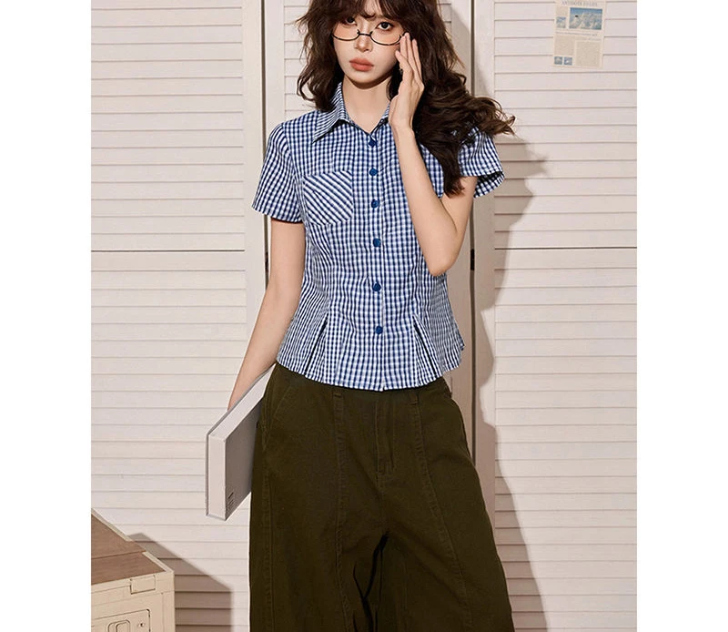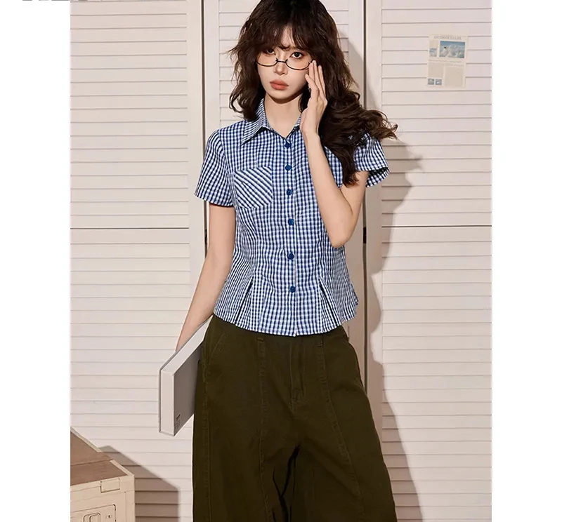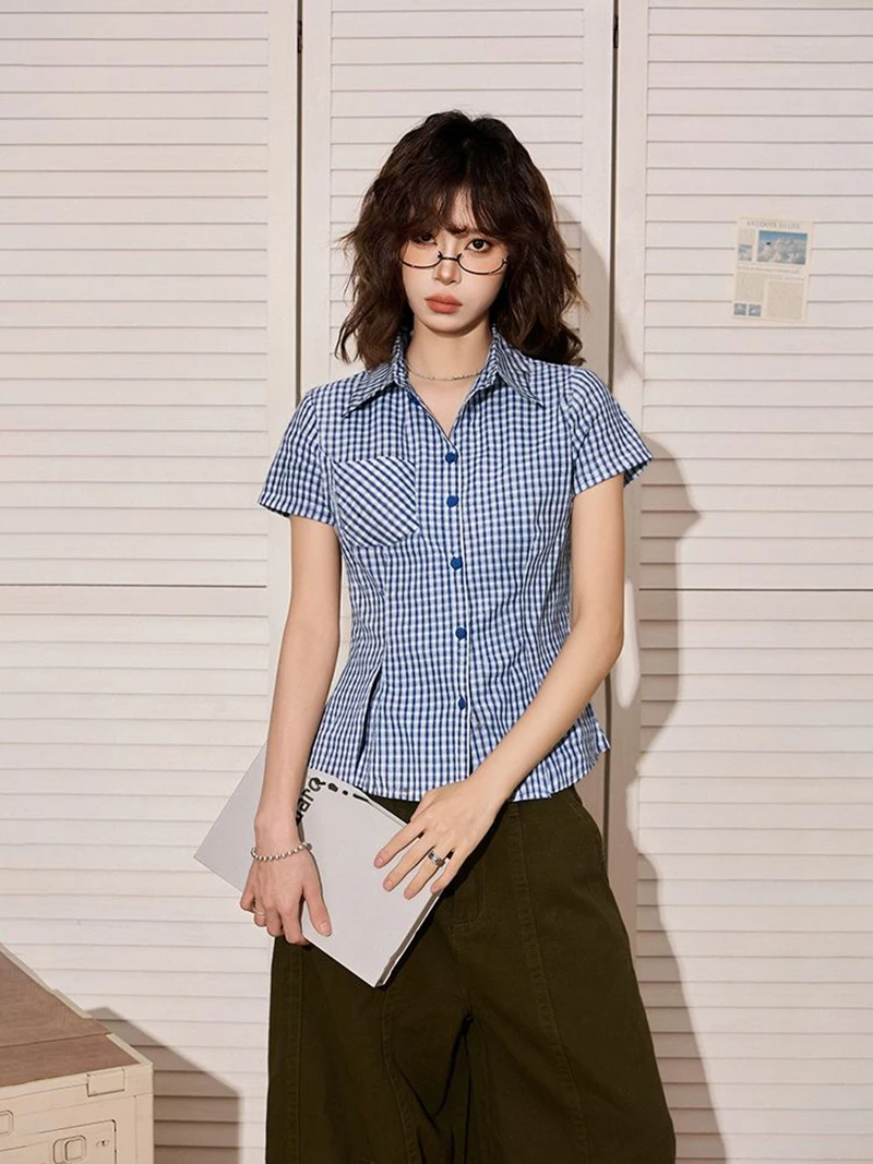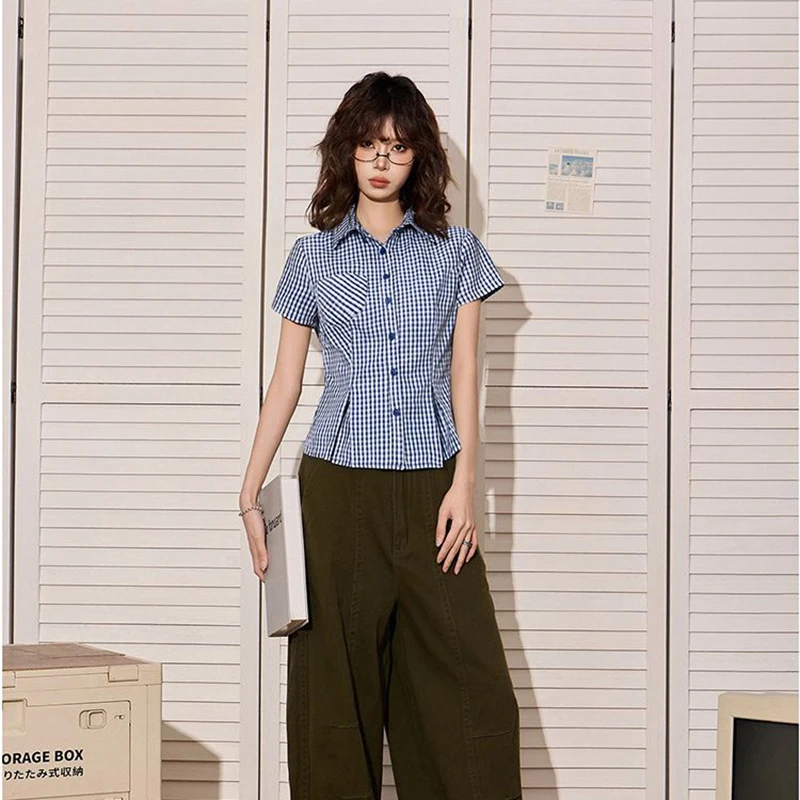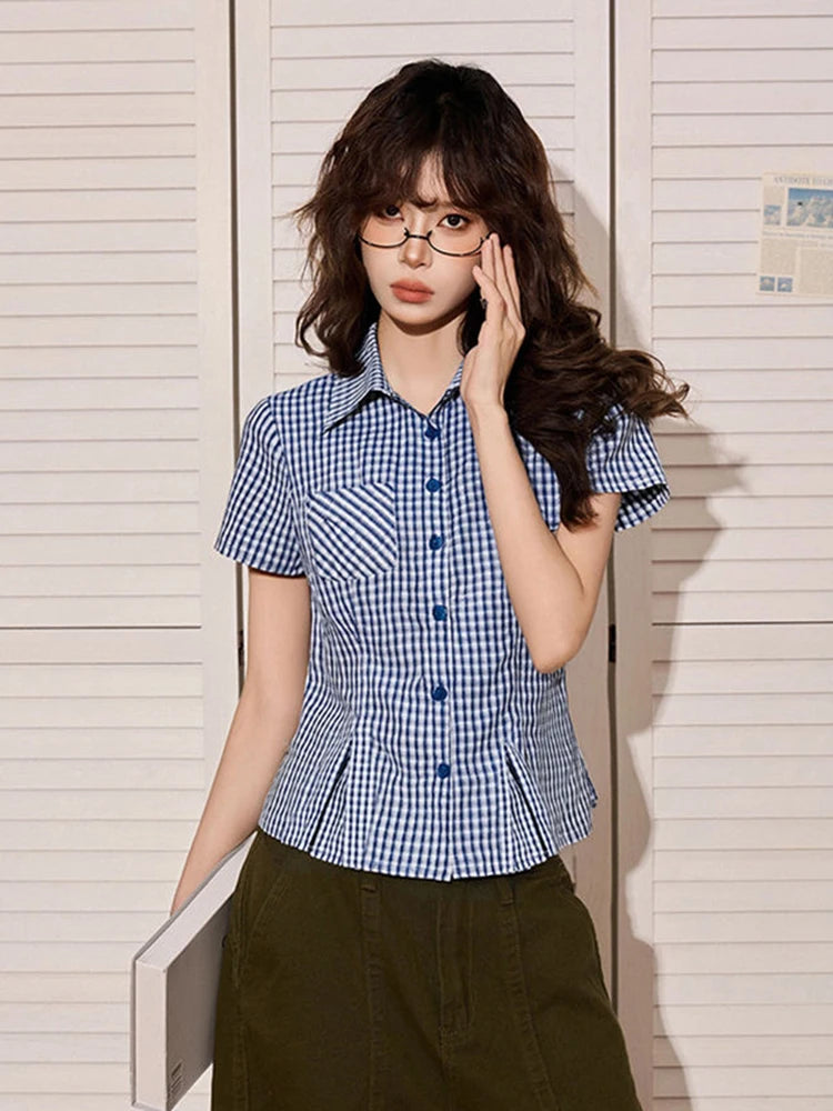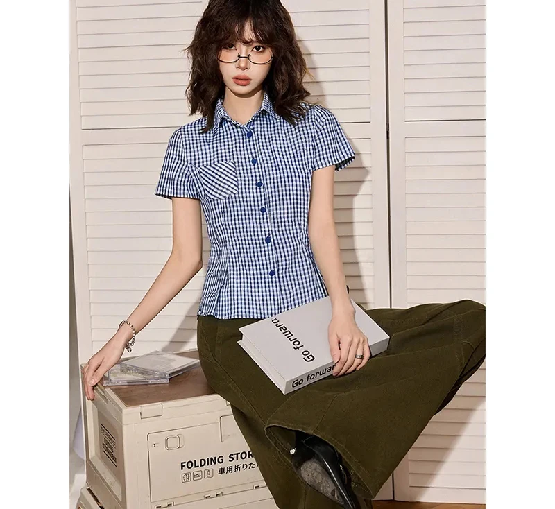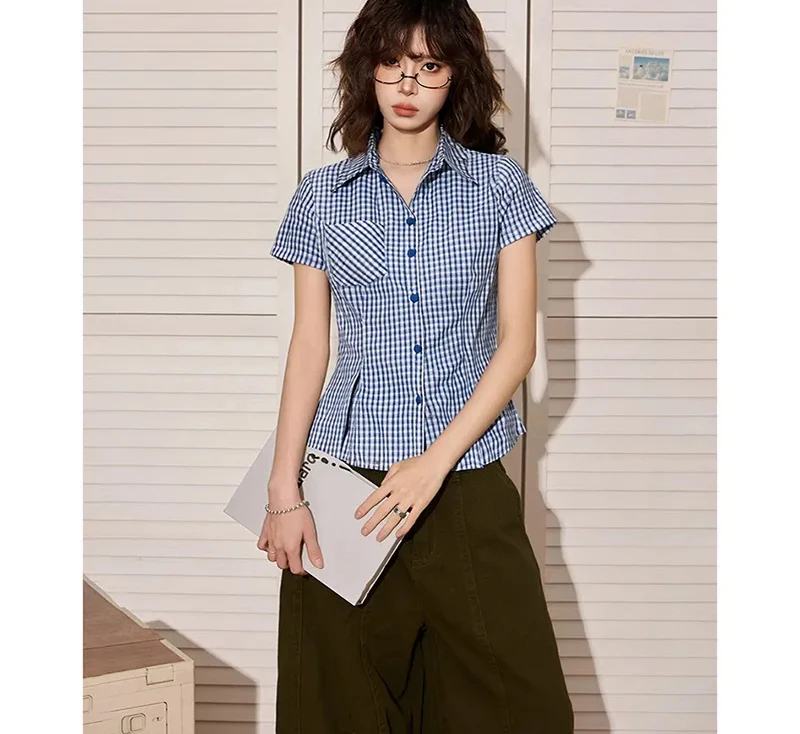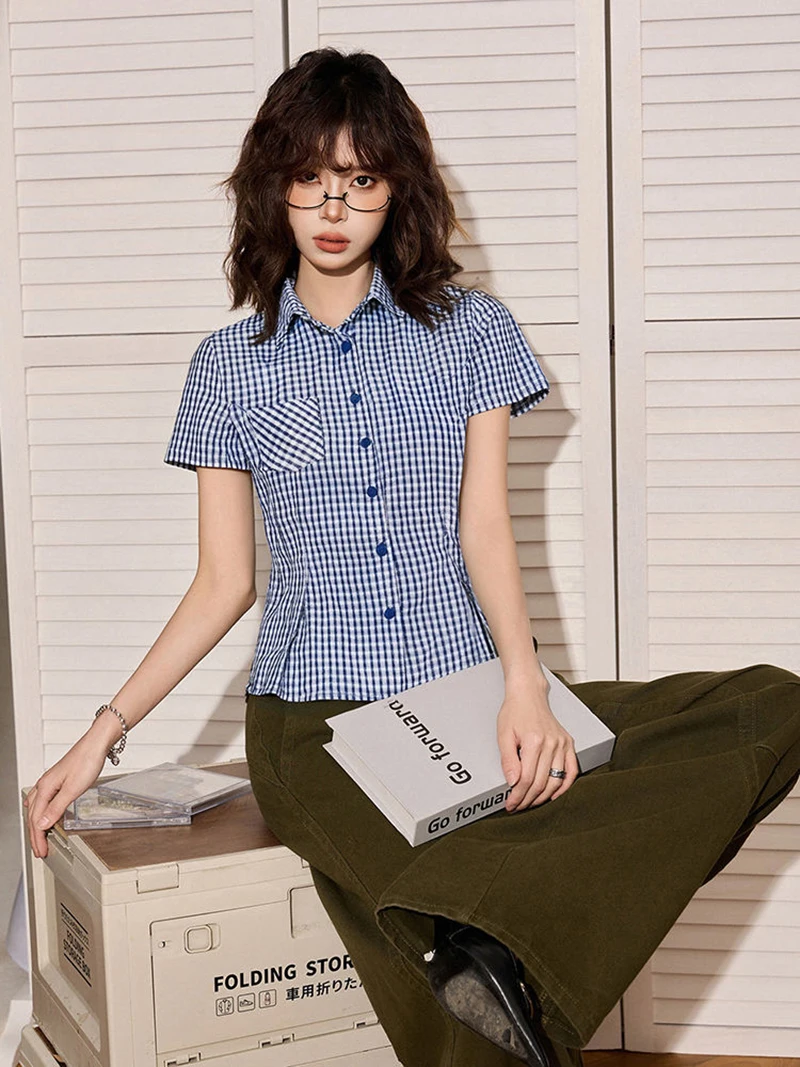 Hnewly Vintage American Plaid Shirt Women Slim Preppy Style Short Sleeve Blouse Casual Pocket Retro Female Single Breasted Tops