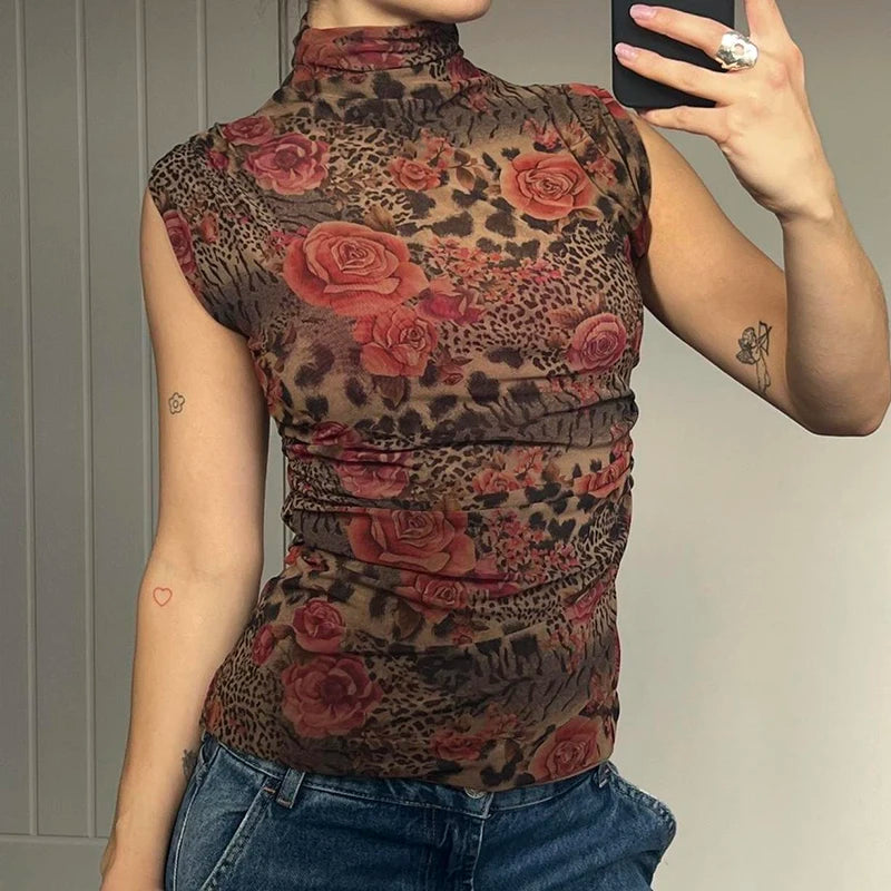 Hnewly Vintage Floral Print Crop Top Women Retro Sleeveless Turtleneck Skinny Tank Tops Harajuku y2k Tee Summer Casual Lady Vest