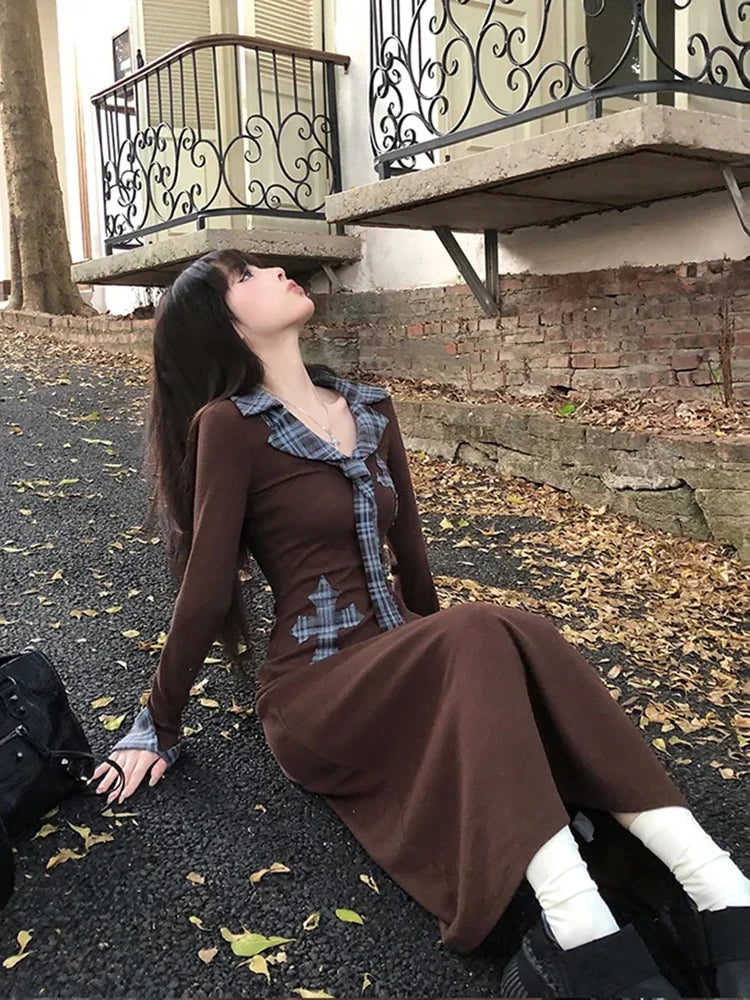 Hnewly Vintage Plaid Patchwork Midi Dress Autumn Korean Long Sleeve Lapel Casual Dress Y2K Elegant Hepburn Style Slim A Line Vestidos