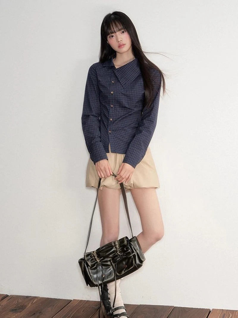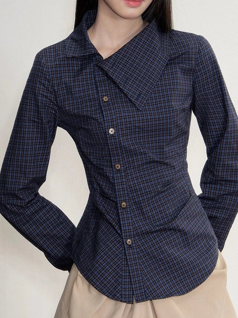 Hnewly Vintage Slim Plaid Shirt Women Elegant Fall Long Sleeve Design Blouse Casual Preppy Style Female Retro Korean Sweet Tops