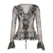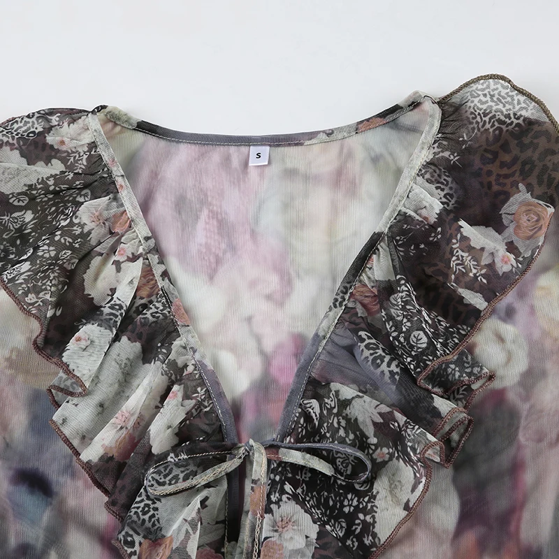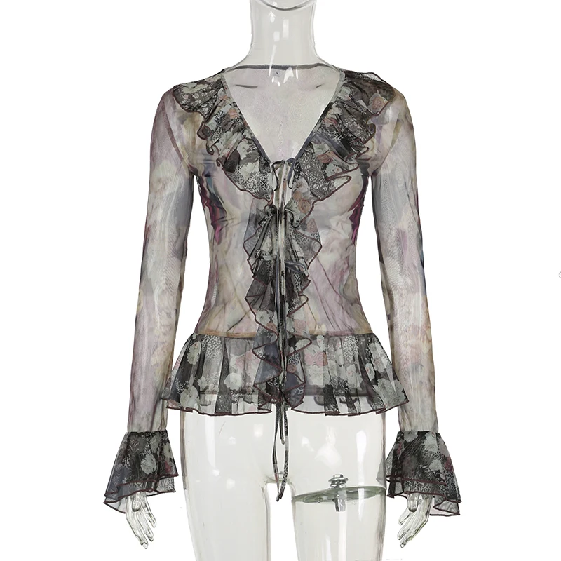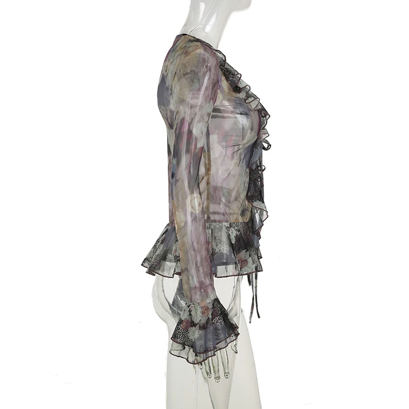 Hnewly Vintage Transparent Crop Top with Slit 90s Mesh Print Ruffles Patchwork Full Sleeve Bandage Women T-shirt Grunge y2k Tees