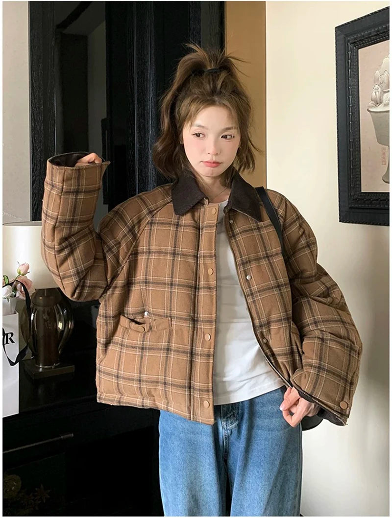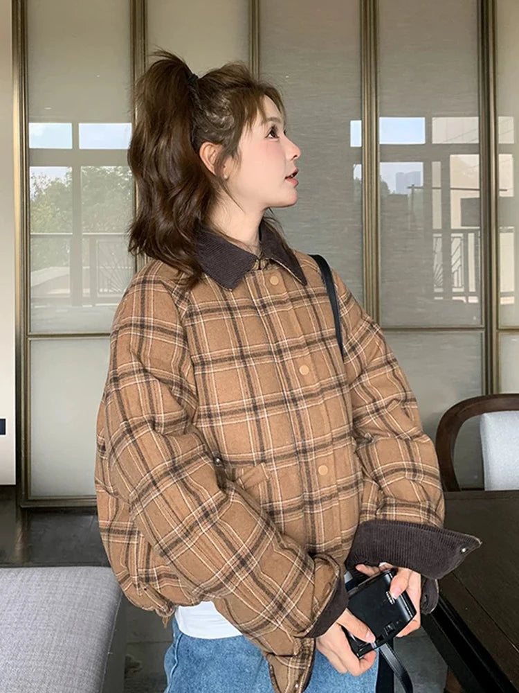 Hnewly Warm Vintage Plaid Parkas Women Loose Long Sleeve Winter Thick Cotton Coat Korean Casual Pockets Cute Sweet Jacket Tops New