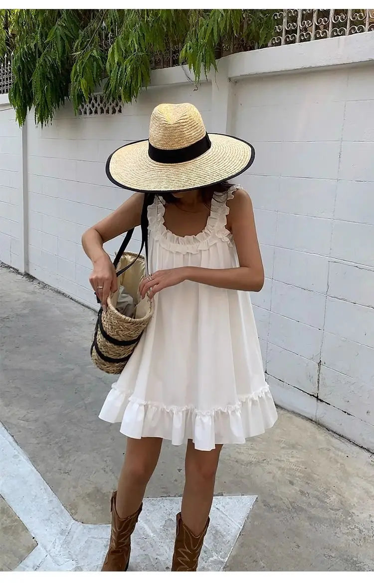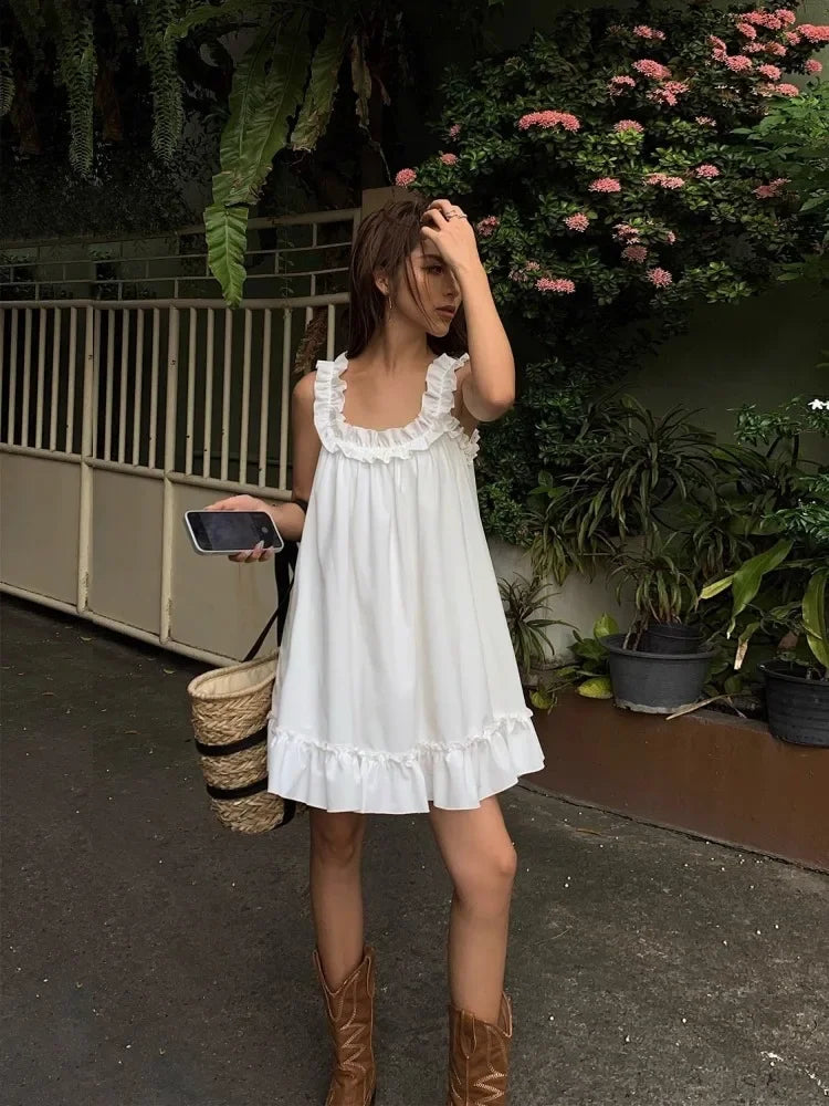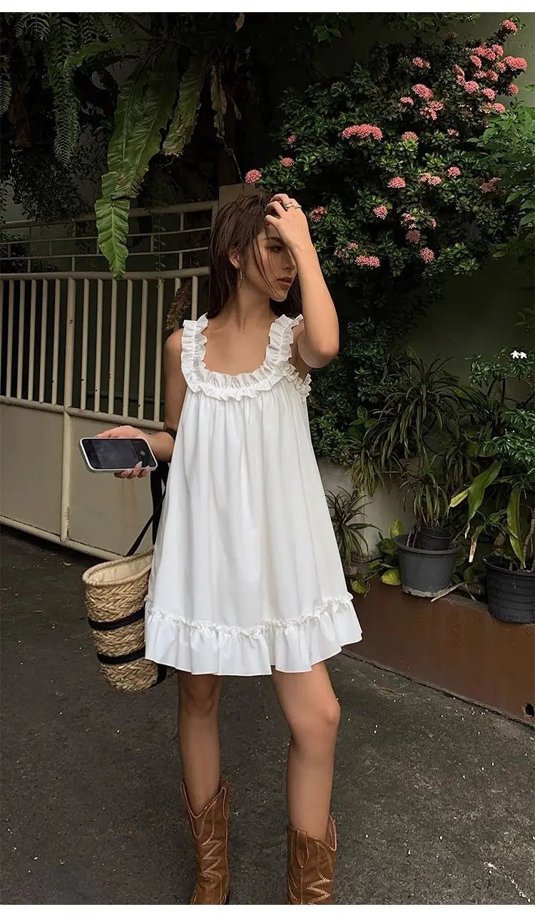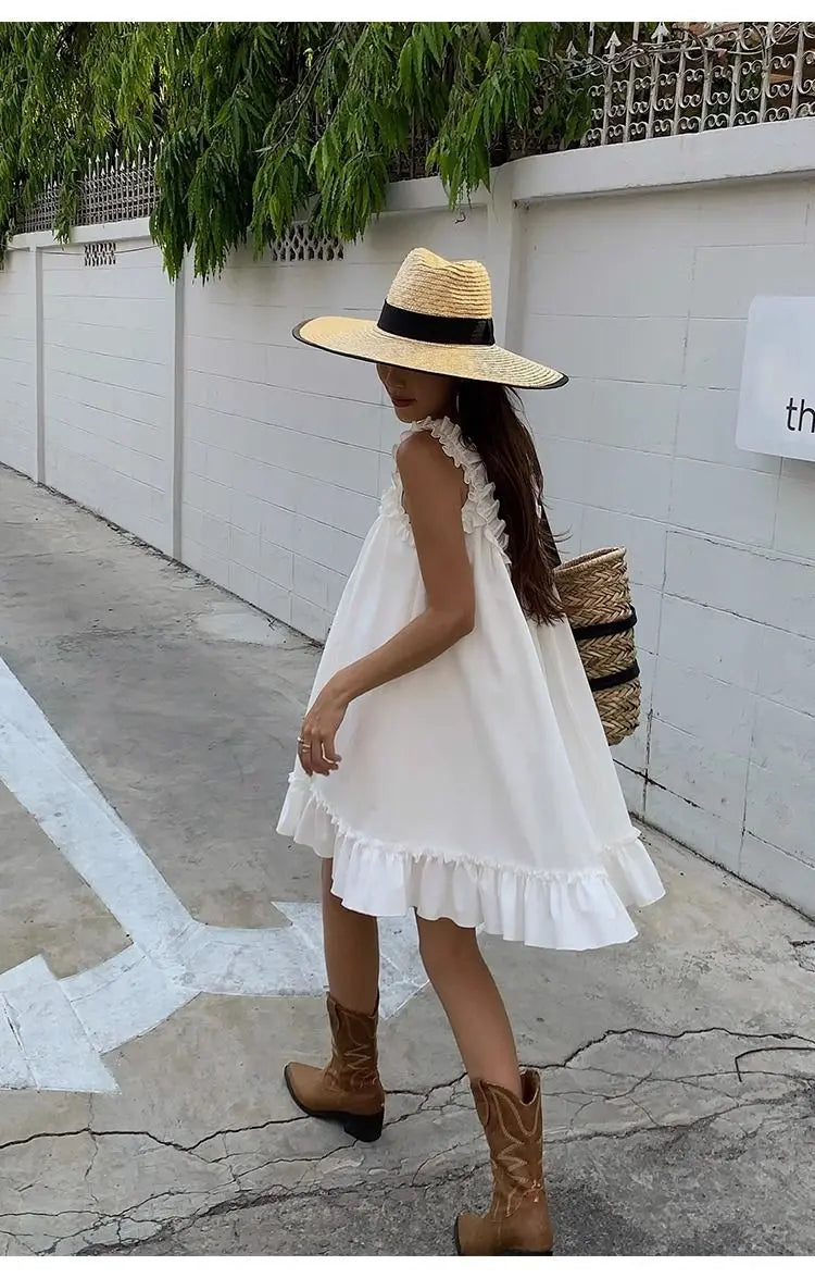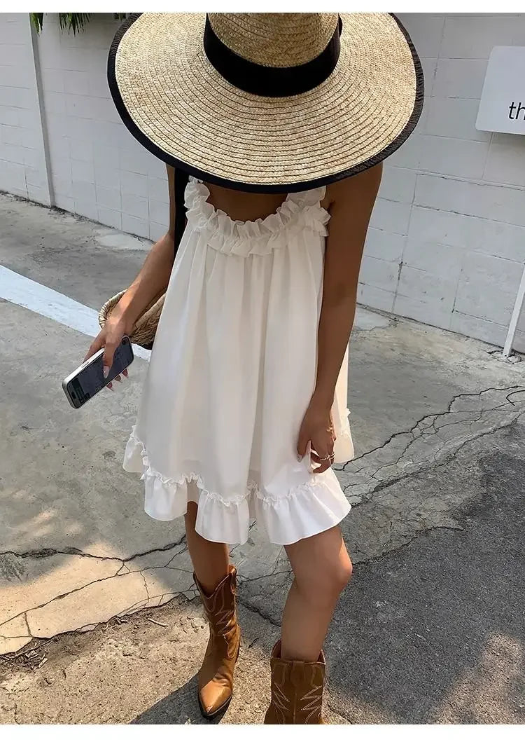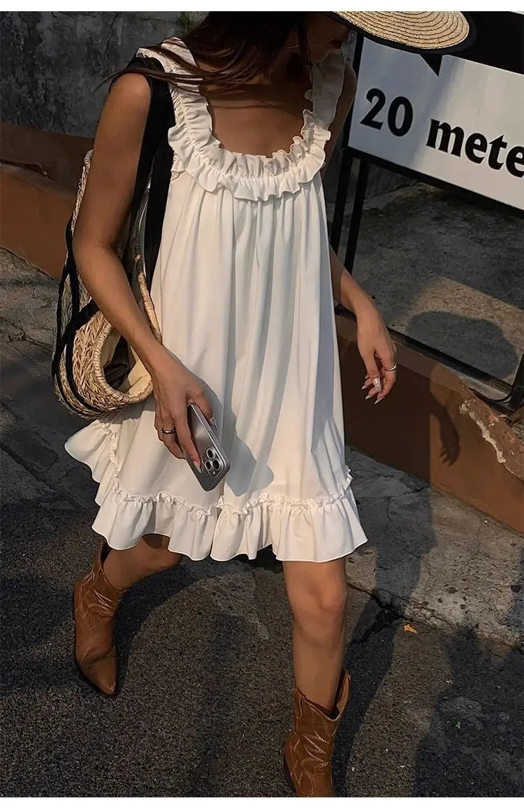 Hnewly White Sleeveless Ruffles Mini Dress Women Casual Boho Beach Sundress Cute Girl Home Dresses Loose Summer Dress Oversize