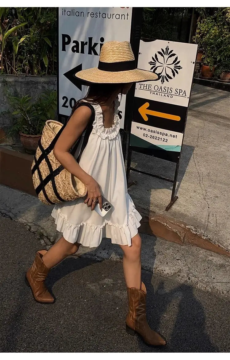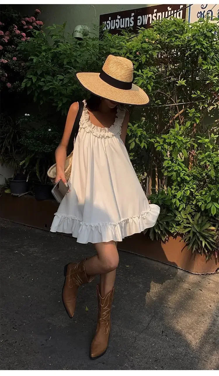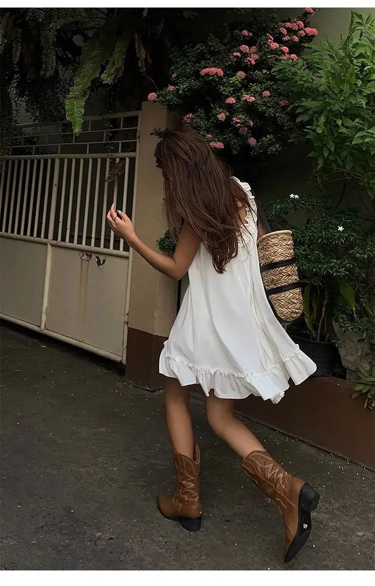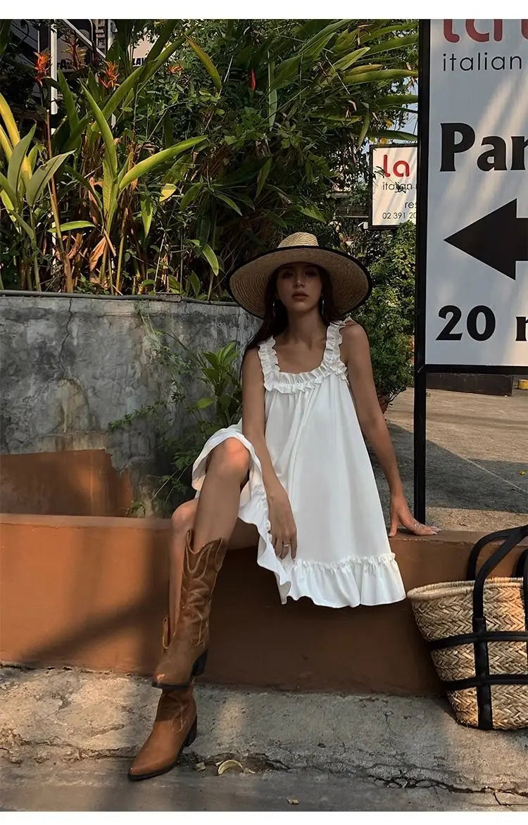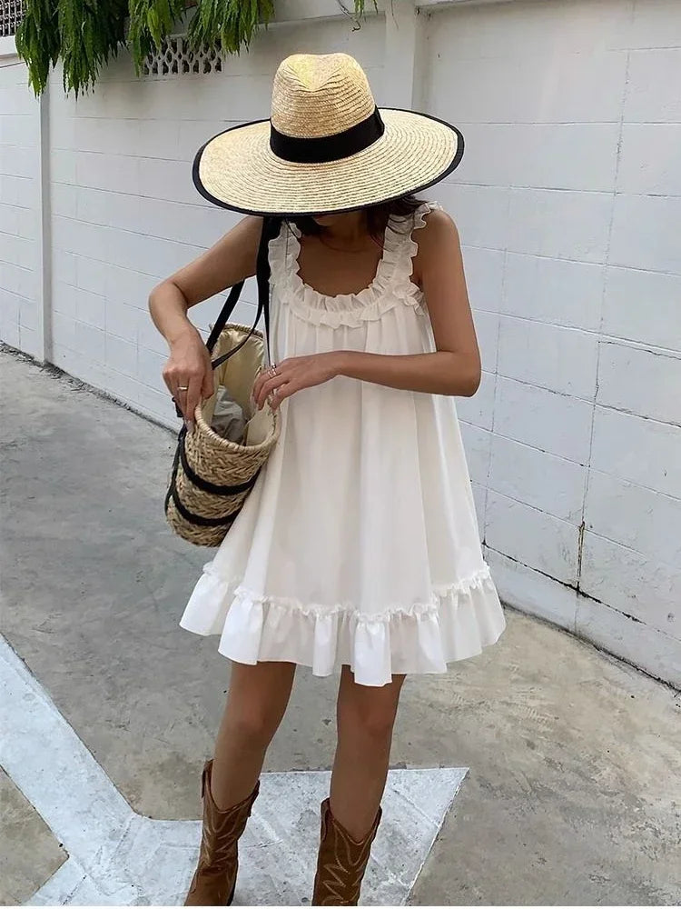 Hnewly White Sleeveless Ruffles Mini Dress Women Casual Boho Beach Sundress Cute Girl Home Dresses Loose Summer Dress Oversize
