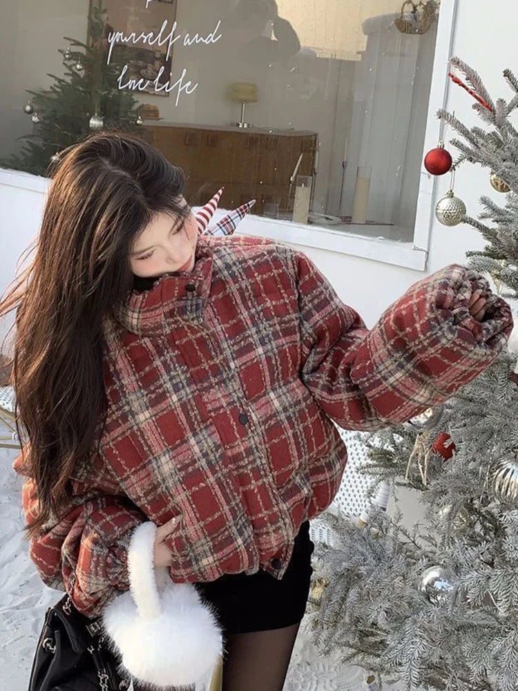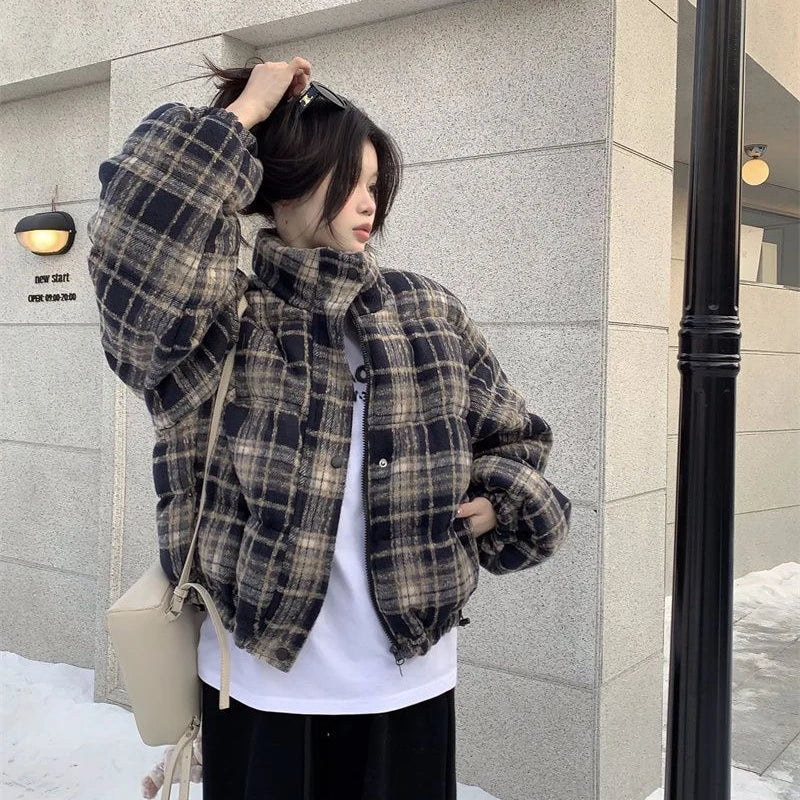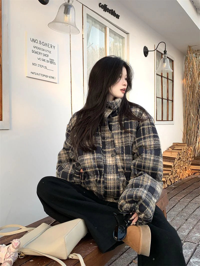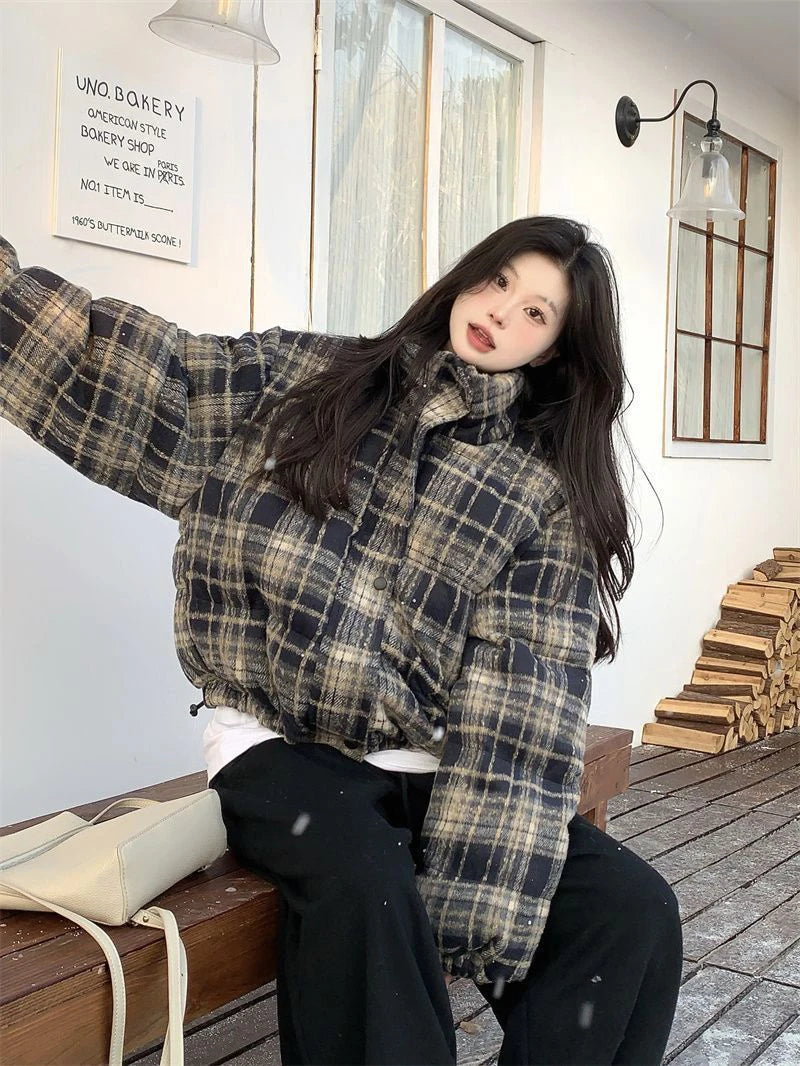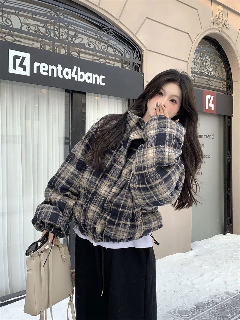 Hnewly Winter Vintage Warm Plaid Parkas Women Thick Loose Long Sleeve Cute Cotton Coat Casual American Retro Stand Collar Y2K Tops