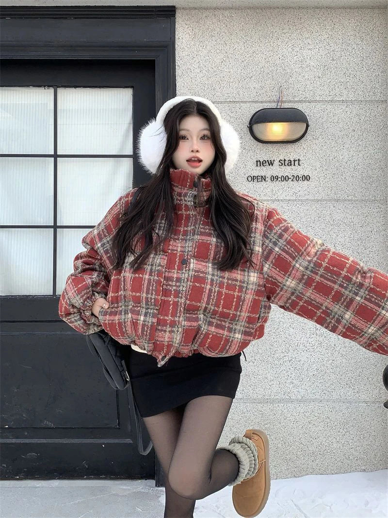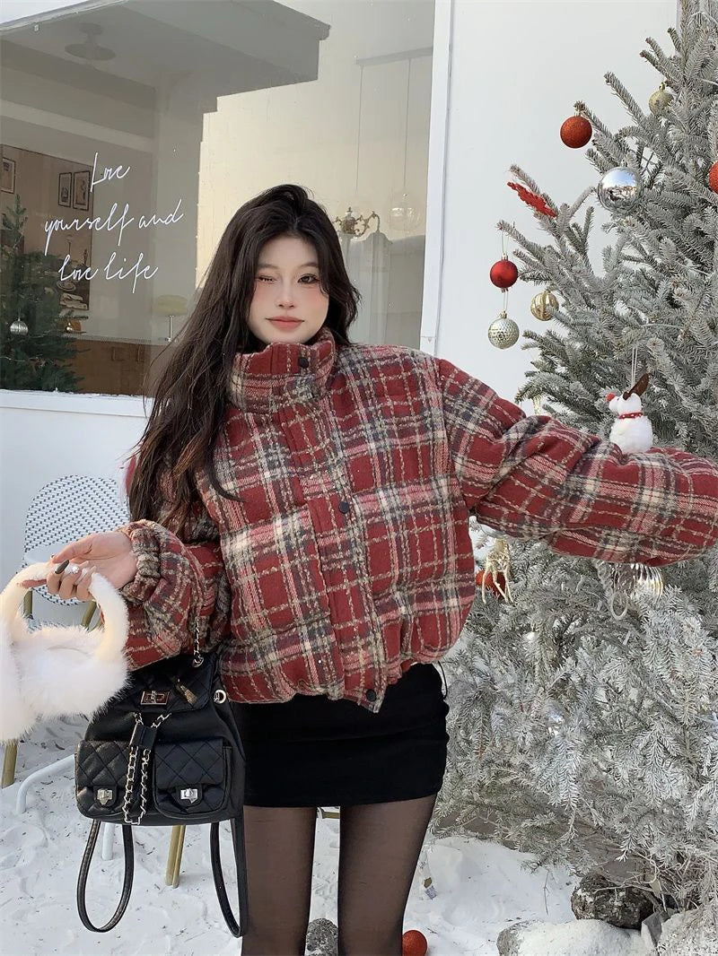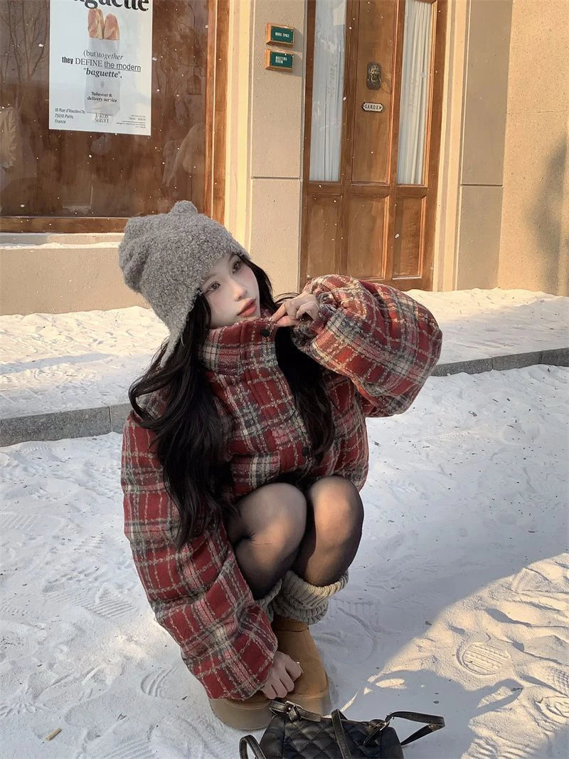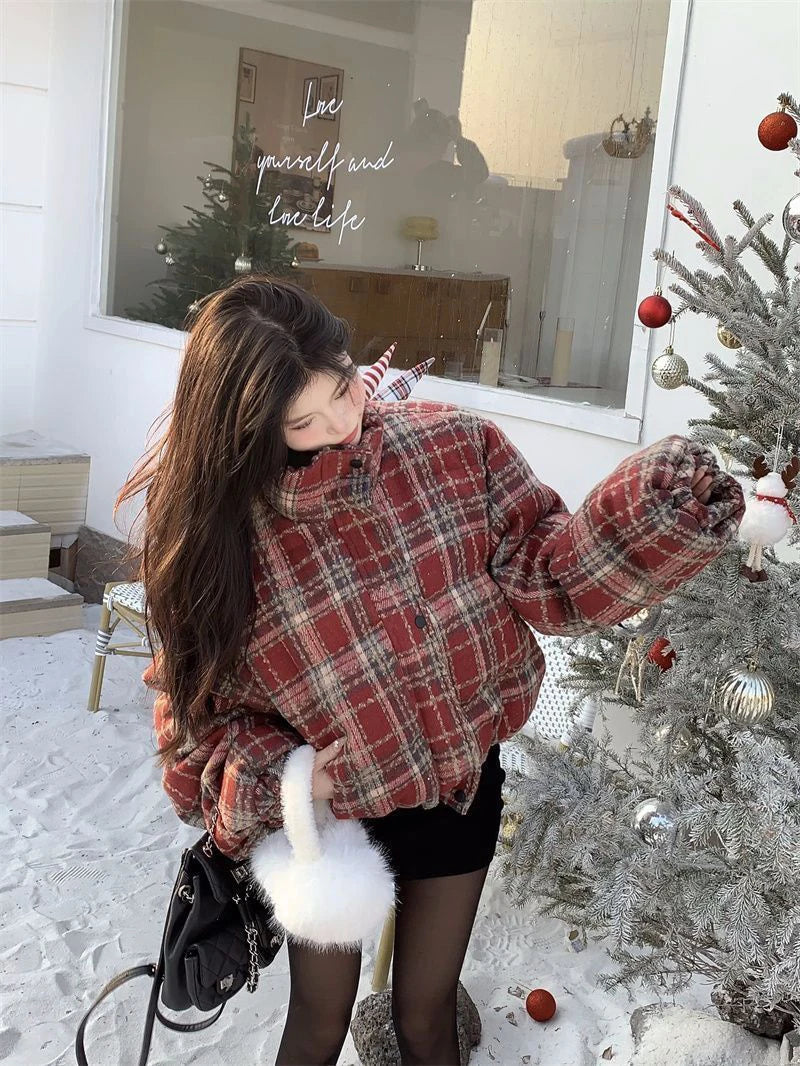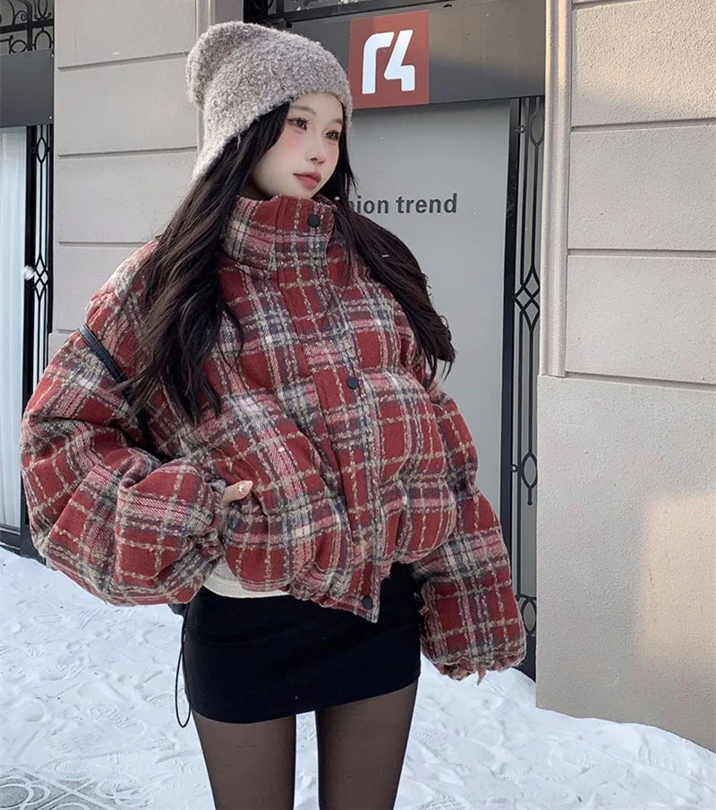 Hnewly Winter Vintage Warm Plaid Parkas Women Thick Loose Long Sleeve Cute Cotton Coat Casual American Retro Stand Collar Y2K Tops