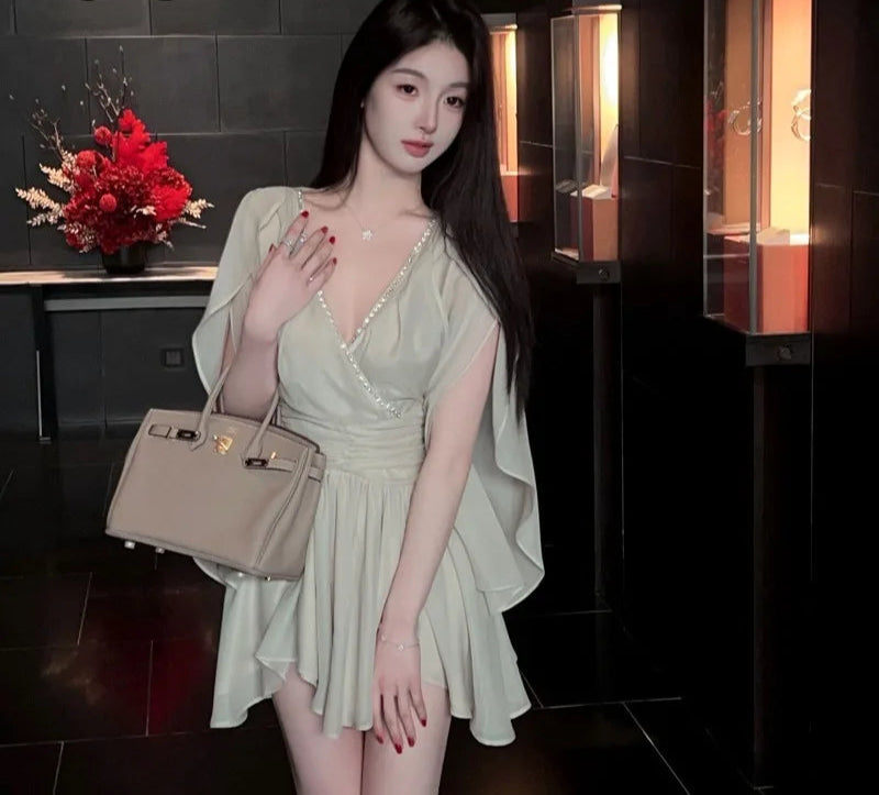 Hnewly Woman Dress Rhinestone V Neck Ruffles Summer Fashion Sweet Solid Elegant Temperament Mini Dresses Female Casual Chic