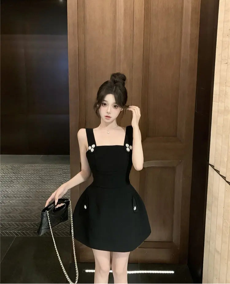 Hnewly Woman Dress Sleeveless Square Collar Slim Elegant Vintage Temperament Summer Fashion Mini Dresses Female Party Sexy