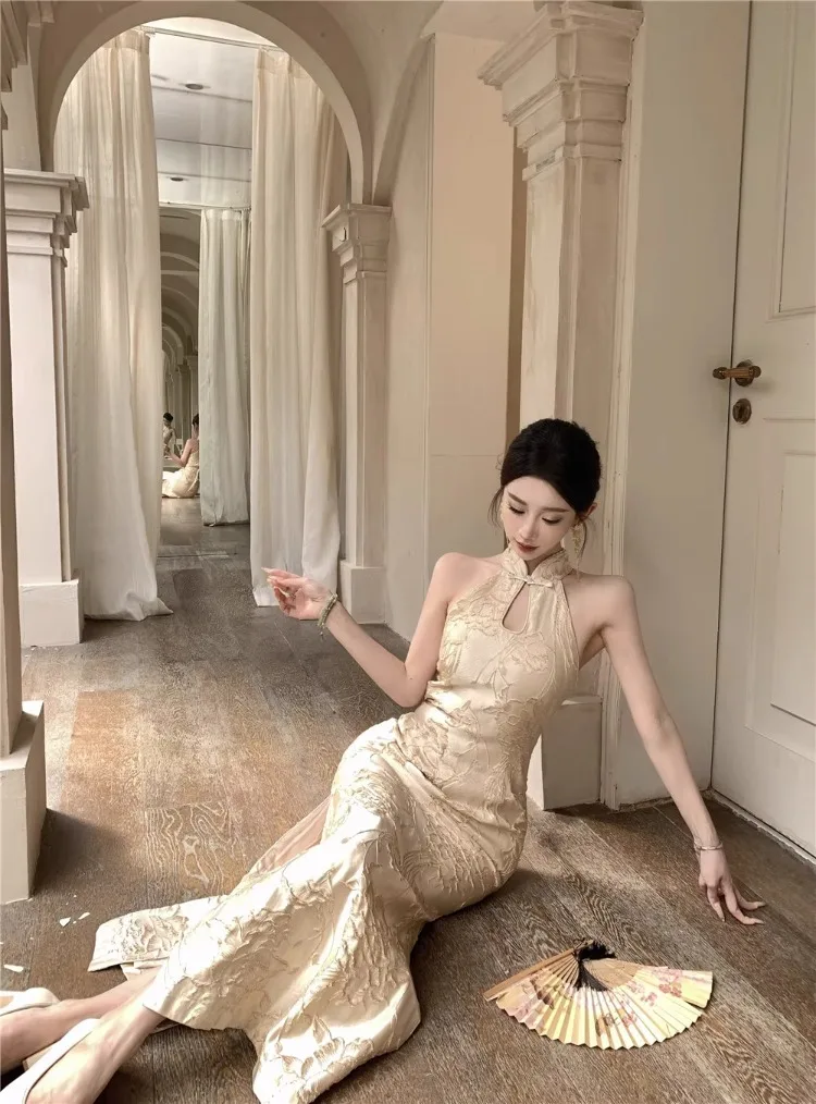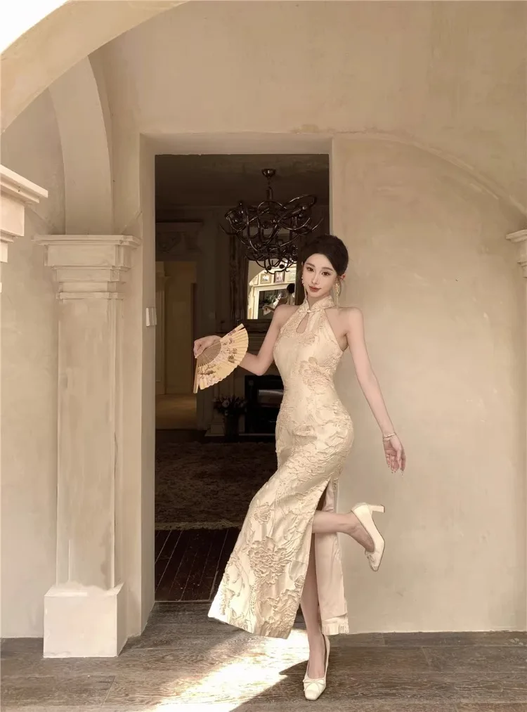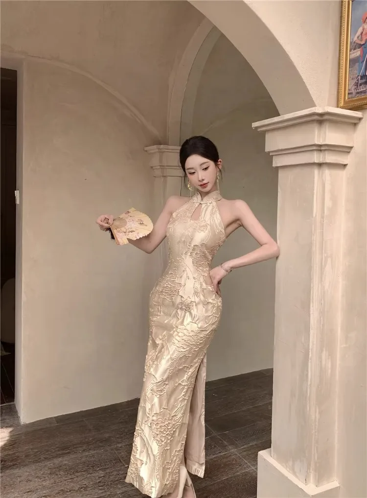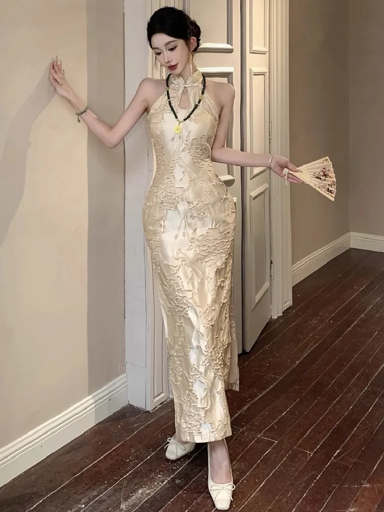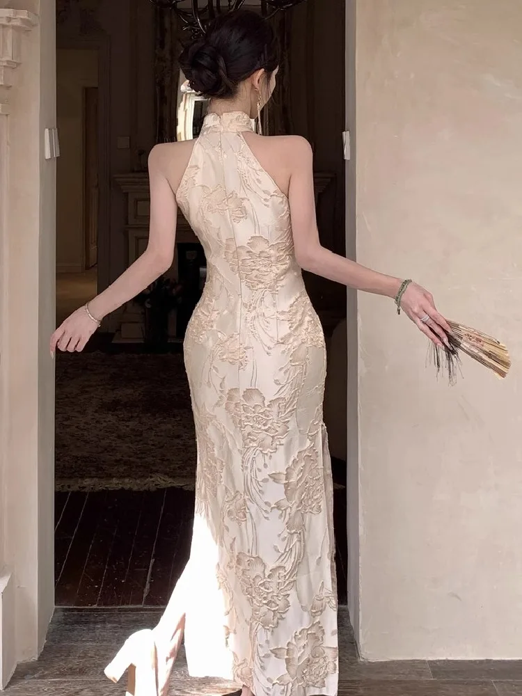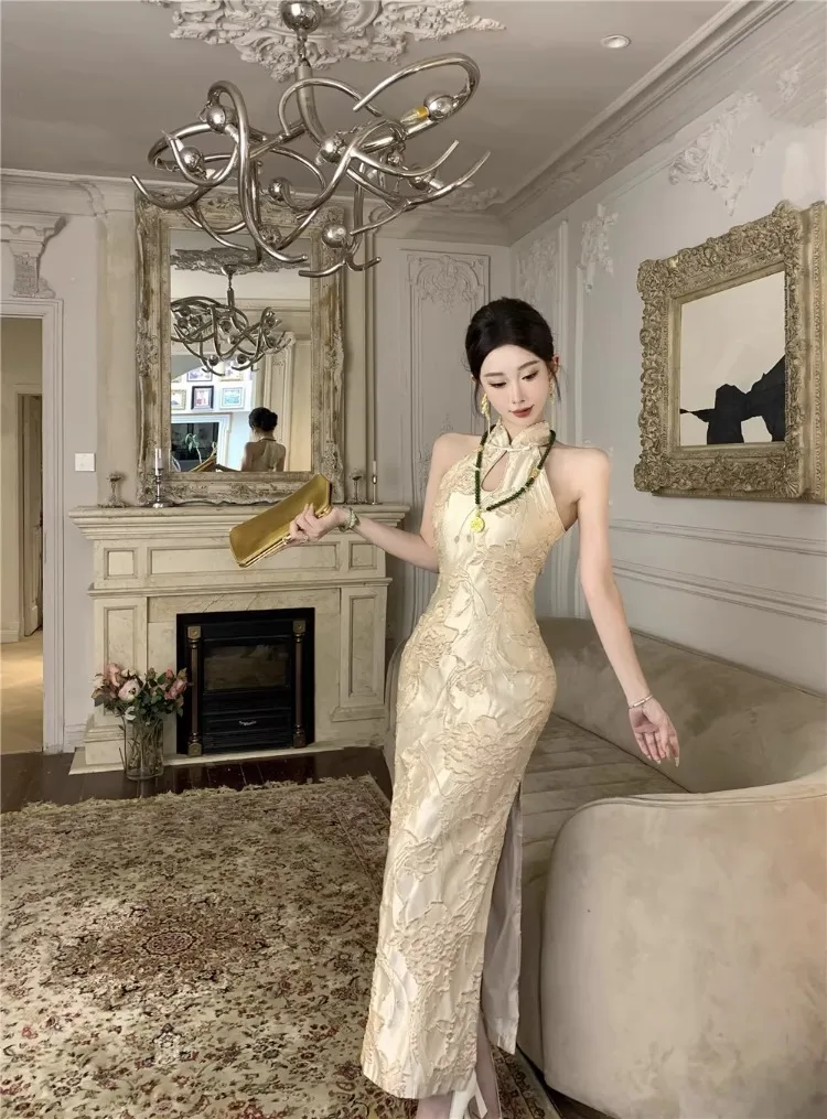 Hnewly Woman Dress Stand Collar Sleeveless Floral Split Sexy Hollow Out Vintage Summer Fashion Temperament Dresses Party
