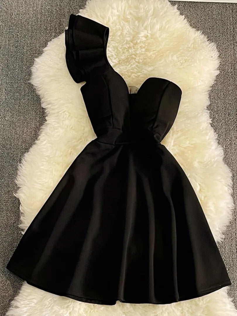 Hnewly Women Black White Ruffled One Shoulder Sleeveless Mini Dress Strapless Mesh Patchwork High Waist A-line Party Dress Vestidos