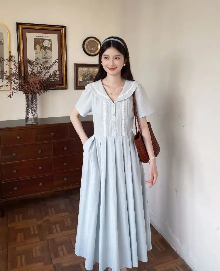 Hnewly Women Dresses Elegant Peter Pan Collar Lace Patchwork Preppy Style Short Sleeve Summer Fashion French Style Female Dress