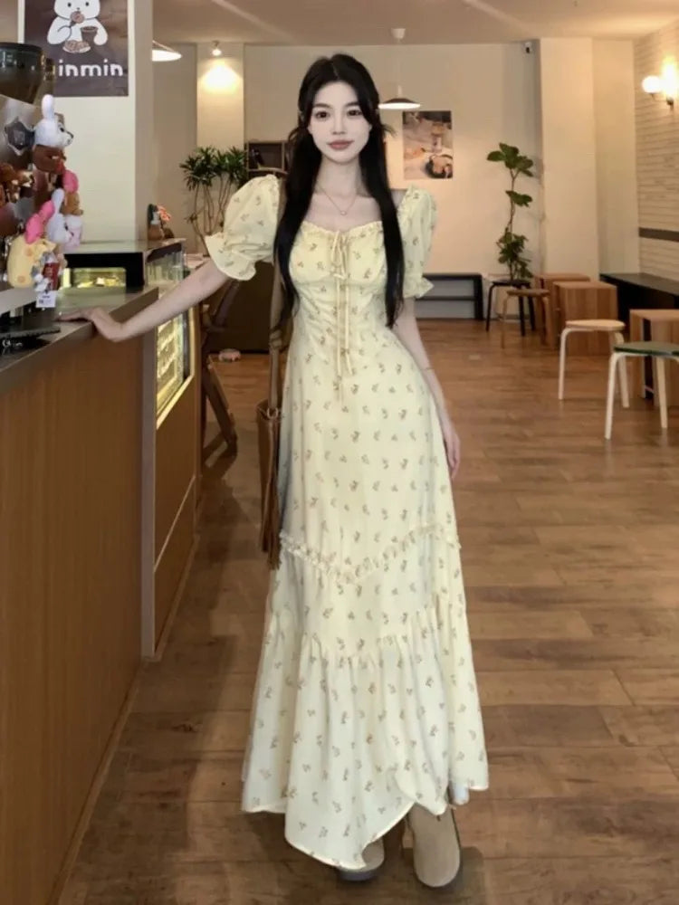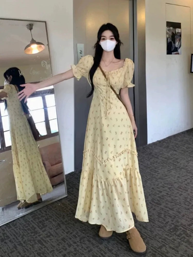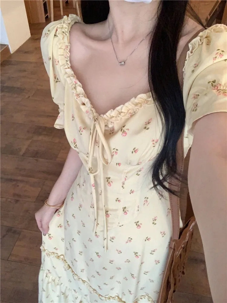 Hnewly Women Dresses Floral Printed Puff Short Sleeve Bandage Summer Fashion Ruffles Square Collar Sweet Elegant Dress Female