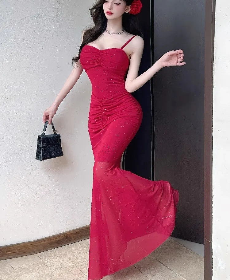 Hnewly Women Dresses Sleeveless Mesh Patchwork Elegant Slash Neck Sexy Fashion Mermaid Dress Party Female French Style