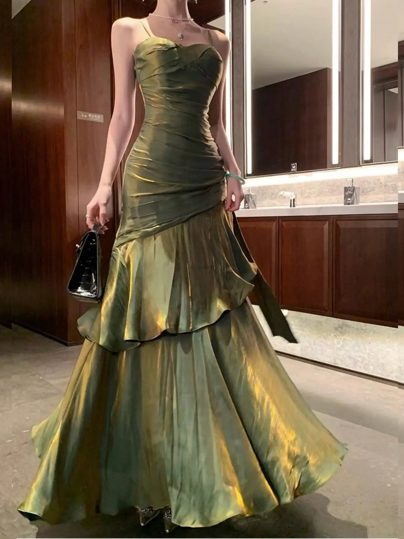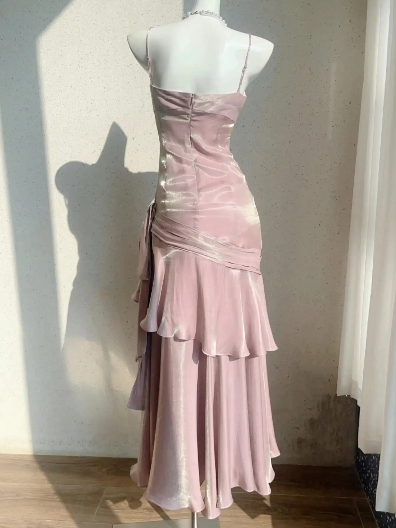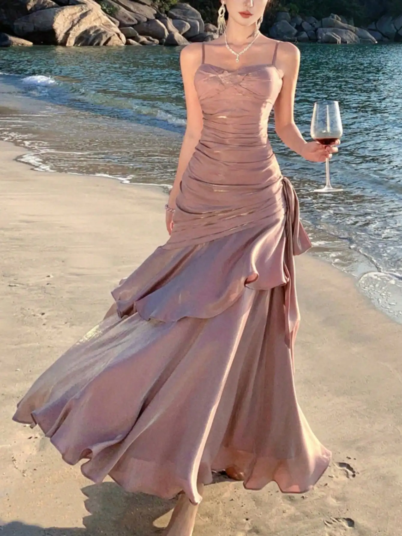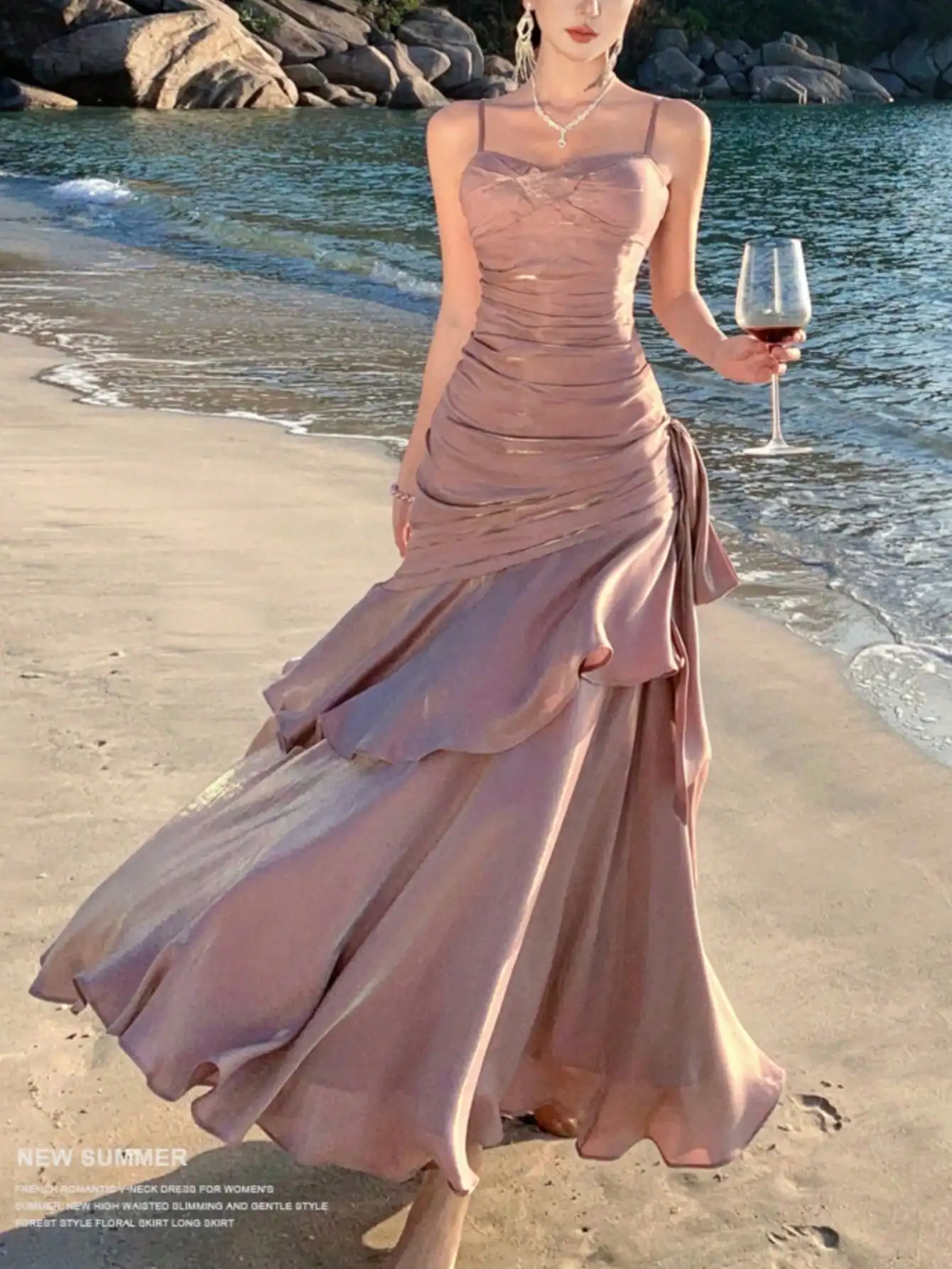 Hnewly Women Elegant Spaghetti Straps Ruffles Graduation Party Dress Slim Waist Wedding Bridesmaid Dresses Festival Formal Clothes New