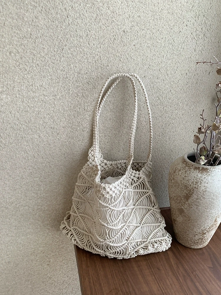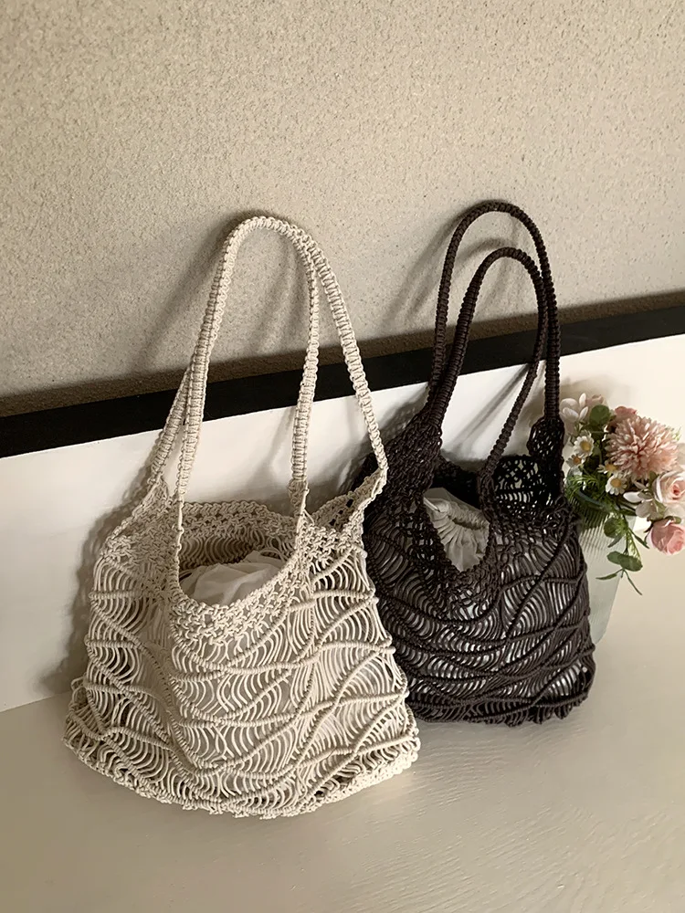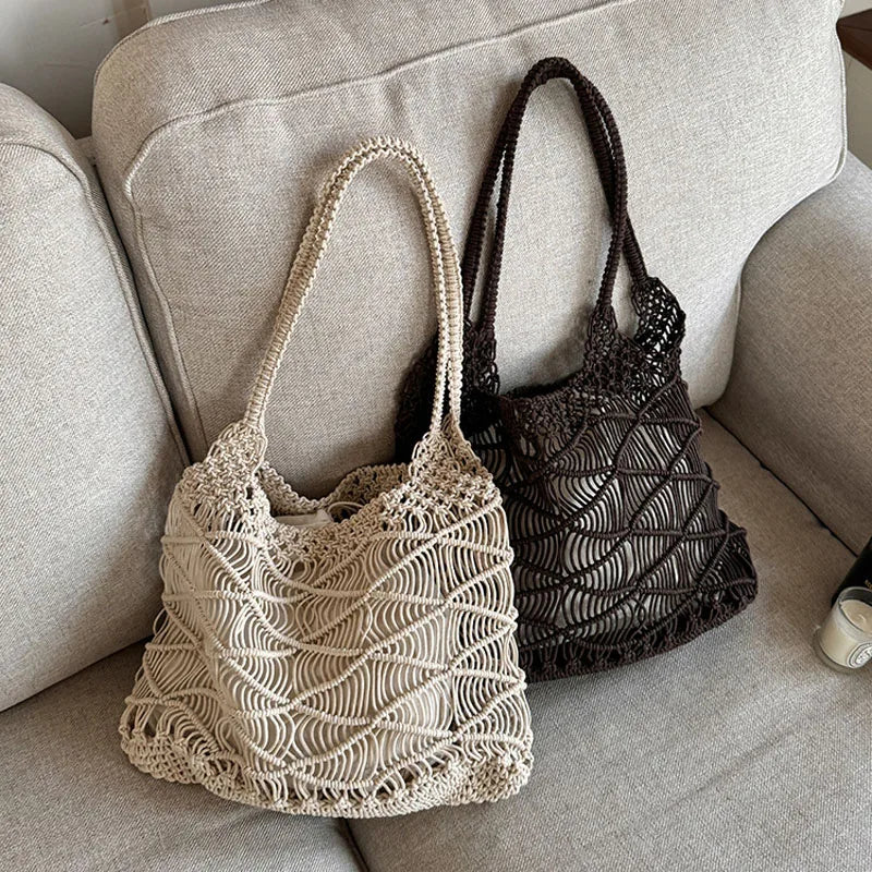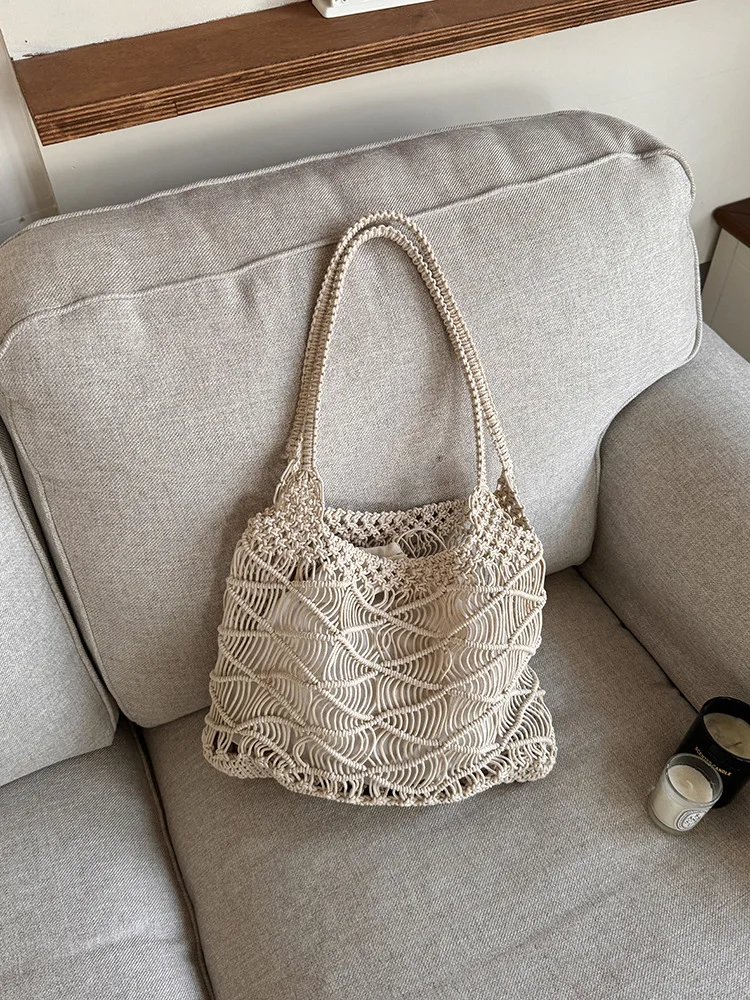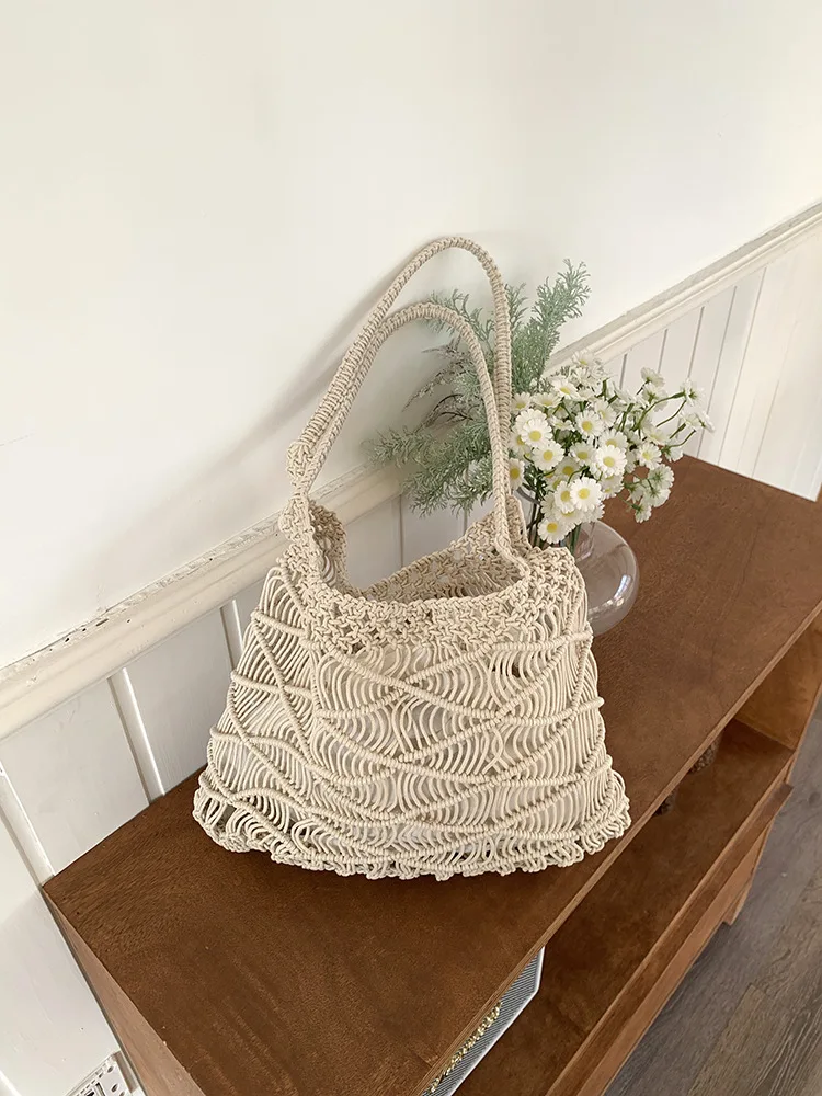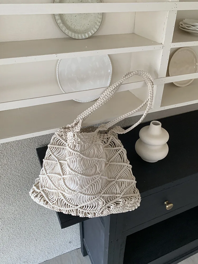 Hnewly Women Handmade Cotton Rope Woven Shoulder Bag Hollowed Out Beach Vacation Tote Handbag