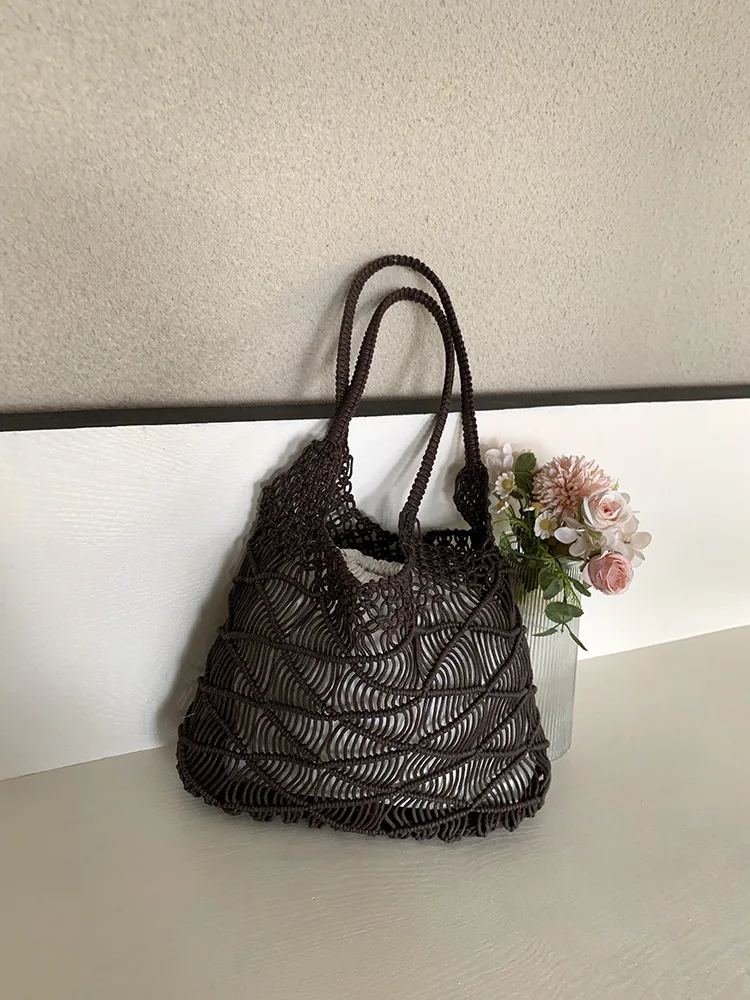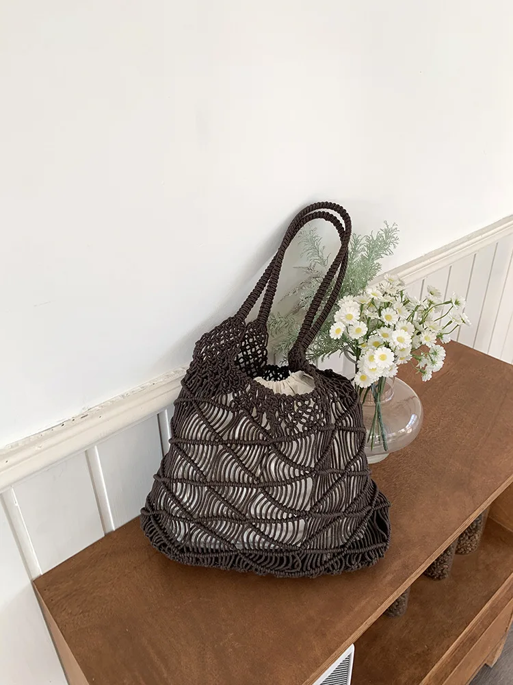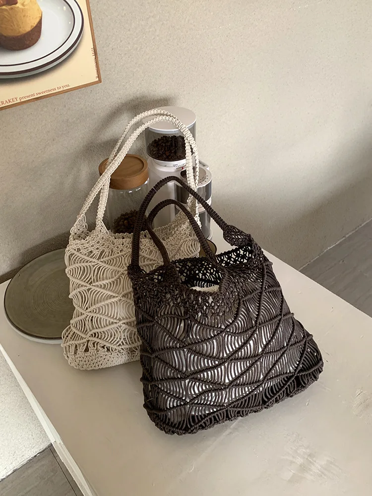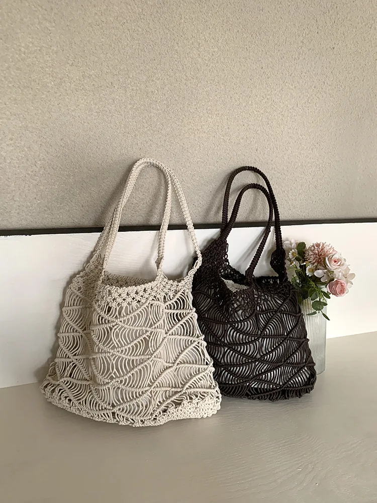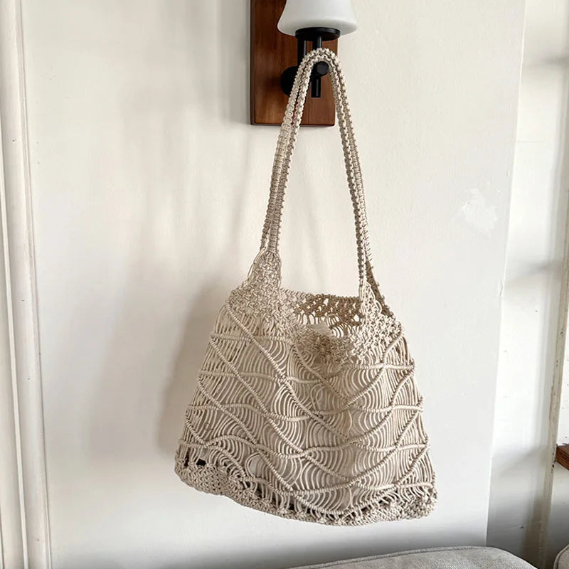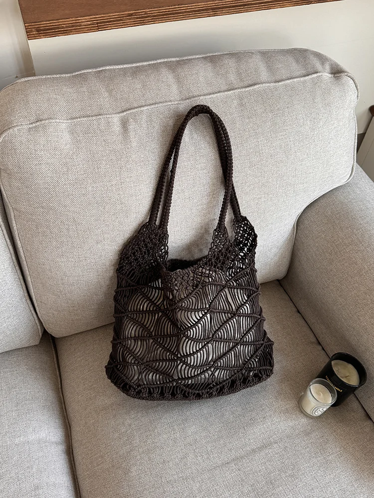 Hnewly Women Handmade Cotton Rope Woven Shoulder Bag Hollowed Out Beach Vacation Tote Handbag