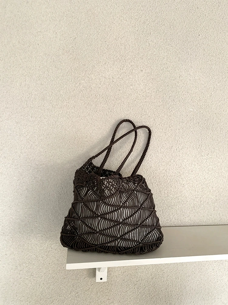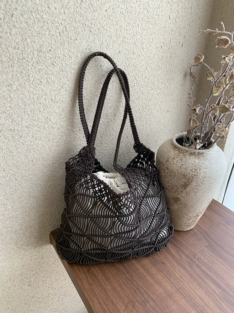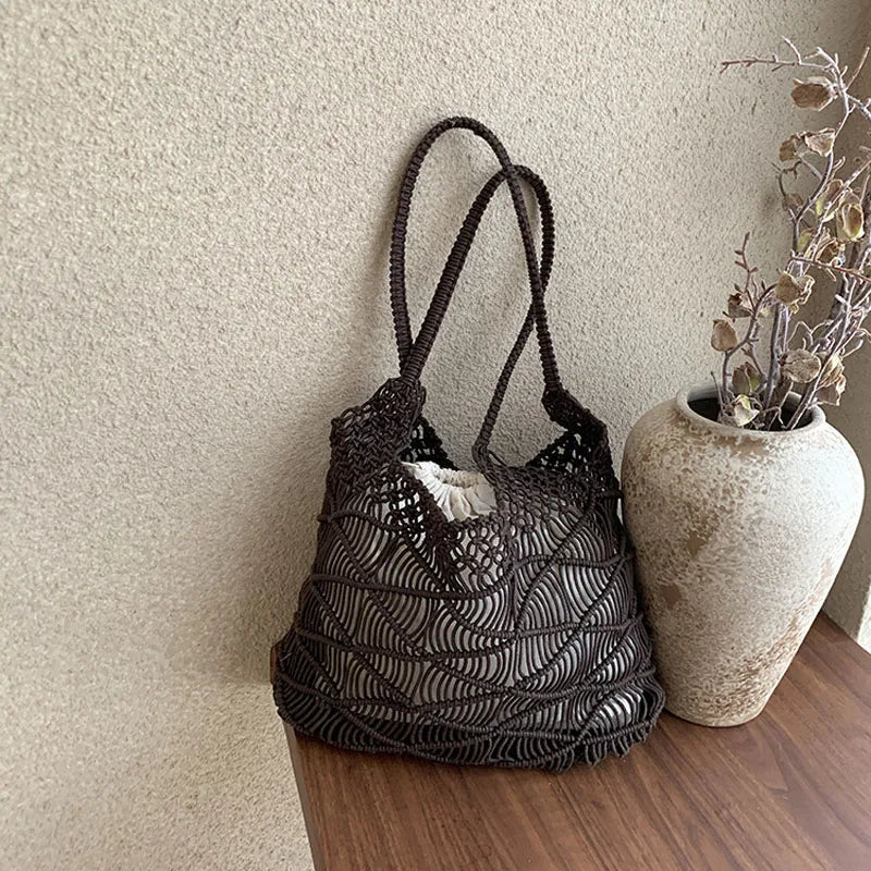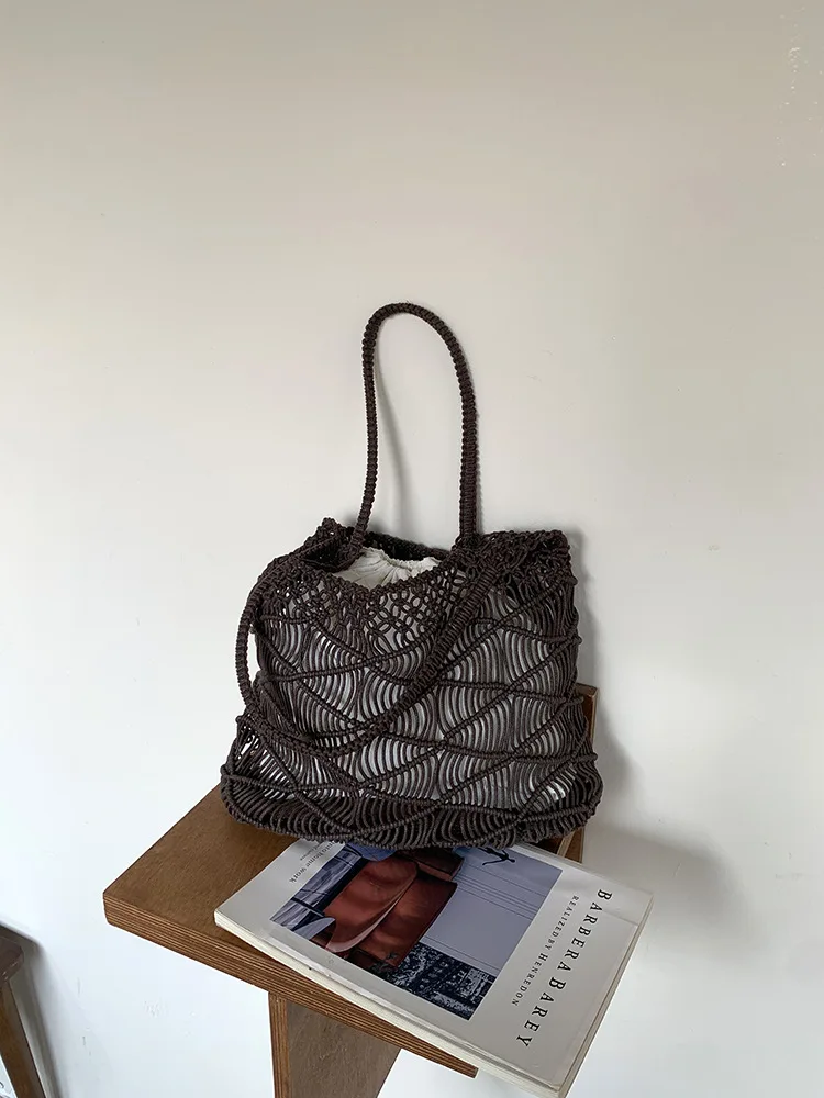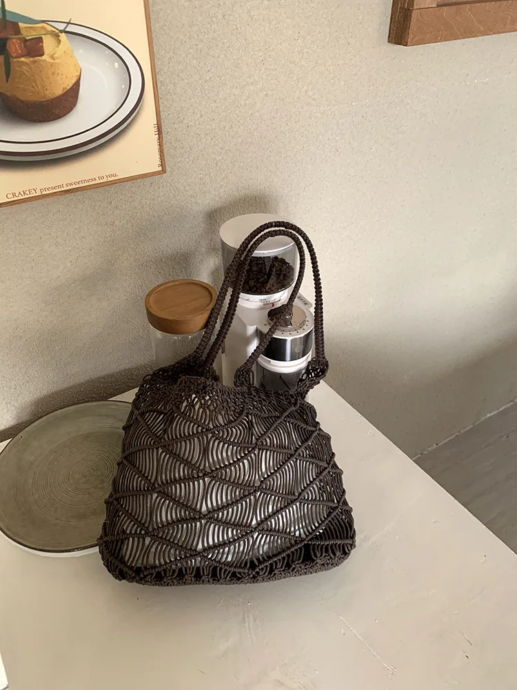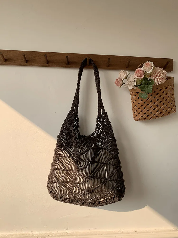 Hnewly Women Handmade Cotton Rope Woven Shoulder Bag Hollowed Out Beach Vacation Tote Handbag