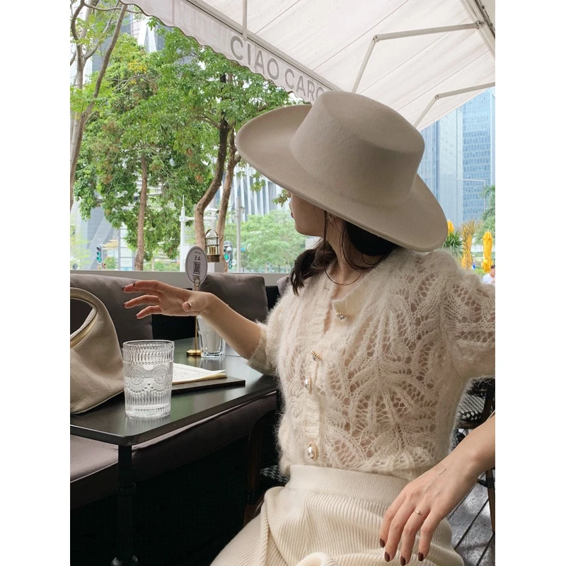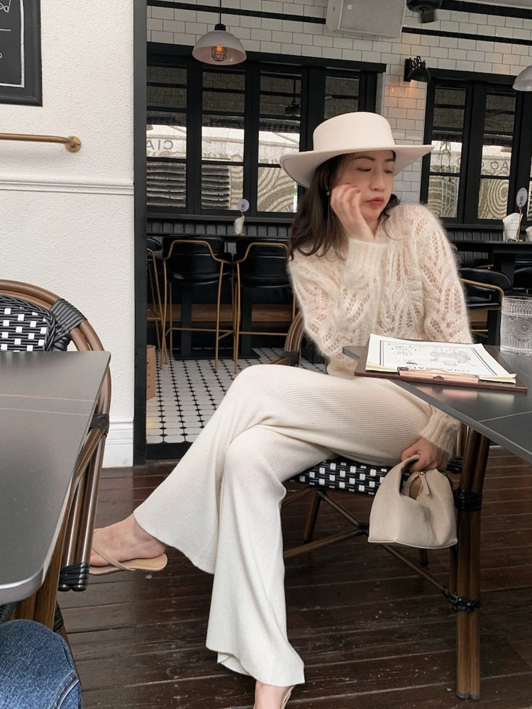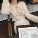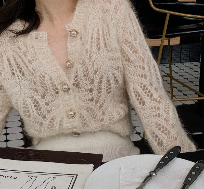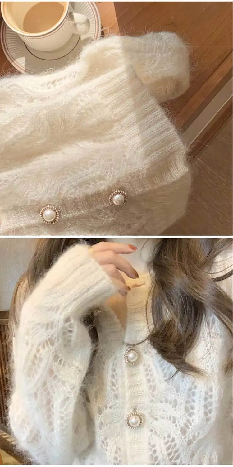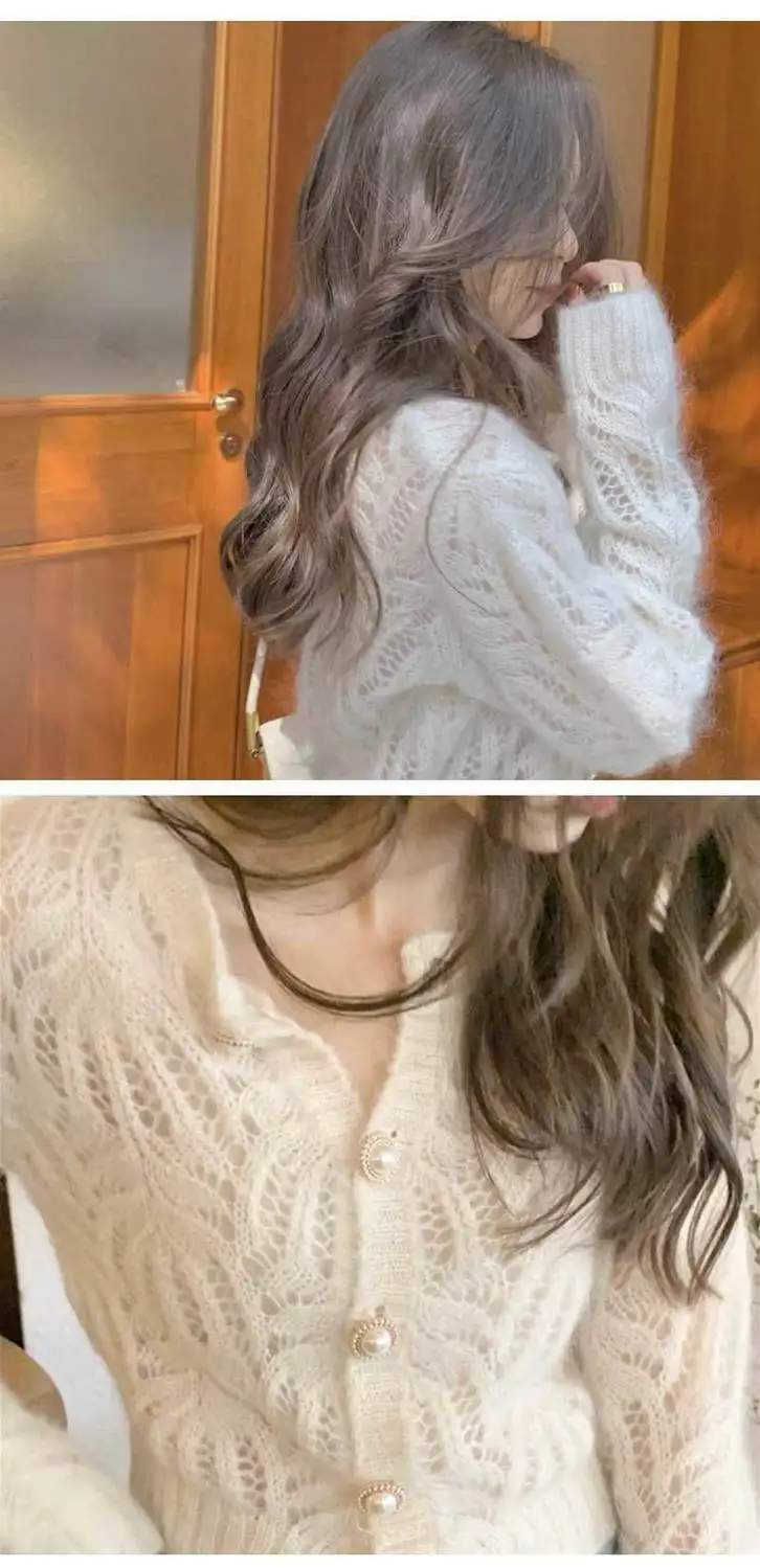 Hnewly Women Hollow Out Fluffy Vintage Button-up Temper Ladies Knitted Sweater Outwear Slouchy All-match Loose Casual Ulzzang