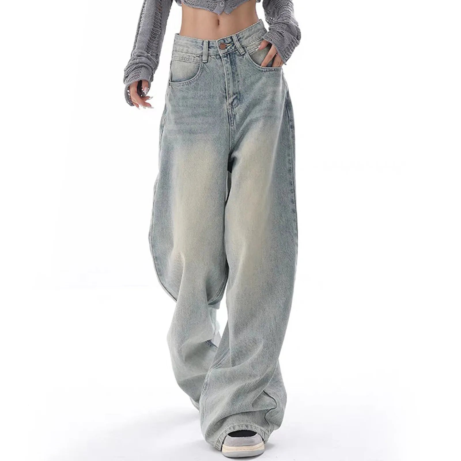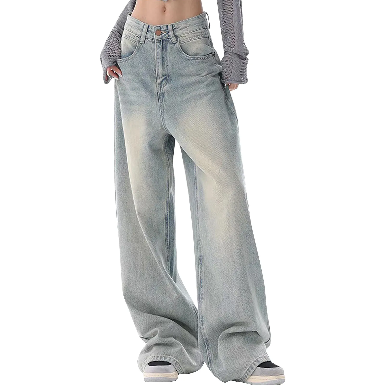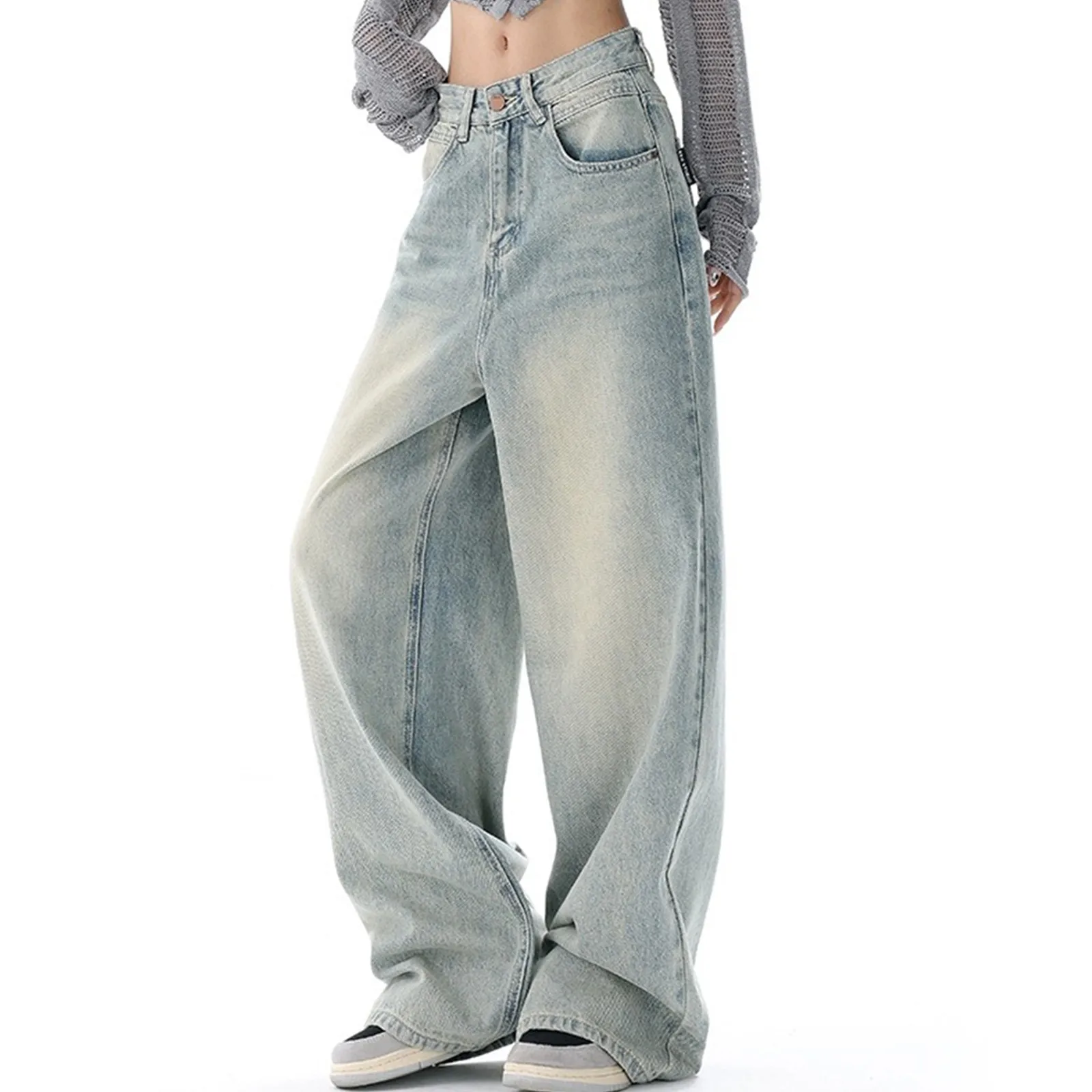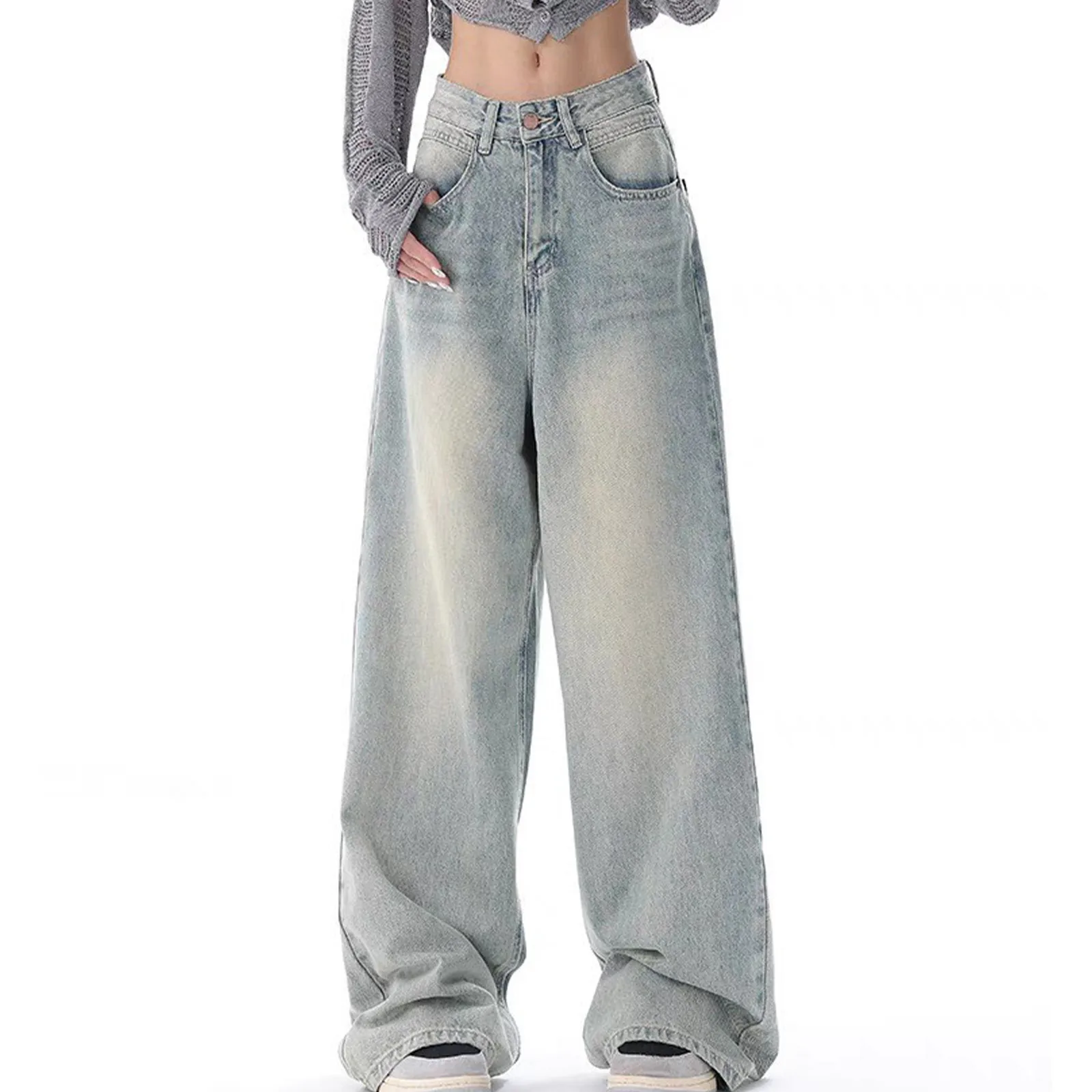 Hnewly Women Korean Style Jeans High Waist Washed Wide Leg Pants Fashion High Street Loose Retro Blue Light Blue Denim Trousers
