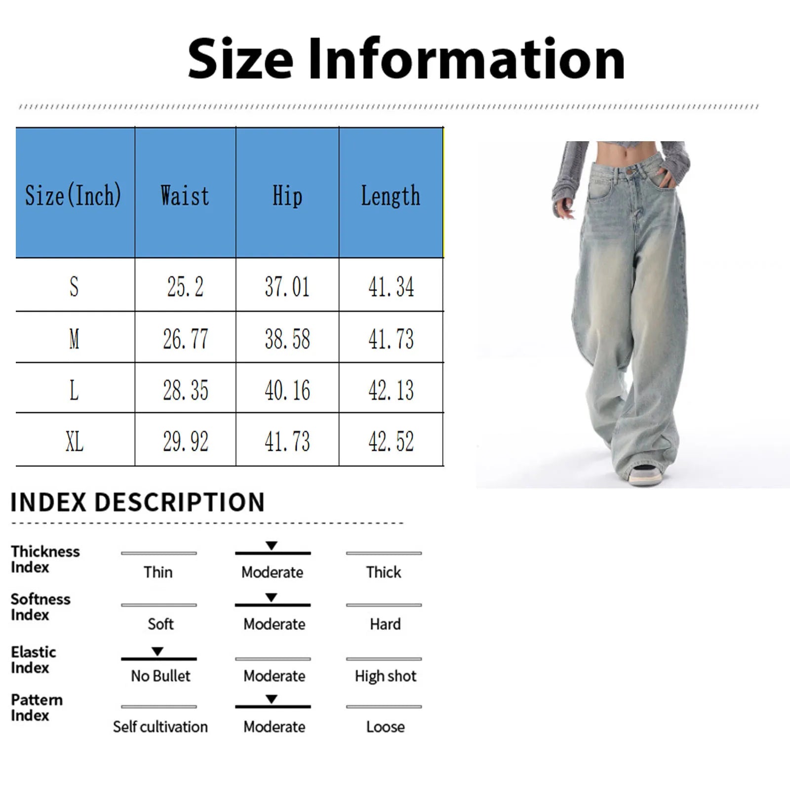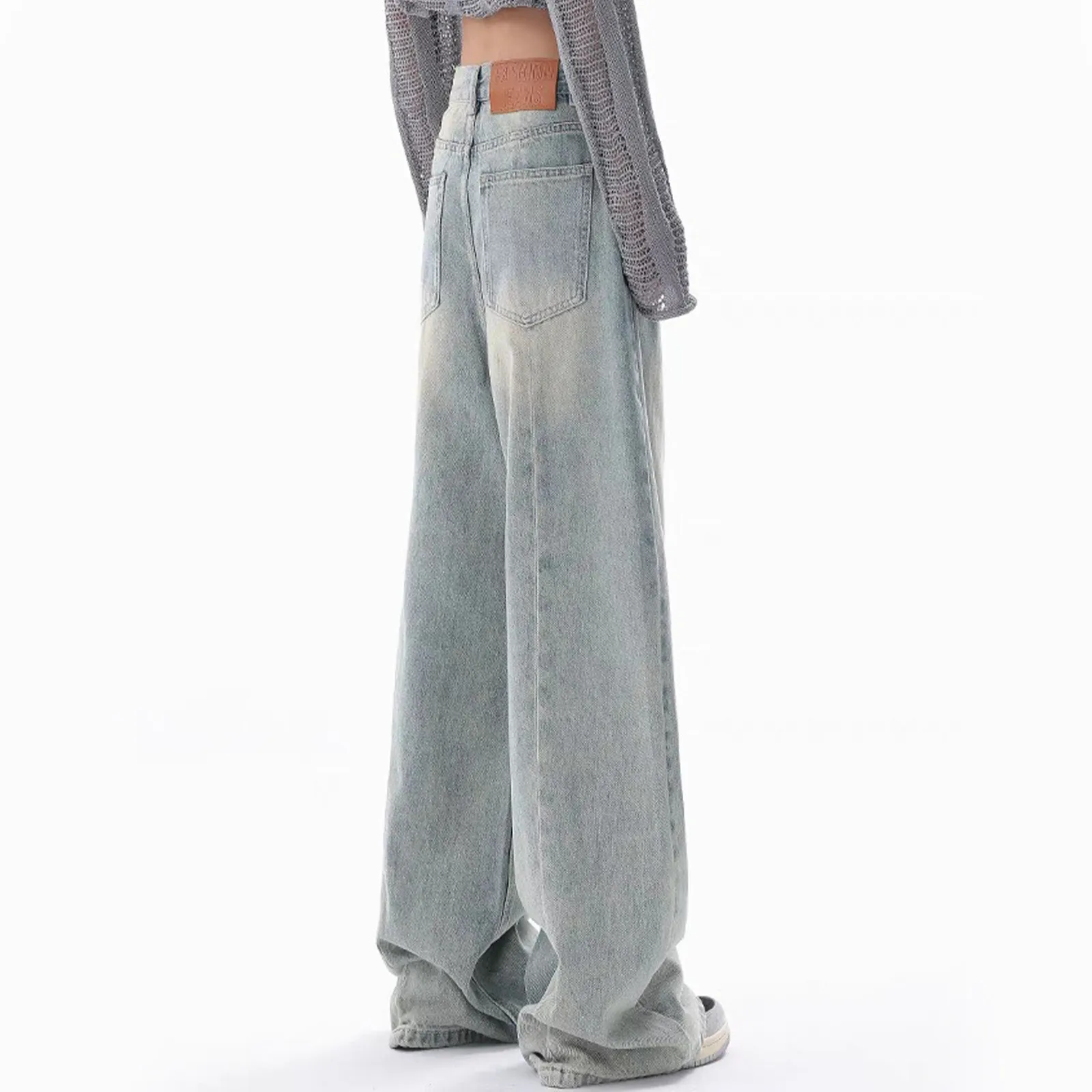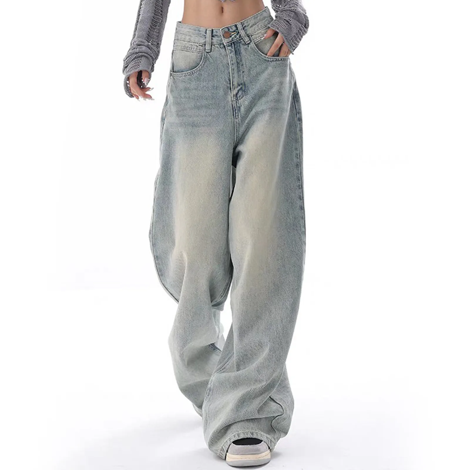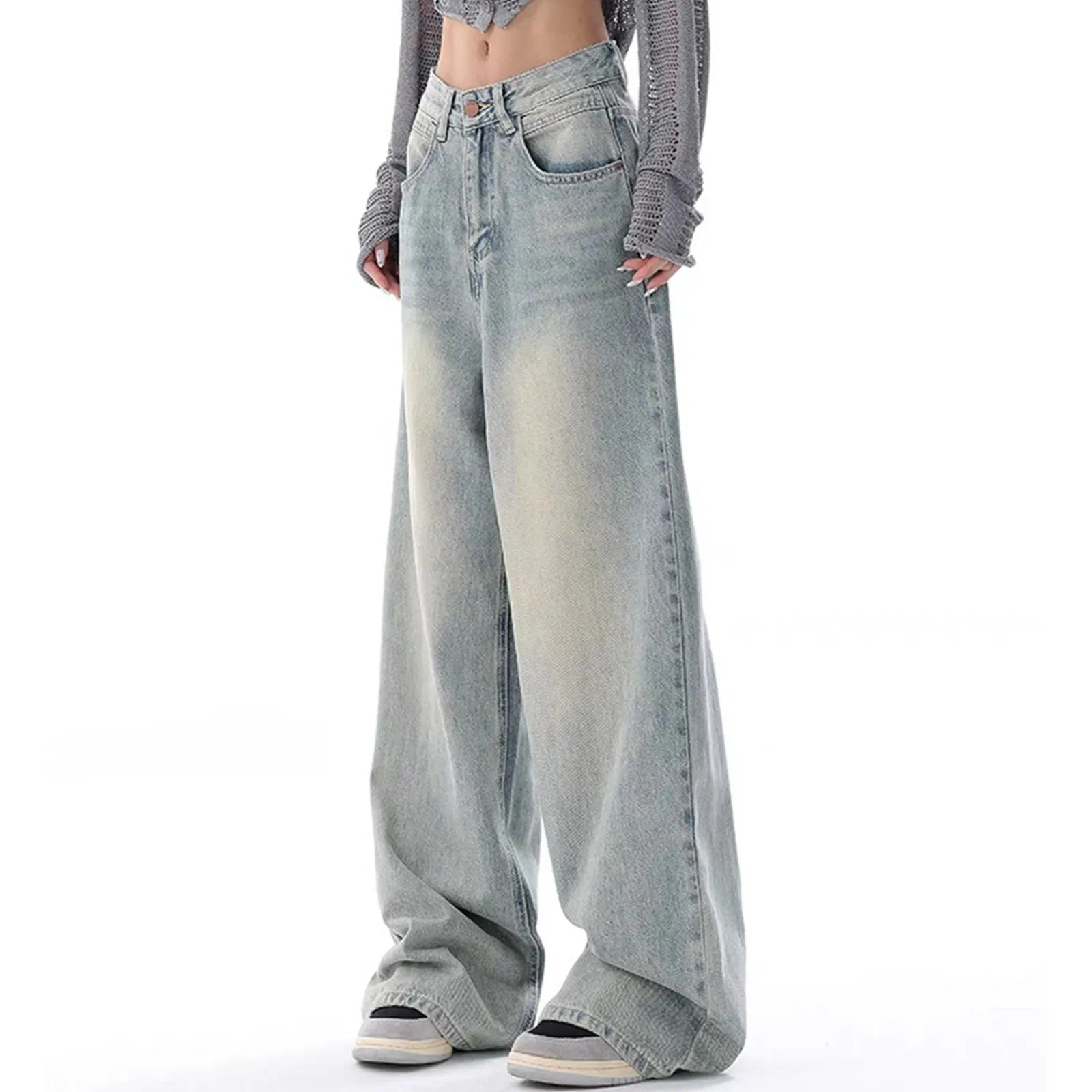 Hnewly Women Korean Style Jeans High Waist Washed Wide Leg Pants Fashion High Street Loose Retro Blue Light Blue Denim Trousers