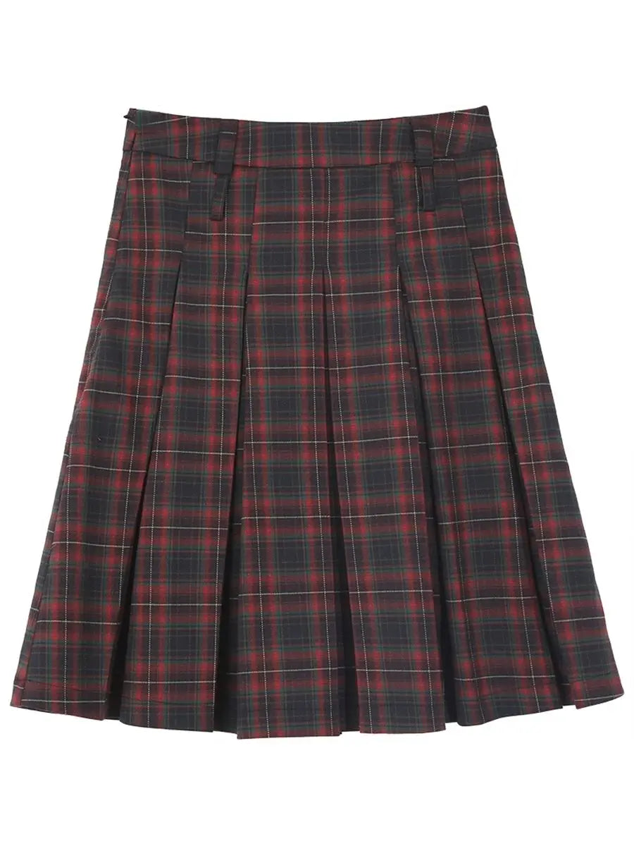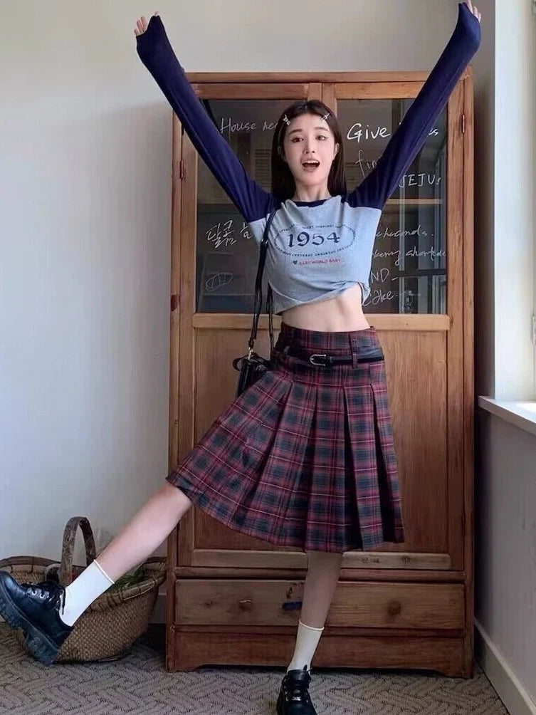 Hnewly Women Pleated Plaid Skirt Vintage Preppy Style Mid Length Skirt Harajuku Korean Fashion Retro Japanese Classic Basic