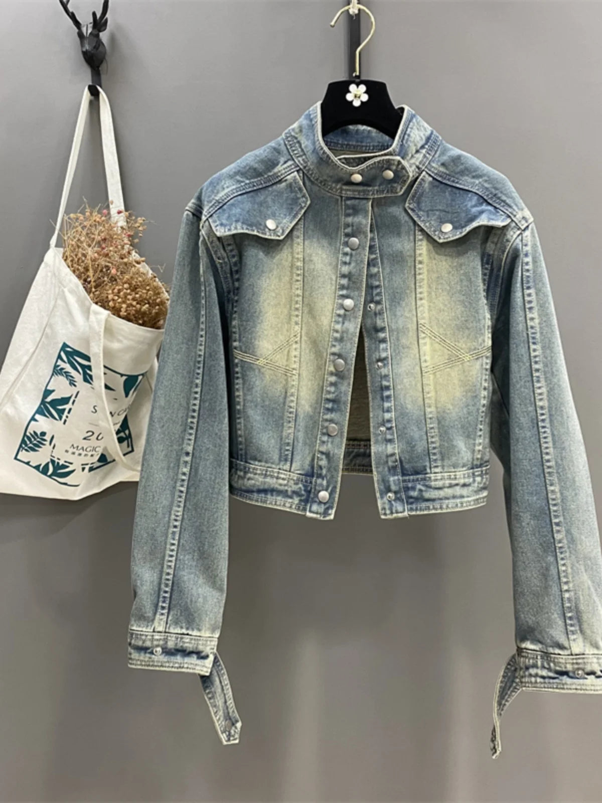 Hnewly Women Standing Collar Denim Short Jacket Washed Polished White Retro Motorcycle Outwear Spring Fashion Slim Long Sleeved Top